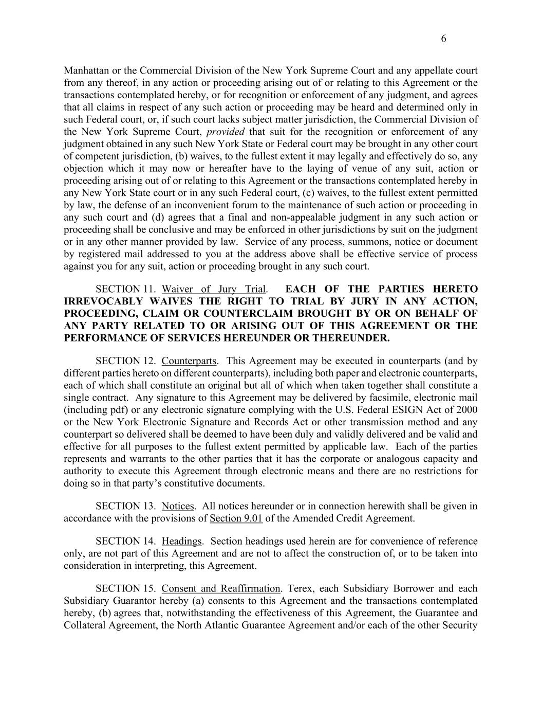 6 Manhattan or the Commercial Division of the New York Supreme Court and any appellate court from any thereof, in any action or proceeding arising out of or relating to this Agreement or the transactions contemplated hereby, or for recognition or enforcement of any judgment, and agrees that all claims in respect of any such action or proceeding may be heard and determined only in such Federal court, or, if such court lacks subject matter jurisdiction, the Commercial Division of the New York Supreme Court, provided that suit for the recognition or enforcement of any judgment obtained in any such New York State or Federal court may be brought in any other court of competent jurisdiction, (b) waives, to the fullest extent it may legally and effectively do so, any objection which it may now or hereafter have to the laying of venue of any suit, action or proceeding arising out of or relating to this Agreement or the transactions contemplated hereby in any New York State court or in any such Federal court, (c) waives, to the fullest extent permitted by law, the defense of an inconvenient forum to the maintenance of such action or proceeding in any such court and (d) agrees that a final and non-appealable judgment in any such action or proceeding shall be conclusive and may be enforced in other jurisdictions by suit on the judgment or in any other manner provided by law. Service of any process, summons, notice or document by registered mail addressed to you at the address above shall be effective service of process against you for any suit, action or proceeding brought in any such court. SECTION 11. Waiver of Jury Trial. EACH OF THE PARTIES HERETO IRREVOCABLY WAIVES THE RIGHT TO TRIAL BY JURY IN ANY ACTION, PROCEEDING, CLAIM OR COUNTERCLAIM BROUGHT BY OR ON BEHALF OF ANY PARTY RELATED TO OR ARISING OUT OF THIS AGREEMENT OR THE PERFORMANCE OF SERVICES HEREUNDER OR THEREUNDER. SECTION 12. Counterparts. This Agreement may be executed in counterparts (and by different parties hereto on different counterparts), including both paper and electronic counterparts, each of which shall constitute an original but all of which when taken together shall constitute a single contract. Any signature to this Agreement may be delivered by facsimile, electronic mail (including pdf) or any electronic signature complying with the U.S. Federal ESIGN Act of 2000 or the New York Electronic Signature and Records Act or other transmission method and any counterpart so delivered shall be deemed to have been duly and validly delivered and be valid and effective for all purposes to the fullest extent permitted by applicable law. Each of the parties represents and warrants to the other parties that it has the corporate or analogous capacity and authority to execute this Agreement through electronic means and there are no restrictions for doing so in that party’s constitutive documents. SECTION 13. Notices. All notices hereunder or in connection herewith shall be given in accordance with the provisions of Section 9.01 of the Amended Credit Agreement. SECTION 14. Headings. Section headings used herein are for convenience of reference only, are not part of this Agreement and are not to affect the construction of, or to be taken into consideration in interpreting, this Agreement. SECTION 15. Consent and Reaffirmation. Terex, each Subsidiary Borrower and each Subsidiary Guarantor hereby (a) consents to this Agreement and the transactions contemplated hereby, (b) agrees that, notwithstanding the effectiveness of this Agreement, the Guarantee and Collateral Agreement, the North Atlantic Guarantee Agreement and/or each of the other Security