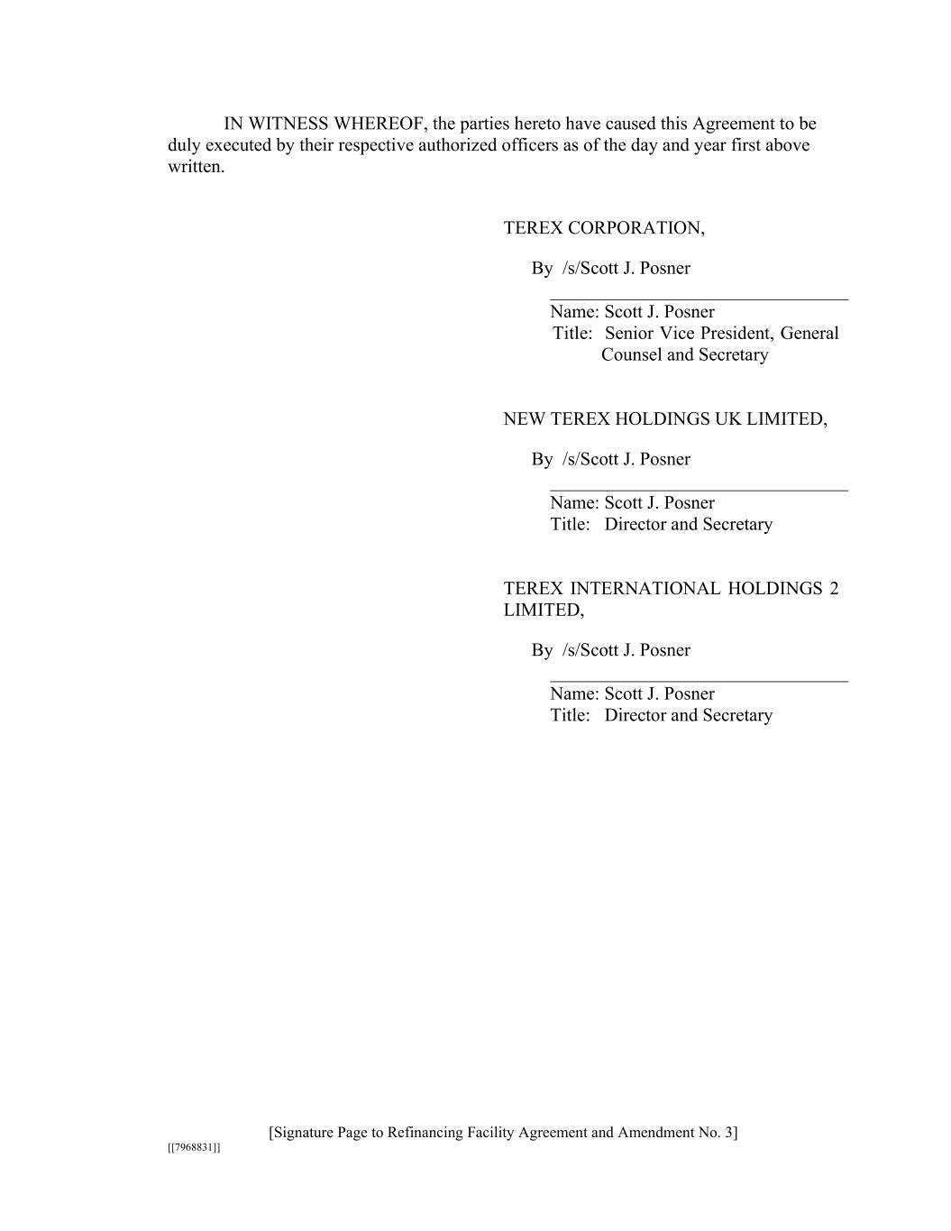 [Signature Page to Refinancing Facility Agreement and Amendment No. 3] [[7968831]] IN WITNESS WHEREOF, the parties hereto have caused this Agreement to be duly executed by their respective authorized officers as of the day and year first above written. TEREX CORPORATION, By /s/Scott J. Posner Name: Scott J. Posner Title: Senior Vice President, General Counsel and Secretary NEW TEREX HOLDINGS UK LIMITED, By /s/Scott J. Posner Name: Scott J. Posner Title: Director and Secretary TEREX INTERNATIONAL HOLDINGS 2 LIMITED, By /s/Scott J. Posner Name: Scott J. Posner Title: Director and Secretary