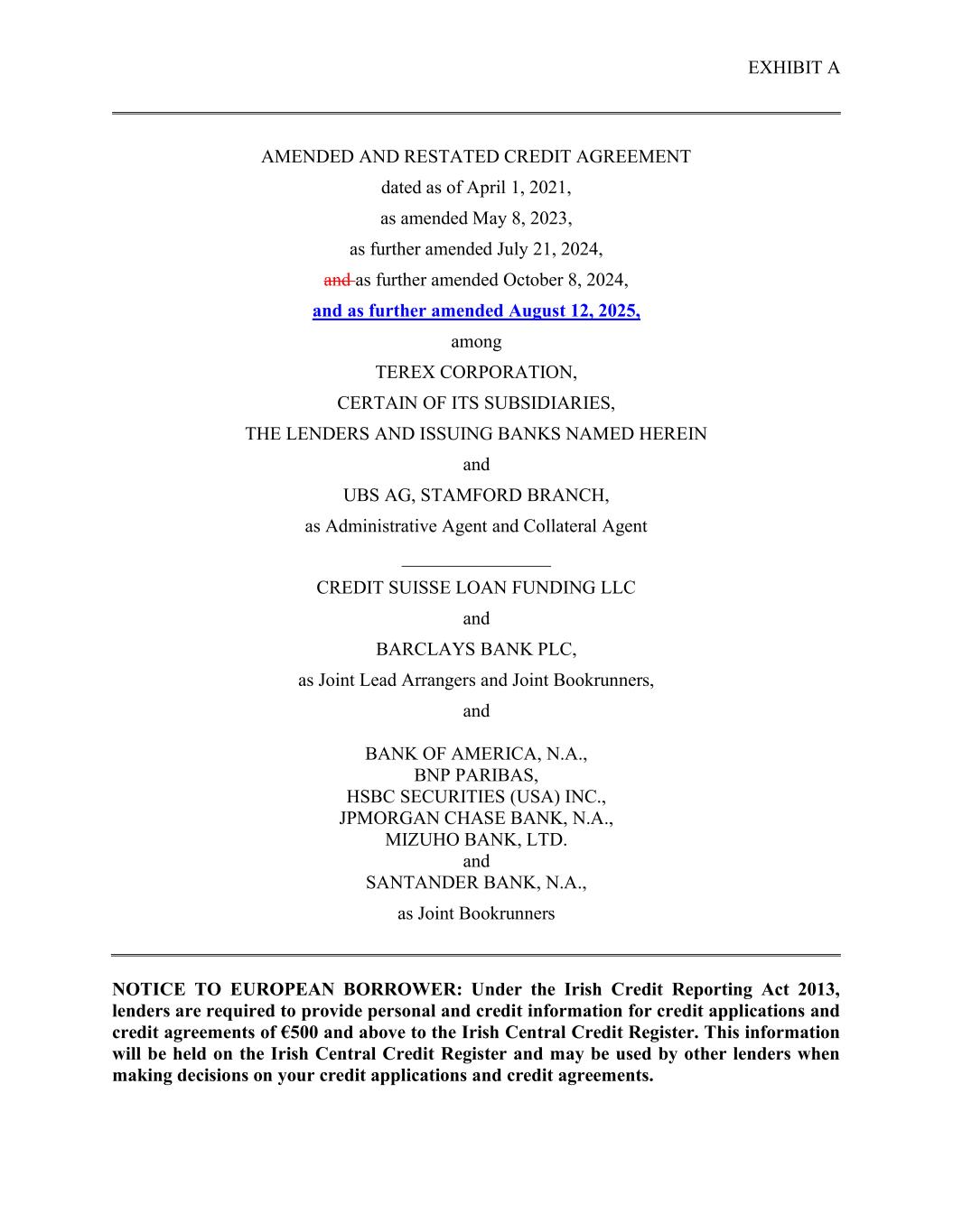 EXHIBIT A AMENDED AND RESTATED CREDIT AGREEMENT dated as of April 1, 2021, as amended May 8, 2023, as further amended July 21, 2024, and as further amended October 8, 2024, and as further amended August 12, 2025, among TEREX CORPORATION, CERTAIN OF ITS SUBSIDIARIES, THE LENDERS AND ISSUING BANKS NAMED HEREIN and UBS AG, STAMFORD BRANCH, as Administrative Agent and Collateral Agent ________________ CREDIT SUISSE LOAN FUNDING LLC and BARCLAYS BANK PLC, as Joint Lead Arrangers and Joint Bookrunners, and BANK OF AMERICA, N.A., BNP PARIBAS, HSBC SECURITIES (USA) INC., JPMORGAN CHASE BANK, N.A., MIZUHO BANK, LTD. and SANTANDER BANK, N.A., as Joint Bookrunners NOTICE TO EUROPEAN BORROWER: Under the Irish Credit Reporting Act 2013, lenders are required to provide personal and credit information for credit applications and credit agreements of €500 and above to the Irish Central Credit Register. This information will be held on the Irish Central Credit Register and may be used by other lenders when making decisions on your credit applications and credit agreements.