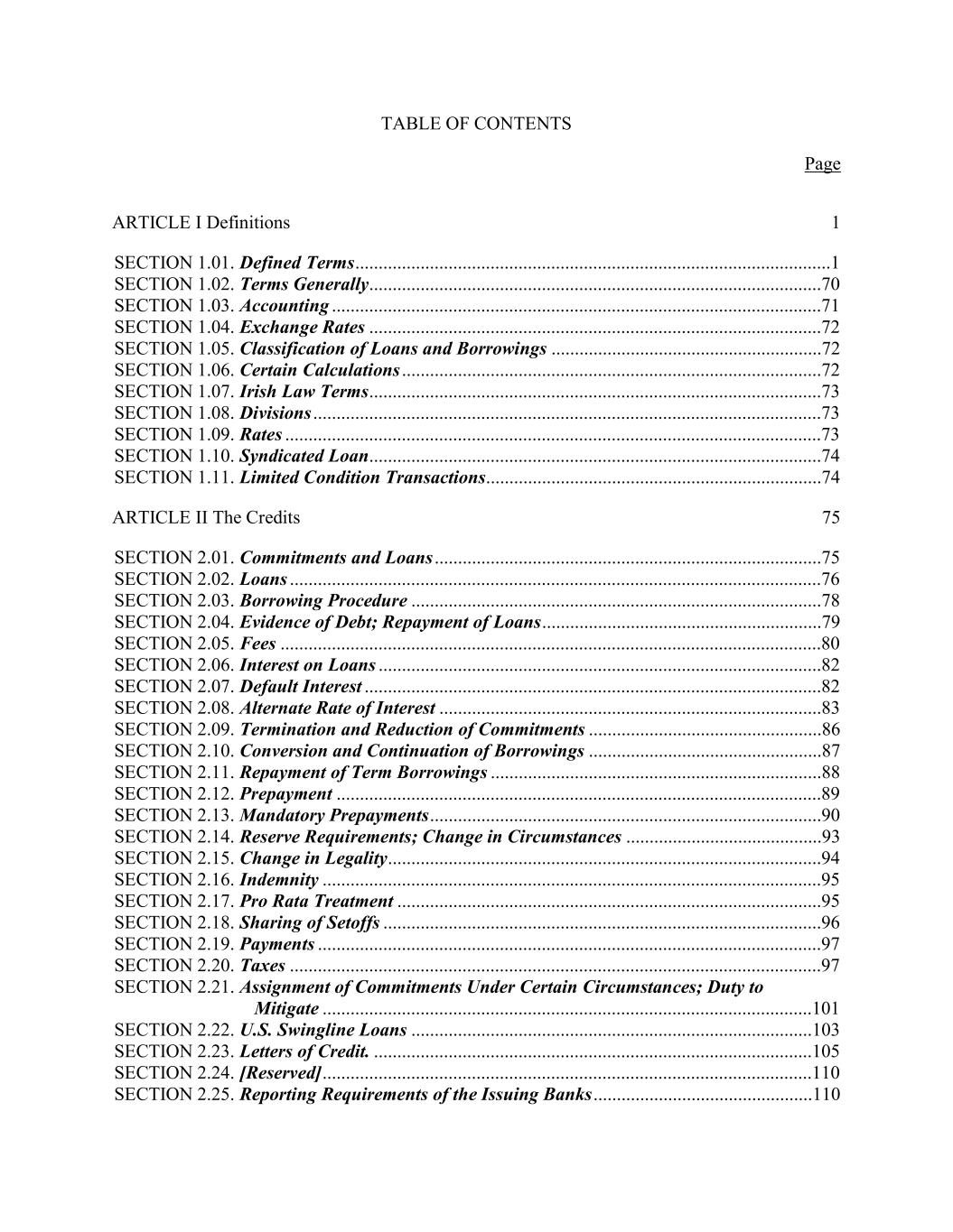 TABLE OF CONTENTS Page ARTICLE I Definitions 1 SECTION 1.01. Defined Terms ......................................................................................................1 SECTION 1.02. Terms Generally.................................................................................................70 SECTION 1.03. Accounting .........................................................................................................71 SECTION 1.04. Exchange Rates .................................................................................................72 SECTION 1.05. Classification of Loans and Borrowings ..........................................................72 SECTION 1.06. Certain Calculations ..........................................................................................72 SECTION 1.07. Irish Law Terms .................................................................................................73 SECTION 1.08. Divisions .............................................................................................................73 SECTION 1.09. Rates ...................................................................................................................73 SECTION 1.10. Syndicated Loan.................................................................................................74 SECTION 1.11. Limited Condition Transactions........................................................................74 ARTICLE II The Credits 75 SECTION 2.01. Commitments and Loans ...................................................................................75 SECTION 2.02. Loans ..................................................................................................................76 SECTION 2.03. Borrowing Procedure ........................................................................................78 SECTION 2.04. Evidence of Debt; Repayment of Loans ............................................................79 SECTION 2.05. Fees ....................................................................................................................80 SECTION 2.06. Interest on Loans ...............................................................................................82 SECTION 2.07. Default Interest ..................................................................................................82 SECTION 2.08. Alternate Rate of Interest ..................................................................................83 SECTION 2.09. Termination and Reduction of Commitments ..................................................86 SECTION 2.10. Conversion and Continuation of Borrowings ..................................................87 SECTION 2.11. Repayment of Term Borrowings .......................................................................88 SECTION 2.12. Prepayment ........................................................................................................89 SECTION 2.13. Mandatory Prepayments ....................................................................................90 SECTION 2.14. Reserve Requirements; Change in Circumstances ..........................................93 SECTION 2.15. Change in Legality .............................................................................................94 SECTION 2.16. Indemnity ...........................................................................................................95 SECTION 2.17. Pro Rata Treatment ...........................................................................................95 SECTION 2.18. Sharing of Setoffs ..............................................................................................96 SECTION 2.19. Payments ............................................................................................................97 SECTION 2.20. Taxes ..................................................................................................................97 SECTION 2.21. Assignment of Commitments Under Certain Circumstances; Duty to Mitigate .........................................................................................................101 SECTION 2.22. U.S. Swingline Loans ......................................................................................103 SECTION 2.23. Letters of Credit. ..............................................................................................105 SECTION 2.24. [Reserved] .........................................................................................................110 SECTION 2.25. Reporting Requirements of the Issuing Banks ...............................................110