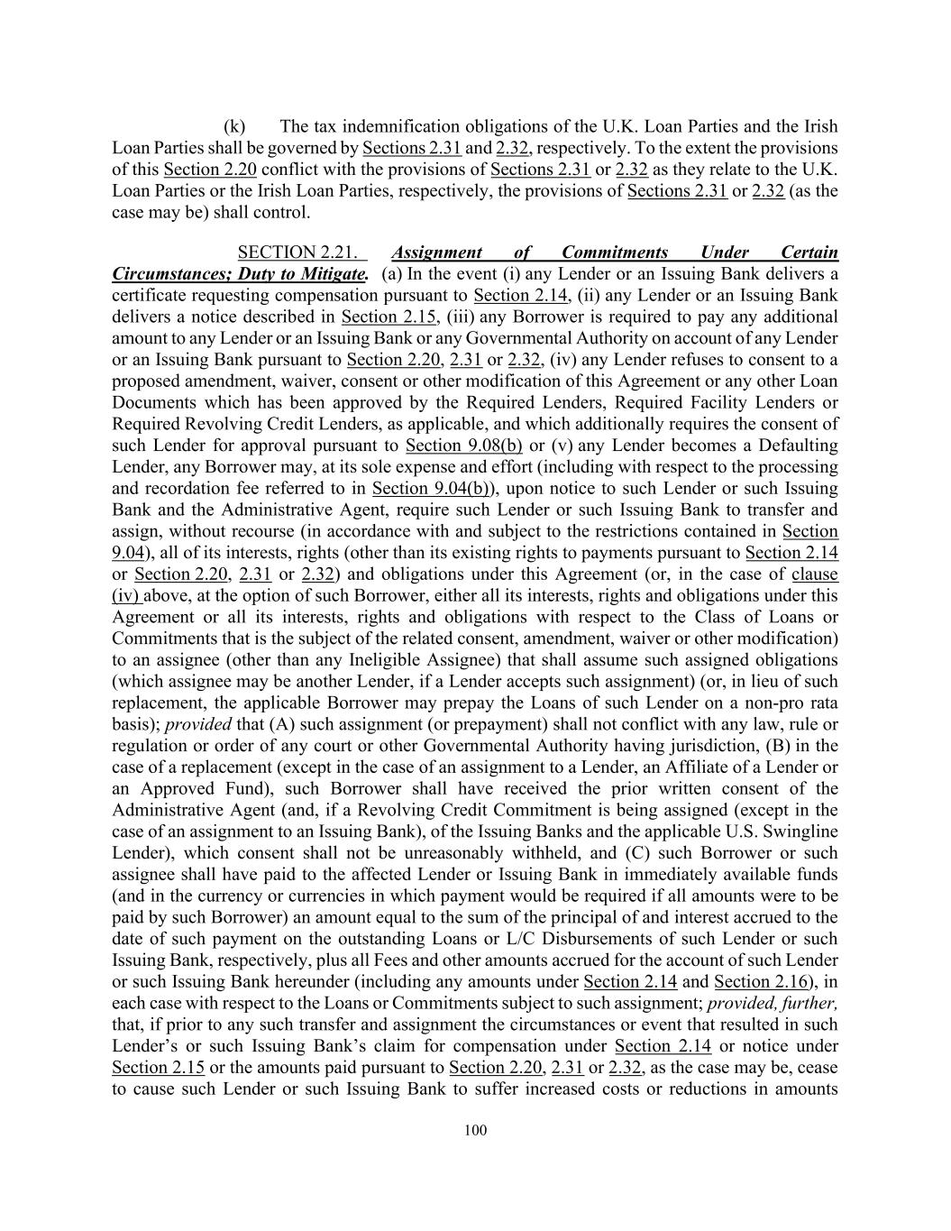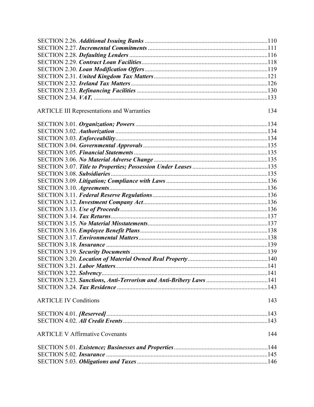 SECTION 2.26. Additional Issuing Banks ................................................................................110 SECTION 2.27. Incremental Commitments ..............................................................................111 SECTION 2.28. Defaulting Lenders ..........................................................................................116 SECTION 2.29. Contract Loan Facilities ..................................................................................118 SECTION 2.30. Loan Modification Offers ................................................................................119 SECTION 2.31. United Kingdom Tax Matters ..........................................................................121 SECTION 2.32. Ireland Tax Matters .........................................................................................126 SECTION 2.33. Refinancing Facilities .....................................................................................130 SECTION 2.34. VAT. .................................................................................................................133 ARTICLE III Representations and Warranties 134 SECTION 3.01. Organization; Powers ......................................................................................134 SECTION 3.02. Authorization ...................................................................................................134 SECTION 3.03. Enforceability ...................................................................................................134 SECTION 3.04. Governmental Approvals .................................................................................135 SECTION 3.05. Financial Statements .......................................................................................135 SECTION 3.06. No Material Adverse Change ..........................................................................135 SECTION 3.07. Title to Properties; Possession Under Leases .................................................135 SECTION 3.08. Subsidiaries ......................................................................................................135 SECTION 3.09. Litigation; Compliance with Laws ..................................................................136 SECTION 3.10. Agreements .......................................................................................................136 SECTION 3.11. Federal Reserve Regulations ...........................................................................136 SECTION 3.12. Investment Company Act .................................................................................136 SECTION 3.13. Use of Proceeds ................................................................................................136 SECTION 3.14. Tax Returns ......................................................................................................137 SECTION 3.15. No Material Misstatements..............................................................................137 SECTION 3.16. Employee Benefit Plans ...................................................................................138 SECTION 3.17. Environmental Matters ....................................................................................138 SECTION 3.18. Insurance .........................................................................................................139 SECTION 3.19. Security Documents .........................................................................................139 SECTION 3.20. Location of Material Owned Real Property ....................................................140 SECTION 3.21. Labor Matters...................................................................................................141 SECTION 3.22. Solvency ............................................................................................................141 SECTION 3.23. Sanctions, Anti-Terrorism and Anti-Bribery Laws ........................................141 SECTION 3.24. Tax Residence ..................................................................................................143 ARTICLE IV Conditions 143 SECTION 4.01. [Reserved] .........................................................................................................143 SECTION 4.02. All Credit Events ..............................................................................................143 ARTICLE V Affirmative Covenants 144 SECTION 5.01. Existence; Businesses and Properties .............................................................144 SECTION 5.02. Insurance .........................................................................................................145 SECTION 5.03. Obligations and Taxes .....................................................................................146