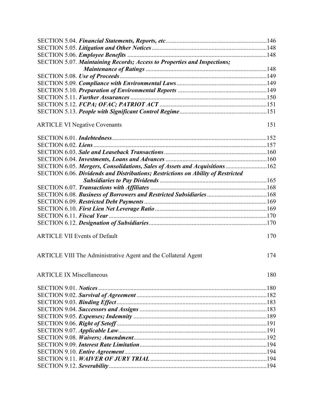 SECTION 5.04. Financial Statements, Reports, etc ..................................................................146 SECTION 5.05. Litigation and Other Notices ...........................................................................148 SECTION 5.06. Employee Benefits ...........................................................................................148 SECTION 5.07. Maintaining Records; Access to Properties and Inspections; Maintenance of Ratings ...............................................................................148 SECTION 5.08. Use of Proceeds ................................................................................................149 SECTION 5.09. Compliance with Environmental Laws ...........................................................149 SECTION 5.10. Preparation of Environmental Reports ..........................................................149 SECTION 5.11. Further Assurances .........................................................................................150 SECTION 5.12. FCPA; OFAC; PATRIOT ACT ......................................................................151 SECTION 5.13. People with Significant Control Regime .........................................................151 ARTICLE VI Negative Covenants 151 SECTION 6.01. Indebtedness .....................................................................................................152 SECTION 6.02. Liens .................................................................................................................157 SECTION 6.03. Sale and Leaseback Transactions ...................................................................160 SECTION 6.04. Investments, Loans and Advances ..................................................................160 SECTION 6.05. Mergers, Consolidations, Sales of Assets and Acquisitions ...........................162 SECTION 6.06. Dividends and Distributions; Restrictions on Ability of Restricted Subsidiaries to Pay Dividends ......................................................................165 SECTION 6.07. Transactions with Affiliates ............................................................................168 SECTION 6.08. Business of Borrowers and Restricted Subsidiaries .......................................168 SECTION 6.09. Restricted Debt Payments ................................................................................169 SECTION 6.10. First Lien Net Leverage Ratio .........................................................................169 SECTION 6.11. Fiscal Year .......................................................................................................170 SECTION 6.12. Designation of Subsidiaries .............................................................................170 ARTICLE VII Events of Default 170 ARTICLE VIII The Administrative Agent and the Collateral Agent 174 ARTICLE IX Miscellaneous 180 SECTION 9.01. Notices ..............................................................................................................180 SECTION 9.02. Survival of Agreement .....................................................................................182 SECTION 9.03. Binding Effect ..................................................................................................183 SECTION 9.04. Successors and Assigns ...................................................................................183 SECTION 9.05. Expenses; Indemnity .......................................................................................189 SECTION 9.06. Right of Setoff ..................................................................................................191 SECTION 9.07. Applicable Law.................................................................................................191 SECTION 9.08. Waivers; Amendment.......................................................................................192 SECTION 9.09. Interest Rate Limitation ...................................................................................194 SECTION 9.10. Entire Agreement .............................................................................................194 SECTION 9.11. WAIVER OF JURY TRIAL ............................................................................194 SECTION 9.12. Severability .......................................................................................................194