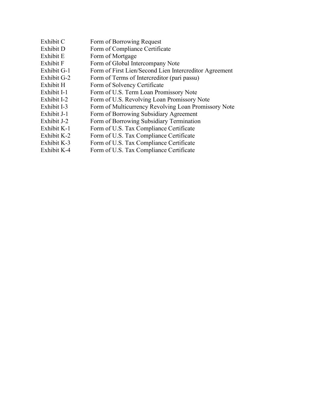 Exhibit C Form of Borrowing Request Exhibit D Form of Compliance Certificate Exhibit E Form of Mortgage Exhibit F Form of Global Intercompany Note Exhibit G-1 Form of First Lien/Second Lien Intercreditor Agreement Exhibit G-2 Form of Terms of Intercreditor (pari passu) Exhibit H Form of Solvency Certificate Exhibit I-1 Form of U.S. Term Loan Promissory Note Exhibit I-2 Form of U.S. Revolving Loan Promissory Note Exhibit I-3 Form of Multicurrency Revolving Loan Promissory Note Exhibit J-1 Form of Borrowing Subsidiary Agreement Exhibit J-2 Form of Borrowing Subsidiary Termination Exhibit K-1 Form of U.S. Tax Compliance Certificate Exhibit K-2 Form of U.S. Tax Compliance Certificate Exhibit K-3 Form of U.S. Tax Compliance Certificate Exhibit K-4 Form of U.S. Tax Compliance Certificate
