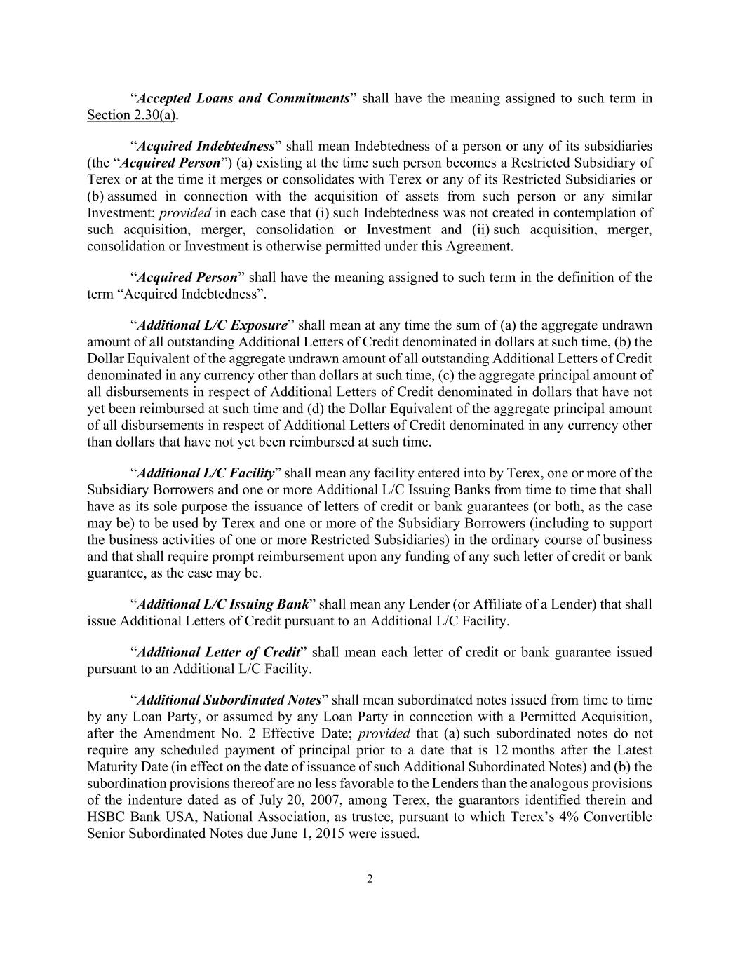 2 “Accepted Loans and Commitments” shall have the meaning assigned to such term in Section 2.30(a). “Acquired Indebtedness” shall mean Indebtedness of a person or any of its subsidiaries (the “Acquired Person”) (a) existing at the time such person becomes a Restricted Subsidiary of Terex or at the time it merges or consolidates with Terex or any of its Restricted Subsidiaries or (b) assumed in connection with the acquisition of assets from such person or any similar Investment; provided in each case that (i) such Indebtedness was not created in contemplation of such acquisition, merger, consolidation or Investment and (ii) such acquisition, merger, consolidation or Investment is otherwise permitted under this Agreement. “Acquired Person” shall have the meaning assigned to such term in the definition of the term “Acquired Indebtedness”. “Additional L/C Exposure” shall mean at any time the sum of (a) the aggregate undrawn amount of all outstanding Additional Letters of Credit denominated in dollars at such time, (b) the Dollar Equivalent of the aggregate undrawn amount of all outstanding Additional Letters of Credit denominated in any currency other than dollars at such time, (c) the aggregate principal amount of all disbursements in respect of Additional Letters of Credit denominated in dollars that have not yet been reimbursed at such time and (d) the Dollar Equivalent of the aggregate principal amount of all disbursements in respect of Additional Letters of Credit denominated in any currency other than dollars that have not yet been reimbursed at such time. “Additional L/C Facility” shall mean any facility entered into by Terex, one or more of the Subsidiary Borrowers and one or more Additional L/C Issuing Banks from time to time that shall have as its sole purpose the issuance of letters of credit or bank guarantees (or both, as the case may be) to be used by Terex and one or more of the Subsidiary Borrowers (including to support the business activities of one or more Restricted Subsidiaries) in the ordinary course of business and that shall require prompt reimbursement upon any funding of any such letter of credit or bank guarantee, as the case may be. “Additional L/C Issuing Bank” shall mean any Lender (or Affiliate of a Lender) that shall issue Additional Letters of Credit pursuant to an Additional L/C Facility. “Additional Letter of Credit” shall mean each letter of credit or bank guarantee issued pursuant to an Additional L/C Facility. “Additional Subordinated Notes” shall mean subordinated notes issued from time to time by any Loan Party, or assumed by any Loan Party in connection with a Permitted Acquisition, after the Amendment No. 2 Effective Date; provided that (a) such subordinated notes do not require any scheduled payment of principal prior to a date that is 12 months after the Latest Maturity Date (in effect on the date of issuance of such Additional Subordinated Notes) and (b) the subordination provisions thereof are no less favorable to the Lenders than the analogous provisions of the indenture dated as of July 20, 2007, among Terex, the guarantors identified therein and HSBC Bank USA, National Association, as trustee, pursuant to which Terex’s 4% Convertible Senior Subordinated Notes due June 1, 2015 were issued.