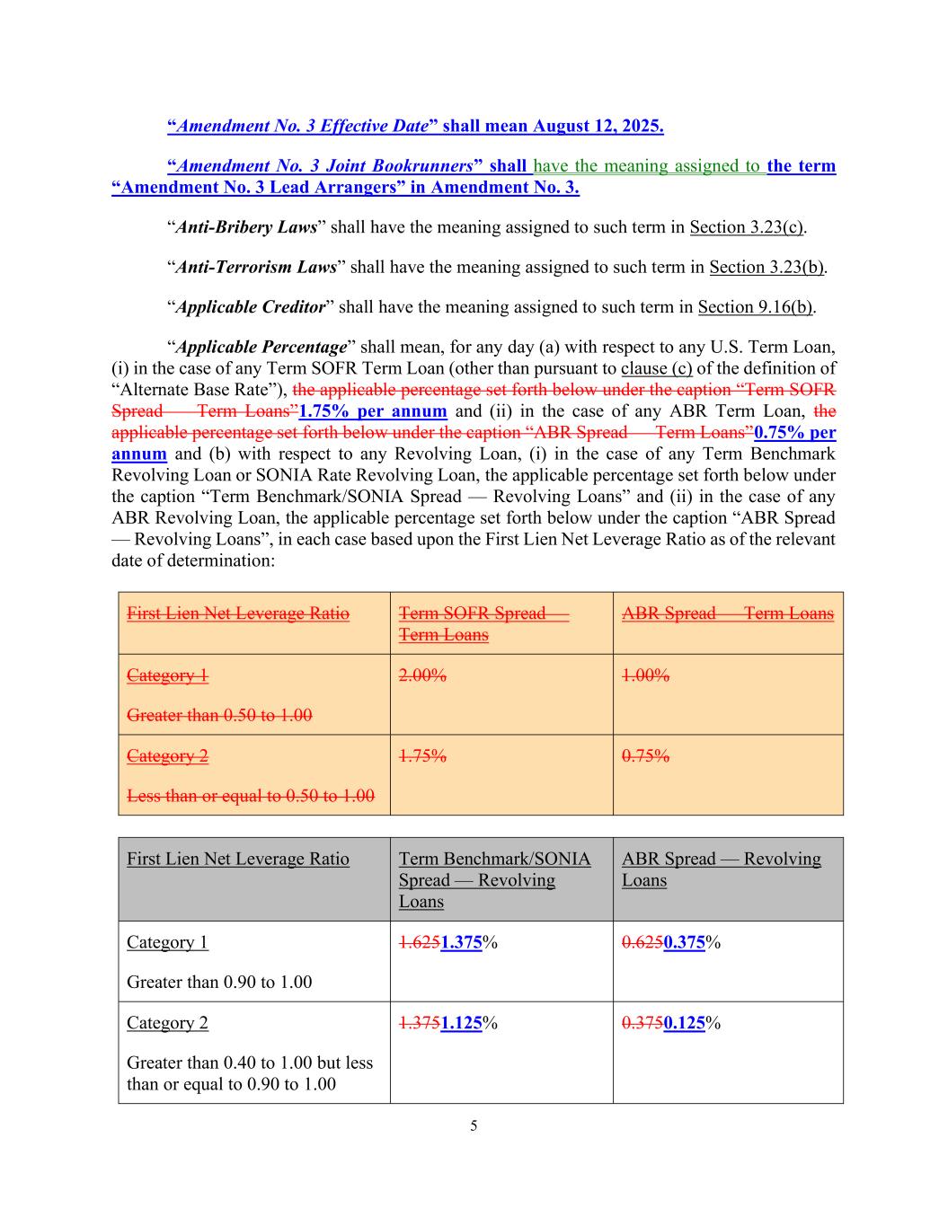 5 “Amendment No. 3 Effective Date” shall mean August 12, 2025. “Amendment No. 3 Joint Bookrunners” shall have the meaning assigned to the term “Amendment No. 3 Lead Arrangers” in Amendment No. 3. “Anti-Bribery Laws” shall have the meaning assigned to such term in Section 3.23(c). “Anti-Terrorism Laws” shall have the meaning assigned to such term in Section 3.23(b). “Applicable Creditor” shall have the meaning assigned to such term in Section 9.16(b). “Applicable Percentage” shall mean, for any day (a) with respect to any U.S. Term Loan, (i) in the case of any Term SOFR Term Loan (other than pursuant to clause (c) of the definition of “Alternate Base Rate”), the applicable percentage set forth below under the caption “Term SOFR Spread — Term Loans”1.75% per annum and (ii) in the case of any ABR Term Loan, the applicable percentage set forth below under the caption “ABR Spread — Term Loans”0.75% per annum and (b) with respect to any Revolving Loan, (i) in the case of any Term Benchmark Revolving Loan or SONIA Rate Revolving Loan, the applicable percentage set forth below under the caption “Term Benchmark/SONIA Spread — Revolving Loans” and (ii) in the case of any ABR Revolving Loan, the applicable percentage set forth below under the caption “ABR Spread — Revolving Loans”, in each case based upon the First Lien Net Leverage Ratio as of the relevant date of determination: First Lien Net Leverage Ratio Term SOFR Spread — Term Loans ABR Spread — Term Loans Category 1 Greater than 0.50 to 1.00 2.00% 1.00% Category 2 Less than or equal to 0.50 to 1.00 1.75% 0.75% First Lien Net Leverage Ratio Term Benchmark/SONIA Spread — Revolving Loans ABR Spread — Revolving Loans Category 1 Greater than 0.90 to 1.00 1.6251.375% 0.6250.375% Category 2 Greater than 0.40 to 1.00 but less than or equal to 0.90 to 1.00 1.3751.125% 0.3750.125%