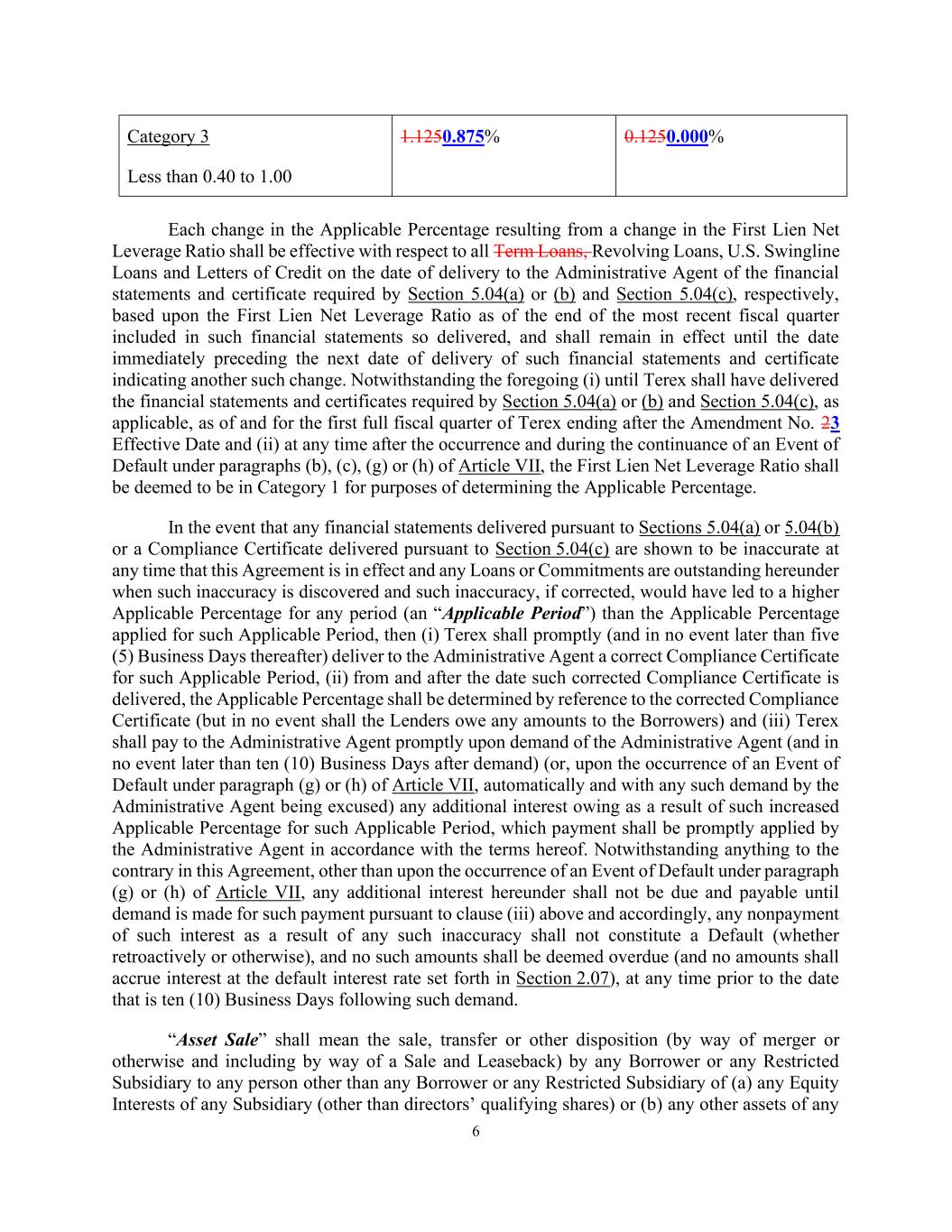 6 Category 3 Less than 0.40 to 1.00 1.1250.875% 0.1250.000% Each change in the Applicable Percentage resulting from a change in the First Lien Net Leverage Ratio shall be effective with respect to all Term Loans, Revolving Loans, U.S. Swingline Loans and Letters of Credit on the date of delivery to the Administrative Agent of the financial statements and certificate required by Section 5.04(a) or (b) and Section 5.04(c), respectively, based upon the First Lien Net Leverage Ratio as of the end of the most recent fiscal quarter included in such financial statements so delivered, and shall remain in effect until the date immediately preceding the next date of delivery of such financial statements and certificate indicating another such change. Notwithstanding the foregoing (i) until Terex shall have delivered the financial statements and certificates required by Section 5.04(a) or (b) and Section 5.04(c), as applicable, as of and for the first full fiscal quarter of Terex ending after the Amendment No. 23 Effective Date and (ii) at any time after the occurrence and during the continuance of an Event of Default under paragraphs (b), (c), (g) or (h) of Article VII, the First Lien Net Leverage Ratio shall be deemed to be in Category 1 for purposes of determining the Applicable Percentage. In the event that any financial statements delivered pursuant to Sections 5.04(a) or 5.04(b) or a Compliance Certificate delivered pursuant to Section 5.04(c) are shown to be inaccurate at any time that this Agreement is in effect and any Loans or Commitments are outstanding hereunder when such inaccuracy is discovered and such inaccuracy, if corrected, would have led to a higher Applicable Percentage for any period (an “Applicable Period”) than the Applicable Percentage applied for such Applicable Period, then (i) Terex shall promptly (and in no event later than five (5) Business Days thereafter) deliver to the Administrative Agent a correct Compliance Certificate for such Applicable Period, (ii) from and after the date such corrected Compliance Certificate is delivered, the Applicable Percentage shall be determined by reference to the corrected Compliance Certificate (but in no event shall the Lenders owe any amounts to the Borrowers) and (iii) Terex shall pay to the Administrative Agent promptly upon demand of the Administrative Agent (and in no event later than ten (10) Business Days after demand) (or, upon the occurrence of an Event of Default under paragraph (g) or (h) of Article VII, automatically and with any such demand by the Administrative Agent being excused) any additional interest owing as a result of such increased Applicable Percentage for such Applicable Period, which payment shall be promptly applied by the Administrative Agent in accordance with the terms hereof. Notwithstanding anything to the contrary in this Agreement, other than upon the occurrence of an Event of Default under paragraph (g) or (h) of Article VII, any additional interest hereunder shall not be due and payable until demand is made for such payment pursuant to clause (iii) above and accordingly, any nonpayment of such interest as a result of any such inaccuracy shall not constitute a Default (whether retroactively or otherwise), and no such amounts shall be deemed overdue (and no amounts shall accrue interest at the default interest rate set forth in Section 2.07), at any time prior to the date that is ten (10) Business Days following such demand. “Asset Sale” shall mean the sale, transfer or other disposition (by way of merger or otherwise and including by way of a Sale and Leaseback) by any Borrower or any Restricted Subsidiary to any person other than any Borrower or any Restricted Subsidiary of (a) any Equity Interests of any Subsidiary (other than directors’ qualifying shares) or (b) any other assets of any