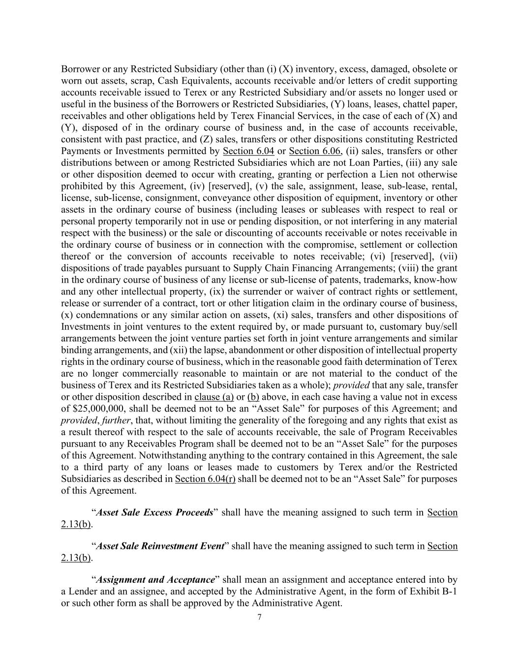 7 Borrower or any Restricted Subsidiary (other than (i) (X) inventory, excess, damaged, obsolete or worn out assets, scrap, Cash Equivalents, accounts receivable and/or letters of credit supporting accounts receivable issued to Terex or any Restricted Subsidiary and/or assets no longer used or useful in the business of the Borrowers or Restricted Subsidiaries, (Y) loans, leases, chattel paper, receivables and other obligations held by Terex Financial Services, in the case of each of (X) and (Y), disposed of in the ordinary course of business and, in the case of accounts receivable, consistent with past practice, and (Z) sales, transfers or other dispositions constituting Restricted Payments or Investments permitted by Section 6.04 or Section 6.06, (ii) sales, transfers or other distributions between or among Restricted Subsidiaries which are not Loan Parties, (iii) any sale or other disposition deemed to occur with creating, granting or perfection a Lien not otherwise prohibited by this Agreement, (iv) [reserved], (v) the sale, assignment, lease, sub-lease, rental, license, sub-license, consignment, conveyance other disposition of equipment, inventory or other assets in the ordinary course of business (including leases or subleases with respect to real or personal property temporarily not in use or pending disposition, or not interfering in any material respect with the business) or the sale or discounting of accounts receivable or notes receivable in the ordinary course of business or in connection with the compromise, settlement or collection thereof or the conversion of accounts receivable to notes receivable; (vi) [reserved], (vii) dispositions of trade payables pursuant to Supply Chain Financing Arrangements; (viii) the grant in the ordinary course of business of any license or sub-license of patents, trademarks, know-how and any other intellectual property, (ix) the surrender or waiver of contract rights or settlement, release or surrender of a contract, tort or other litigation claim in the ordinary course of business, (x) condemnations or any similar action on assets, (xi) sales, transfers and other dispositions of Investments in joint ventures to the extent required by, or made pursuant to, customary buy/sell arrangements between the joint venture parties set forth in joint venture arrangements and similar binding arrangements, and (xii) the lapse, abandonment or other disposition of intellectual property rights in the ordinary course of business, which in the reasonable good faith determination of Terex are no longer commercially reasonable to maintain or are not material to the conduct of the business of Terex and its Restricted Subsidiaries taken as a whole); provided that any sale, transfer or other disposition described in clause (a) or (b) above, in each case having a value not in excess of $25,000,000, shall be deemed not to be an “Asset Sale” for purposes of this Agreement; and provided, further, that, without limiting the generality of the foregoing and any rights that exist as a result thereof with respect to the sale of accounts receivable, the sale of Program Receivables pursuant to any Receivables Program shall be deemed not to be an “Asset Sale” for the purposes of this Agreement. Notwithstanding anything to the contrary contained in this Agreement, the sale to a third party of any loans or leases made to customers by Terex and/or the Restricted Subsidiaries as described in Section 6.04(r) shall be deemed not to be an “Asset Sale” for purposes of this Agreement. “Asset Sale Excess Proceeds” shall have the meaning assigned to such term in Section 2.13(b). “Asset Sale Reinvestment Event” shall have the meaning assigned to such term in Section 2.13(b). “Assignment and Acceptance” shall mean an assignment and acceptance entered into by a Lender and an assignee, and accepted by the Administrative Agent, in the form of Exhibit B-1 or such other form as shall be approved by the Administrative Agent.