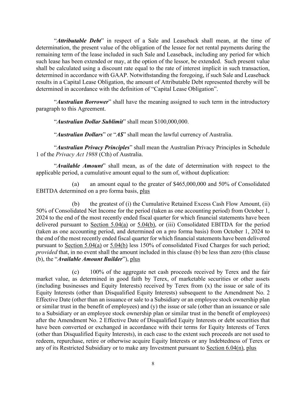 8 “Attributable Debt” in respect of a Sale and Leaseback shall mean, at the time of determination, the present value of the obligation of the lessee for net rental payments during the remaining term of the lease included in such Sale and Leaseback, including any period for which such lease has been extended or may, at the option of the lessor, be extended. Such present value shall be calculated using a discount rate equal to the rate of interest implicit in such transaction, determined in accordance with GAAP. Notwithstanding the foregoing, if such Sale and Leaseback results in a Capital Lease Obligation, the amount of Attributable Debt represented thereby will be determined in accordance with the definition of “Capital Lease Obligation”. “Australian Borrower” shall have the meaning assigned to such term in the introductory paragraph to this Agreement. “Australian Dollar Sublimit” shall mean $100,000,000. “Australian Dollars” or “A$” shall mean the lawful currency of Australia. “Australian Privacy Principles” shall mean the Australian Privacy Principles in Schedule 1 of the Privacy Act 1988 (Cth) of Australia. “Available Amount” shall mean, as of the date of determination with respect to the applicable period, a cumulative amount equal to the sum of, without duplication: (a) an amount equal to the greater of $465,000,000 and 50% of Consolidated EBITDA determined on a pro forma basis, plus (b) the greatest of (i) the Cumulative Retained Excess Cash Flow Amount, (ii) 50% of Consolidated Net Income for the period (taken as one accounting period) from October 1, 2024 to the end of the most recently ended fiscal quarter for which financial statements have been delivered pursuant to Section 5.04(a) or 5.04(b), or (iii) Consolidated EBITDA for the period (taken as one accounting period, and determined on a pro forma basis) from October 1, 2024 to the end of the most recently ended fiscal quarter for which financial statements have been delivered pursuant to Section 5.04(a) or 5.04(b) less 150% of consolidated Fixed Charges for such period; provided that, in no event shall the amount included in this clause (b) be less than zero (this clause (b), the “Available Amount Builder”), plus (c) 100% of the aggregate net cash proceeds received by Terex and the fair market value, as determined in good faith by Terex, of marketable securities or other assets (including businesses and Equity Interests) received by Terex from (x) the issue or sale of its Equity Interests (other than Disqualified Equity Interests) subsequent to the Amendment No. 2 Effective Date (other than an issuance or sale to a Subsidiary or an employee stock ownership plan or similar trust in the benefit of employees) and (y) the issue or sale (other than an issuance or sale to a Subsidiary or an employee stock ownership plan or similar trust in the benefit of employees) after the Amendment No. 2 Effective Date of Disqualified Equity Interests or debt securities that have been converted or exchanged in accordance with their terms for Equity Interests of Terex (other than Disqualified Equity Interests), in each case to the extent such proceeds are not used to redeem, repurchase, retire or otherwise acquire Equity Interests or any Indebtedness of Terex or any of its Restricted Subsidiary or to make any Investment pursuant to Section 6.04(n), plus