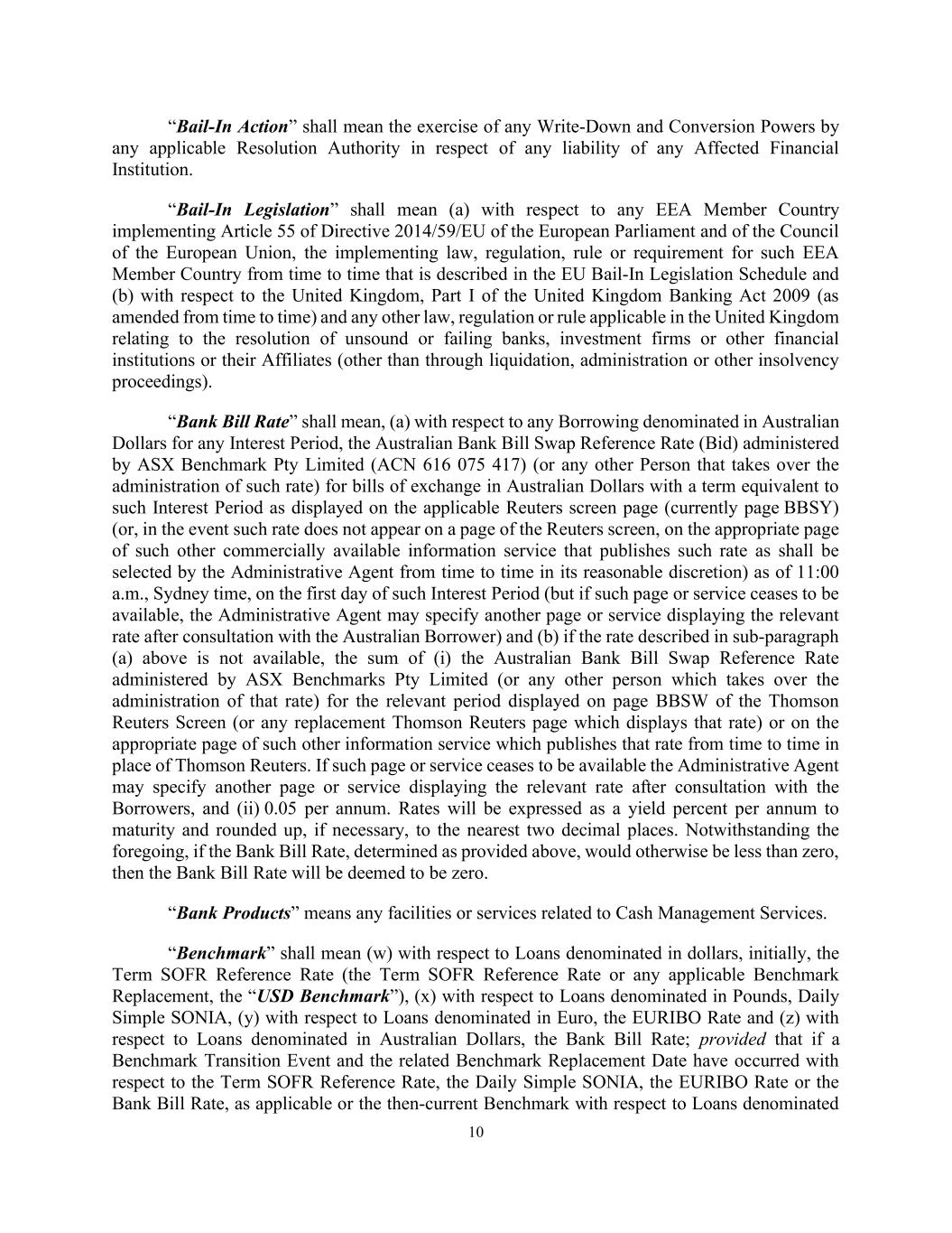 10 “Bail-In Action” shall mean the exercise of any Write-Down and Conversion Powers by any applicable Resolution Authority in respect of any liability of any Affected Financial Institution. “Bail-In Legislation” shall mean (a) with respect to any EEA Member Country implementing Article 55 of Directive 2014/59/EU of the European Parliament and of the Council of the European Union, the implementing law, regulation, rule or requirement for such EEA Member Country from time to time that is described in the EU Bail-In Legislation Schedule and (b) with respect to the United Kingdom, Part I of the United Kingdom Banking Act 2009 (as amended from time to time) and any other law, regulation or rule applicable in the United Kingdom relating to the resolution of unsound or failing banks, investment firms or other financial institutions or their Affiliates (other than through liquidation, administration or other insolvency proceedings). “Bank Bill Rate” shall mean, (a) with respect to any Borrowing denominated in Australian Dollars for any Interest Period, the Australian Bank Bill Swap Reference Rate (Bid) administered by ASX Benchmark Pty Limited (ACN 616 075 417) (or any other Person that takes over the administration of such rate) for bills of exchange in Australian Dollars with a term equivalent to such Interest Period as displayed on the applicable Reuters screen page (currently page BBSY) (or, in the event such rate does not appear on a page of the Reuters screen, on the appropriate page of such other commercially available information service that publishes such rate as shall be selected by the Administrative Agent from time to time in its reasonable discretion) as of 11:00 a.m., Sydney time, on the first day of such Interest Period (but if such page or service ceases to be available, the Administrative Agent may specify another page or service displaying the relevant rate after consultation with the Australian Borrower) and (b) if the rate described in sub-paragraph (a) above is not available, the sum of (i) the Australian Bank Bill Swap Reference Rate administered by ASX Benchmarks Pty Limited (or any other person which takes over the administration of that rate) for the relevant period displayed on page BBSW of the Thomson Reuters Screen (or any replacement Thomson Reuters page which displays that rate) or on the appropriate page of such other information service which publishes that rate from time to time in place of Thomson Reuters. If such page or service ceases to be available the Administrative Agent may specify another page or service displaying the relevant rate after consultation with the Borrowers, and (ii) 0.05 per annum. Rates will be expressed as a yield percent per annum to maturity and rounded up, if necessary, to the nearest two decimal places. Notwithstanding the foregoing, if the Bank Bill Rate, determined as provided above, would otherwise be less than zero, then the Bank Bill Rate will be deemed to be zero. “Bank Products” means any facilities or services related to Cash Management Services. “Benchmark” shall mean (w) with respect to Loans denominated in dollars, initially, the Term SOFR Reference Rate (the Term SOFR Reference Rate or any applicable Benchmark Replacement, the “USD Benchmark”), (x) with respect to Loans denominated in Pounds, Daily Simple SONIA, (y) with respect to Loans denominated in Euro, the EURIBO Rate and (z) with respect to Loans denominated in Australian Dollars, the Bank Bill Rate; provided that if a Benchmark Transition Event and the related Benchmark Replacement Date have occurred with respect to the Term SOFR Reference Rate, the Daily Simple SONIA, the EURIBO Rate or the Bank Bill Rate, as applicable or the then-current Benchmark with respect to Loans denominated