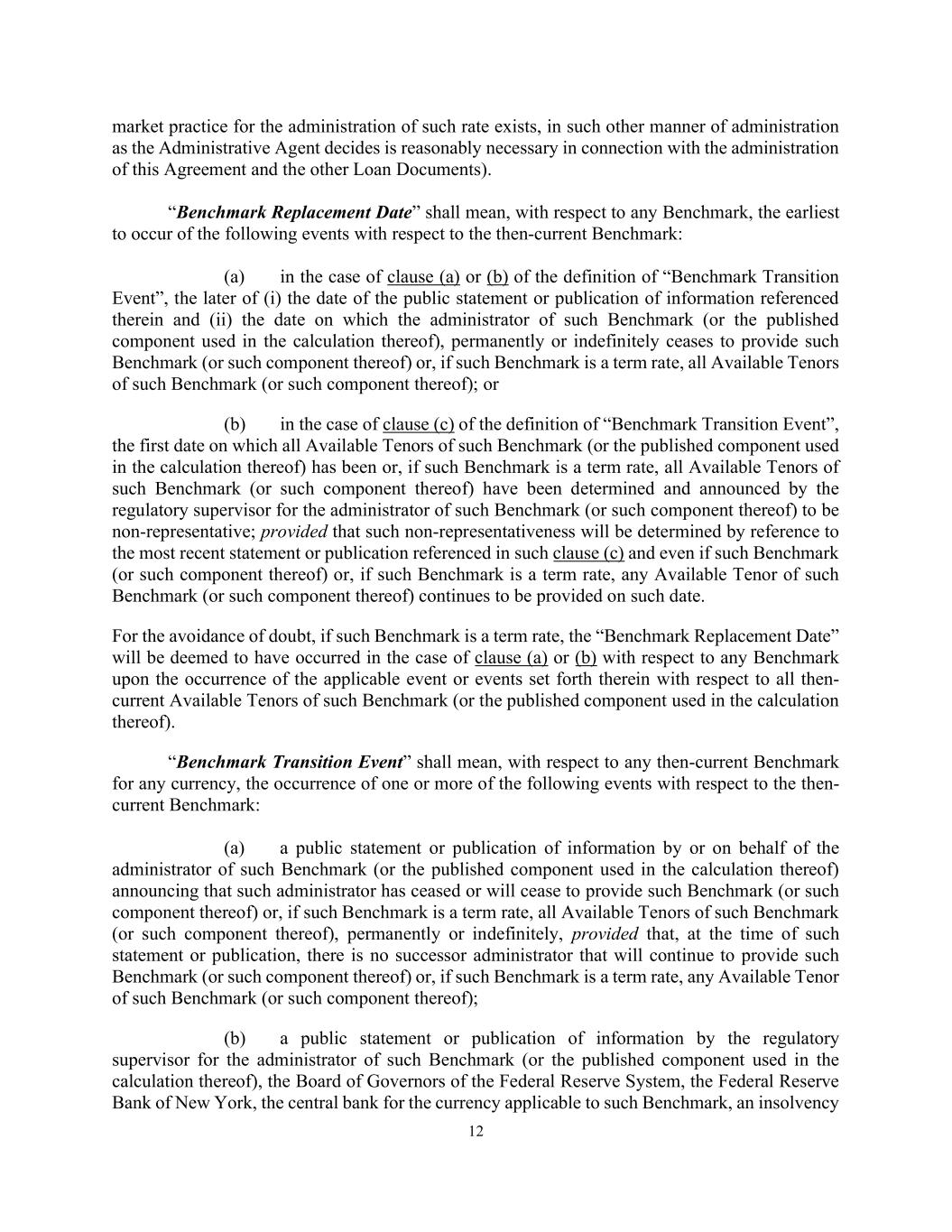 12 market practice for the administration of such rate exists, in such other manner of administration as the Administrative Agent decides is reasonably necessary in connection with the administration of this Agreement and the other Loan Documents). “Benchmark Replacement Date” shall mean, with respect to any Benchmark, the earliest to occur of the following events with respect to the then-current Benchmark: (a) in the case of clause (a) or (b) of the definition of “Benchmark Transition Event”, the later of (i) the date of the public statement or publication of information referenced therein and (ii) the date on which the administrator of such Benchmark (or the published component used in the calculation thereof), permanently or indefinitely ceases to provide such Benchmark (or such component thereof) or, if such Benchmark is a term rate, all Available Tenors of such Benchmark (or such component thereof); or (b) in the case of clause (c) of the definition of “Benchmark Transition Event”, the first date on which all Available Tenors of such Benchmark (or the published component used in the calculation thereof) has been or, if such Benchmark is a term rate, all Available Tenors of such Benchmark (or such component thereof) have been determined and announced by the regulatory supervisor for the administrator of such Benchmark (or such component thereof) to be non-representative; provided that such non-representativeness will be determined by reference to the most recent statement or publication referenced in such clause (c) and even if such Benchmark (or such component thereof) or, if such Benchmark is a term rate, any Available Tenor of such Benchmark (or such component thereof) continues to be provided on such date. For the avoidance of doubt, if such Benchmark is a term rate, the “Benchmark Replacement Date” will be deemed to have occurred in the case of clause (a) or (b) with respect to any Benchmark upon the occurrence of the applicable event or events set forth therein with respect to all then- current Available Tenors of such Benchmark (or the published component used in the calculation thereof). “Benchmark Transition Event” shall mean, with respect to any then-current Benchmark for any currency, the occurrence of one or more of the following events with respect to the then- current Benchmark: (a) a public statement or publication of information by or on behalf of the administrator of such Benchmark (or the published component used in the calculation thereof) announcing that such administrator has ceased or will cease to provide such Benchmark (or such component thereof) or, if such Benchmark is a term rate, all Available Tenors of such Benchmark (or such component thereof), permanently or indefinitely, provided that, at the time of such statement or publication, there is no successor administrator that will continue to provide such Benchmark (or such component thereof) or, if such Benchmark is a term rate, any Available Tenor of such Benchmark (or such component thereof); (b) a public statement or publication of information by the regulatory supervisor for the administrator of such Benchmark (or the published component used in the calculation thereof), the Board of Governors of the Federal Reserve System, the Federal Reserve Bank of New York, the central bank for the currency applicable to such Benchmark, an insolvency