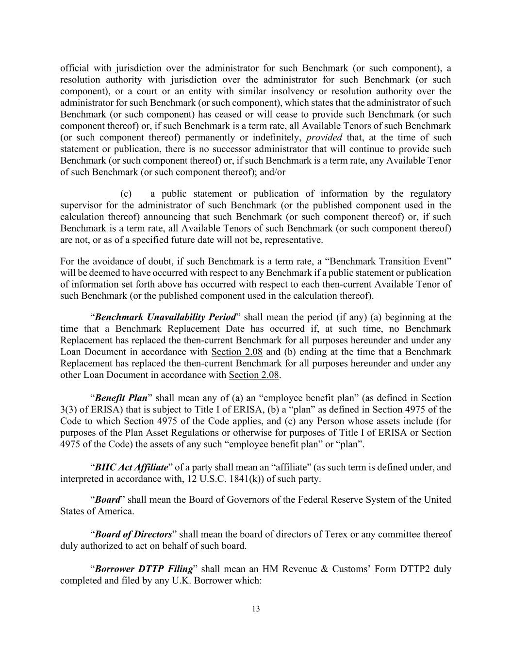 13 official with jurisdiction over the administrator for such Benchmark (or such component), a resolution authority with jurisdiction over the administrator for such Benchmark (or such component), or a court or an entity with similar insolvency or resolution authority over the administrator for such Benchmark (or such component), which states that the administrator of such Benchmark (or such component) has ceased or will cease to provide such Benchmark (or such component thereof) or, if such Benchmark is a term rate, all Available Tenors of such Benchmark (or such component thereof) permanently or indefinitely, provided that, at the time of such statement or publication, there is no successor administrator that will continue to provide such Benchmark (or such component thereof) or, if such Benchmark is a term rate, any Available Tenor of such Benchmark (or such component thereof); and/or (c) a public statement or publication of information by the regulatory supervisor for the administrator of such Benchmark (or the published component used in the calculation thereof) announcing that such Benchmark (or such component thereof) or, if such Benchmark is a term rate, all Available Tenors of such Benchmark (or such component thereof) are not, or as of a specified future date will not be, representative. For the avoidance of doubt, if such Benchmark is a term rate, a “Benchmark Transition Event” will be deemed to have occurred with respect to any Benchmark if a public statement or publication of information set forth above has occurred with respect to each then-current Available Tenor of such Benchmark (or the published component used in the calculation thereof). “Benchmark Unavailability Period” shall mean the period (if any) (a) beginning at the time that a Benchmark Replacement Date has occurred if, at such time, no Benchmark Replacement has replaced the then-current Benchmark for all purposes hereunder and under any Loan Document in accordance with Section 2.08 and (b) ending at the time that a Benchmark Replacement has replaced the then-current Benchmark for all purposes hereunder and under any other Loan Document in accordance with Section 2.08. “Benefit Plan” shall mean any of (a) an “employee benefit plan” (as defined in Section 3(3) of ERISA) that is subject to Title I of ERISA, (b) a “plan” as defined in Section 4975 of the Code to which Section 4975 of the Code applies, and (c) any Person whose assets include (for purposes of the Plan Asset Regulations or otherwise for purposes of Title I of ERISA or Section 4975 of the Code) the assets of any such “employee benefit plan” or “plan”. “BHC Act Affiliate” of a party shall mean an “affiliate” (as such term is defined under, and interpreted in accordance with, 12 U.S.C. 1841(k)) of such party. “Board” shall mean the Board of Governors of the Federal Reserve System of the United States of America. “Board of Directors” shall mean the board of directors of Terex or any committee thereof duly authorized to act on behalf of such board. “Borrower DTTP Filing” shall mean an HM Revenue & Customs’ Form DTTP2 duly completed and filed by any U.K. Borrower which: