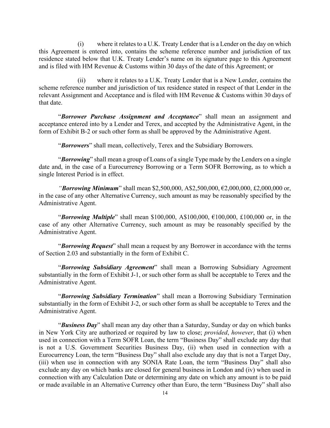 14 (i) where it relates to a U.K. Treaty Lender that is a Lender on the day on which this Agreement is entered into, contains the scheme reference number and jurisdiction of tax residence stated below that U.K. Treaty Lender’s name on its signature page to this Agreement and is filed with HM Revenue & Customs within 30 days of the date of this Agreement; or (ii) where it relates to a U.K. Treaty Lender that is a New Lender, contains the scheme reference number and jurisdiction of tax residence stated in respect of that Lender in the relevant Assignment and Acceptance and is filed with HM Revenue & Customs within 30 days of that date. “Borrower Purchase Assignment and Acceptance” shall mean an assignment and acceptance entered into by a Lender and Terex, and accepted by the Administrative Agent, in the form of Exhibit B-2 or such other form as shall be approved by the Administrative Agent. “Borrowers” shall mean, collectively, Terex and the Subsidiary Borrowers. “Borrowing” shall mean a group of Loans of a single Type made by the Lenders on a single date and, in the case of a Eurocurrency Borrowing or a Term SOFR Borrowing, as to which a single Interest Period is in effect. “Borrowing Minimum” shall mean $2,500,000, A$2,500,000, €2,000,000, £2,000,000 or, in the case of any other Alternative Currency, such amount as may be reasonably specified by the Administrative Agent. “Borrowing Multiple” shall mean $100,000, A$100,000, €100,000, £100,000 or, in the case of any other Alternative Currency, such amount as may be reasonably specified by the Administrative Agent. “Borrowing Request” shall mean a request by any Borrower in accordance with the terms of Section 2.03 and substantially in the form of Exhibit C. “Borrowing Subsidiary Agreement” shall mean a Borrowing Subsidiary Agreement substantially in the form of Exhibit J-1, or such other form as shall be acceptable to Terex and the Administrative Agent. “Borrowing Subsidiary Termination” shall mean a Borrowing Subsidiary Termination substantially in the form of Exhibit J-2, or such other form as shall be acceptable to Terex and the Administrative Agent. “Business Day” shall mean any day other than a Saturday, Sunday or day on which banks in New York City are authorized or required by law to close; provided, however, that (i) when used in connection with a Term SOFR Loan, the term “Business Day” shall exclude any day that is not a U.S. Government Securities Business Day, (ii) when used in connection with a Eurocurrency Loan, the term “Business Day” shall also exclude any day that is not a Target Day, (iii) when use in connection with any SONIA Rate Loan, the term “Business Day” shall also exclude any day on which banks are closed for general business in London and (iv) when used in connection with any Calculation Date or determining any date on which any amount is to be paid or made available in an Alternative Currency other than Euro, the term “Business Day” shall also