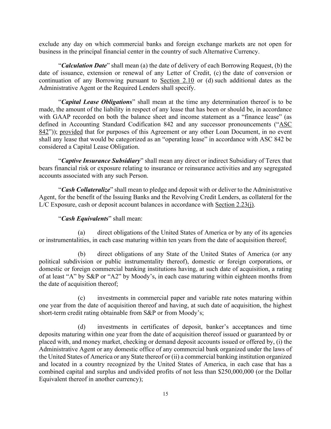 15 exclude any day on which commercial banks and foreign exchange markets are not open for business in the principal financial center in the country of such Alternative Currency. “Calculation Date” shall mean (a) the date of delivery of each Borrowing Request, (b) the date of issuance, extension or renewal of any Letter of Credit, (c) the date of conversion or continuation of any Borrowing pursuant to Section 2.10 or (d) such additional dates as the Administrative Agent or the Required Lenders shall specify. “Capital Lease Obligations” shall mean at the time any determination thereof is to be made, the amount of the liability in respect of any lease that has been or should be, in accordance with GAAP recorded on both the balance sheet and income statement as a “finance lease” (as defined in Accounting Standard Codification 842 and any successor pronouncements (“ASC 842”)); provided that for purposes of this Agreement or any other Loan Document, in no event shall any lease that would be categorized as an “operating lease” in accordance with ASC 842 be considered a Capital Lease Obligation. “Captive Insurance Subsidiary” shall mean any direct or indirect Subsidiary of Terex that bears financial risk or exposure relating to insurance or reinsurance activities and any segregated accounts associated with any such Person. “Cash Collateralize” shall mean to pledge and deposit with or deliver to the Administrative Agent, for the benefit of the Issuing Banks and the Revolving Credit Lenders, as collateral for the L/C Exposure, cash or deposit account balances in accordance with Section 2.23(j). “Cash Equivalents” shall mean: (a) direct obligations of the United States of America or by any of its agencies or instrumentalities, in each case maturing within ten years from the date of acquisition thereof; (b) direct obligations of any State of the United States of America (or any political subdivision or public instrumentality thereof), domestic or foreign corporations, or domestic or foreign commercial banking institutions having, at such date of acquisition, a rating of at least “A” by S&P or “A2” by Moody’s, in each case maturing within eighteen months from the date of acquisition thereof; (c) investments in commercial paper and variable rate notes maturing within one year from the date of acquisition thereof and having, at such date of acquisition, the highest short-term credit rating obtainable from S&P or from Moody’s; (d) investments in certificates of deposit, banker’s acceptances and time deposits maturing within one year from the date of acquisition thereof issued or guaranteed by or placed with, and money market, checking or demand deposit accounts issued or offered by, (i) the Administrative Agent or any domestic office of any commercial bank organized under the laws of the United States of America or any State thereof or (ii) a commercial banking institution organized and located in a country recognized by the United States of America, in each case that has a combined capital and surplus and undivided profits of not less than $250,000,000 (or the Dollar Equivalent thereof in another currency);