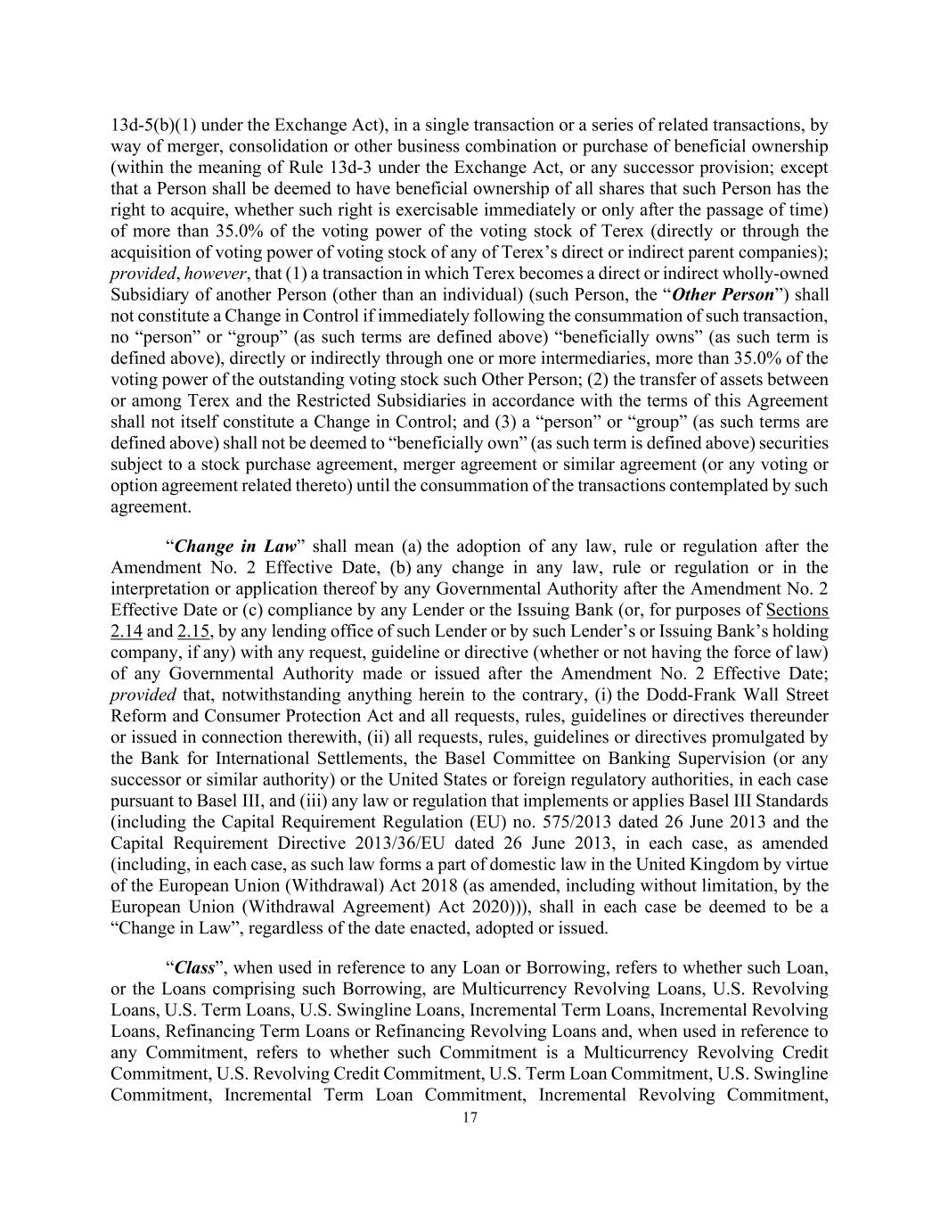 17 13d-5(b)(1) under the Exchange Act), in a single transaction or a series of related transactions, by way of merger, consolidation or other business combination or purchase of beneficial ownership (within the meaning of Rule 13d-3 under the Exchange Act, or any successor provision; except that a Person shall be deemed to have beneficial ownership of all shares that such Person has the right to acquire, whether such right is exercisable immediately or only after the passage of time) of more than 35.0% of the voting power of the voting stock of Terex (directly or through the acquisition of voting power of voting stock of any of Terex’s direct or indirect parent companies); provided, however, that (1) a transaction in which Terex becomes a direct or indirect wholly-owned Subsidiary of another Person (other than an individual) (such Person, the “Other Person”) shall not constitute a Change in Control if immediately following the consummation of such transaction, no “person” or “group” (as such terms are defined above) “beneficially owns” (as such term is defined above), directly or indirectly through one or more intermediaries, more than 35.0% of the voting power of the outstanding voting stock such Other Person; (2) the transfer of assets between or among Terex and the Restricted Subsidiaries in accordance with the terms of this Agreement shall not itself constitute a Change in Control; and (3) a “person” or “group” (as such terms are defined above) shall not be deemed to “beneficially own” (as such term is defined above) securities subject to a stock purchase agreement, merger agreement or similar agreement (or any voting or option agreement related thereto) until the consummation of the transactions contemplated by such agreement. “Change in Law” shall mean (a) the adoption of any law, rule or regulation after the Amendment No. 2 Effective Date, (b) any change in any law, rule or regulation or in the interpretation or application thereof by any Governmental Authority after the Amendment No. 2 Effective Date or (c) compliance by any Lender or the Issuing Bank (or, for purposes of Sections 2.14 and 2.15, by any lending office of such Lender or by such Lender’s or Issuing Bank’s holding company, if any) with any request, guideline or directive (whether or not having the force of law) of any Governmental Authority made or issued after the Amendment No. 2 Effective Date; provided that, notwithstanding anything herein to the contrary, (i) the Dodd-Frank Wall Street Reform and Consumer Protection Act and all requests, rules, guidelines or directives thereunder or issued in connection therewith, (ii) all requests, rules, guidelines or directives promulgated by the Bank for International Settlements, the Basel Committee on Banking Supervision (or any successor or similar authority) or the United States or foreign regulatory authorities, in each case pursuant to Basel III, and (iii) any law or regulation that implements or applies Basel III Standards (including the Capital Requirement Regulation (EU) no. 575/2013 dated 26 June 2013 and the Capital Requirement Directive 2013/36/EU dated 26 June 2013, in each case, as amended (including, in each case, as such law forms a part of domestic law in the United Kingdom by virtue of the European Union (Withdrawal) Act 2018 (as amended, including without limitation, by the European Union (Withdrawal Agreement) Act 2020))), shall in each case be deemed to be a “Change in Law”, regardless of the date enacted, adopted or issued. “Class”, when used in reference to any Loan or Borrowing, refers to whether such Loan, or the Loans comprising such Borrowing, are Multicurrency Revolving Loans, U.S. Revolving Loans, U.S. Term Loans, U.S. Swingline Loans, Incremental Term Loans, Incremental Revolving Loans, Refinancing Term Loans or Refinancing Revolving Loans and, when used in reference to any Commitment, refers to whether such Commitment is a Multicurrency Revolving Credit Commitment, U.S. Revolving Credit Commitment, U.S. Term Loan Commitment, U.S. Swingline Commitment, Incremental Term Loan Commitment, Incremental Revolving Commitment,
