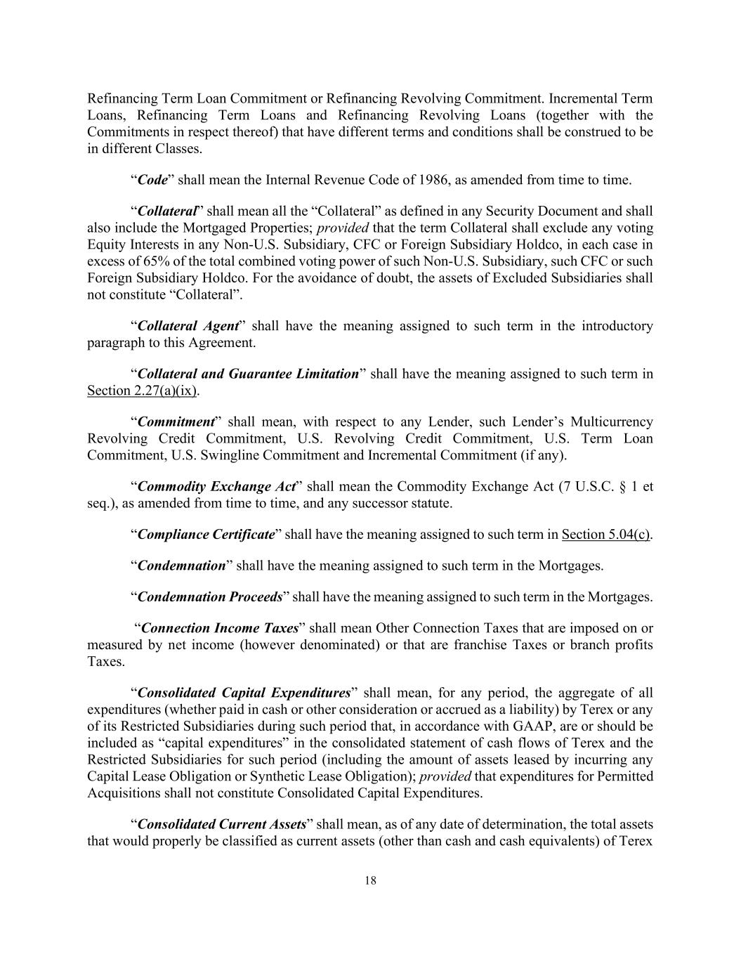 18 Refinancing Term Loan Commitment or Refinancing Revolving Commitment. Incremental Term Loans, Refinancing Term Loans and Refinancing Revolving Loans (together with the Commitments in respect thereof) that have different terms and conditions shall be construed to be in different Classes. “Code” shall mean the Internal Revenue Code of 1986, as amended from time to time. “Collateral” shall mean all the “Collateral” as defined in any Security Document and shall also include the Mortgaged Properties; provided that the term Collateral shall exclude any voting Equity Interests in any Non-U.S. Subsidiary, CFC or Foreign Subsidiary Holdco, in each case in excess of 65% of the total combined voting power of such Non-U.S. Subsidiary, such CFC or such Foreign Subsidiary Holdco. For the avoidance of doubt, the assets of Excluded Subsidiaries shall not constitute “Collateral”. “Collateral Agent” shall have the meaning assigned to such term in the introductory paragraph to this Agreement. “Collateral and Guarantee Limitation” shall have the meaning assigned to such term in Section 2.27(a)(ix). “Commitment” shall mean, with respect to any Lender, such Lender’s Multicurrency Revolving Credit Commitment, U.S. Revolving Credit Commitment, U.S. Term Loan Commitment, U.S. Swingline Commitment and Incremental Commitment (if any). “Commodity Exchange Act” shall mean the Commodity Exchange Act (7 U.S.C. § 1 et seq.), as amended from time to time, and any successor statute. “Compliance Certificate” shall have the meaning assigned to such term in Section 5.04(c). “Condemnation” shall have the meaning assigned to such term in the Mortgages. “Condemnation Proceeds” shall have the meaning assigned to such term in the Mortgages. “Connection Income Taxes” shall mean Other Connection Taxes that are imposed on or measured by net income (however denominated) or that are franchise Taxes or branch profits Taxes. “Consolidated Capital Expenditures” shall mean, for any period, the aggregate of all expenditures (whether paid in cash or other consideration or accrued as a liability) by Terex or any of its Restricted Subsidiaries during such period that, in accordance with GAAP, are or should be included as “capital expenditures” in the consolidated statement of cash flows of Terex and the Restricted Subsidiaries for such period (including the amount of assets leased by incurring any Capital Lease Obligation or Synthetic Lease Obligation); provided that expenditures for Permitted Acquisitions shall not constitute Consolidated Capital Expenditures. “Consolidated Current Assets” shall mean, as of any date of determination, the total assets that would properly be classified as current assets (other than cash and cash equivalents) of Terex