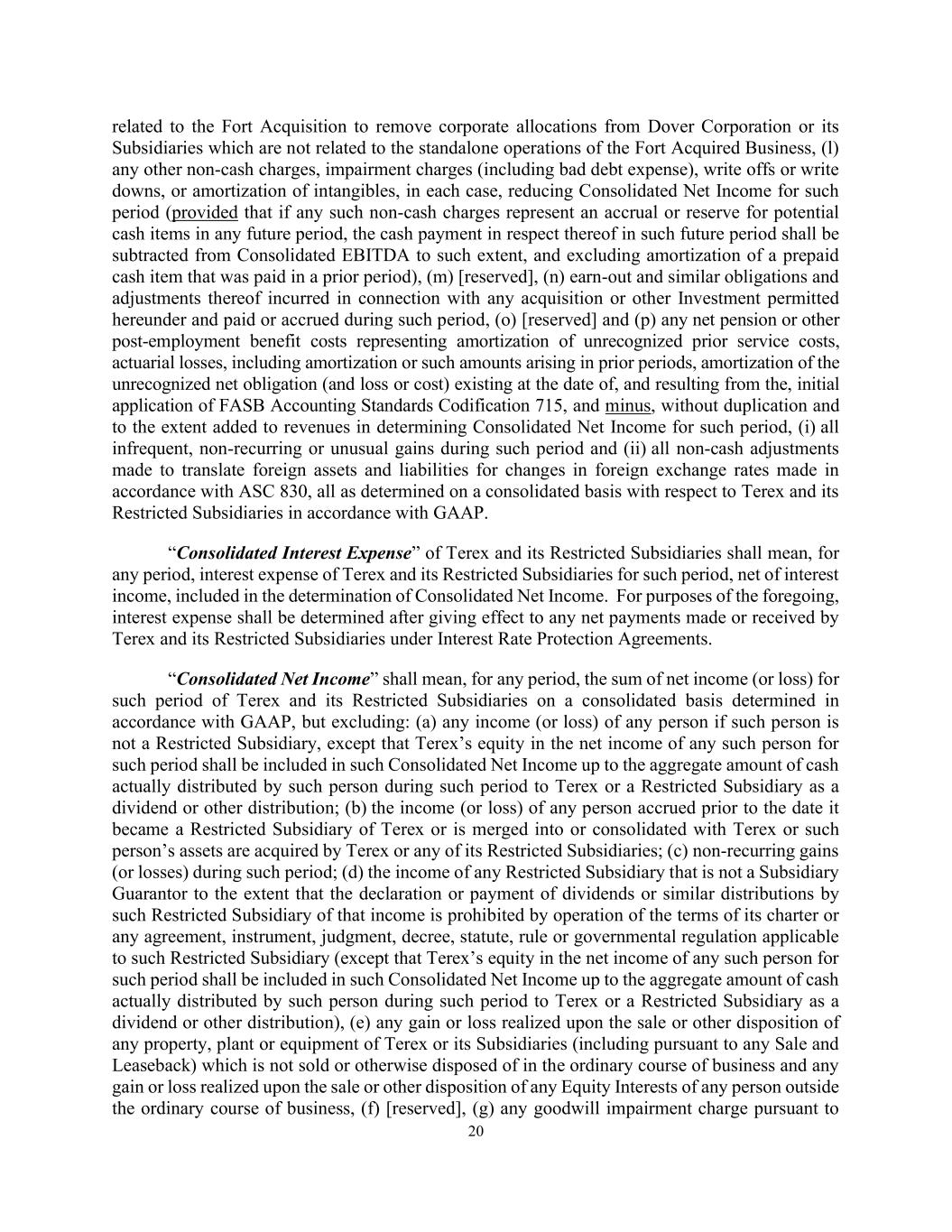 20 related to the Fort Acquisition to remove corporate allocations from Dover Corporation or its Subsidiaries which are not related to the standalone operations of the Fort Acquired Business, (l) any other non-cash charges, impairment charges (including bad debt expense), write offs or write downs, or amortization of intangibles, in each case, reducing Consolidated Net Income for such period (provided that if any such non-cash charges represent an accrual or reserve for potential cash items in any future period, the cash payment in respect thereof in such future period shall be subtracted from Consolidated EBITDA to such extent, and excluding amortization of a prepaid cash item that was paid in a prior period), (m) [reserved], (n) earn-out and similar obligations and adjustments thereof incurred in connection with any acquisition or other Investment permitted hereunder and paid or accrued during such period, (o) [reserved] and (p) any net pension or other post-employment benefit costs representing amortization of unrecognized prior service costs, actuarial losses, including amortization or such amounts arising in prior periods, amortization of the unrecognized net obligation (and loss or cost) existing at the date of, and resulting from the, initial application of FASB Accounting Standards Codification 715, and minus, without duplication and to the extent added to revenues in determining Consolidated Net Income for such period, (i) all infrequent, non-recurring or unusual gains during such period and (ii) all non-cash adjustments made to translate foreign assets and liabilities for changes in foreign exchange rates made in accordance with ASC 830, all as determined on a consolidated basis with respect to Terex and its Restricted Subsidiaries in accordance with GAAP. “Consolidated Interest Expense” of Terex and its Restricted Subsidiaries shall mean, for any period, interest expense of Terex and its Restricted Subsidiaries for such period, net of interest income, included in the determination of Consolidated Net Income. For purposes of the foregoing, interest expense shall be determined after giving effect to any net payments made or received by Terex and its Restricted Subsidiaries under Interest Rate Protection Agreements. “Consolidated Net Income” shall mean, for any period, the sum of net income (or loss) for such period of Terex and its Restricted Subsidiaries on a consolidated basis determined in accordance with GAAP, but excluding: (a) any income (or loss) of any person if such person is not a Restricted Subsidiary, except that Terex’s equity in the net income of any such person for such period shall be included in such Consolidated Net Income up to the aggregate amount of cash actually distributed by such person during such period to Terex or a Restricted Subsidiary as a dividend or other distribution; (b) the income (or loss) of any person accrued prior to the date it became a Restricted Subsidiary of Terex or is merged into or consolidated with Terex or such person’s assets are acquired by Terex or any of its Restricted Subsidiaries; (c) non-recurring gains (or losses) during such period; (d) the income of any Restricted Subsidiary that is not a Subsidiary Guarantor to the extent that the declaration or payment of dividends or similar distributions by such Restricted Subsidiary of that income is prohibited by operation of the terms of its charter or any agreement, instrument, judgment, decree, statute, rule or governmental regulation applicable to such Restricted Subsidiary (except that Terex’s equity in the net income of any such person for such period shall be included in such Consolidated Net Income up to the aggregate amount of cash actually distributed by such person during such period to Terex or a Restricted Subsidiary as a dividend or other distribution), (e) any gain or loss realized upon the sale or other disposition of any property, plant or equipment of Terex or its Subsidiaries (including pursuant to any Sale and Leaseback) which is not sold or otherwise disposed of in the ordinary course of business and any gain or loss realized upon the sale or other disposition of any Equity Interests of any person outside the ordinary course of business, (f) [reserved], (g) any goodwill impairment charge pursuant to