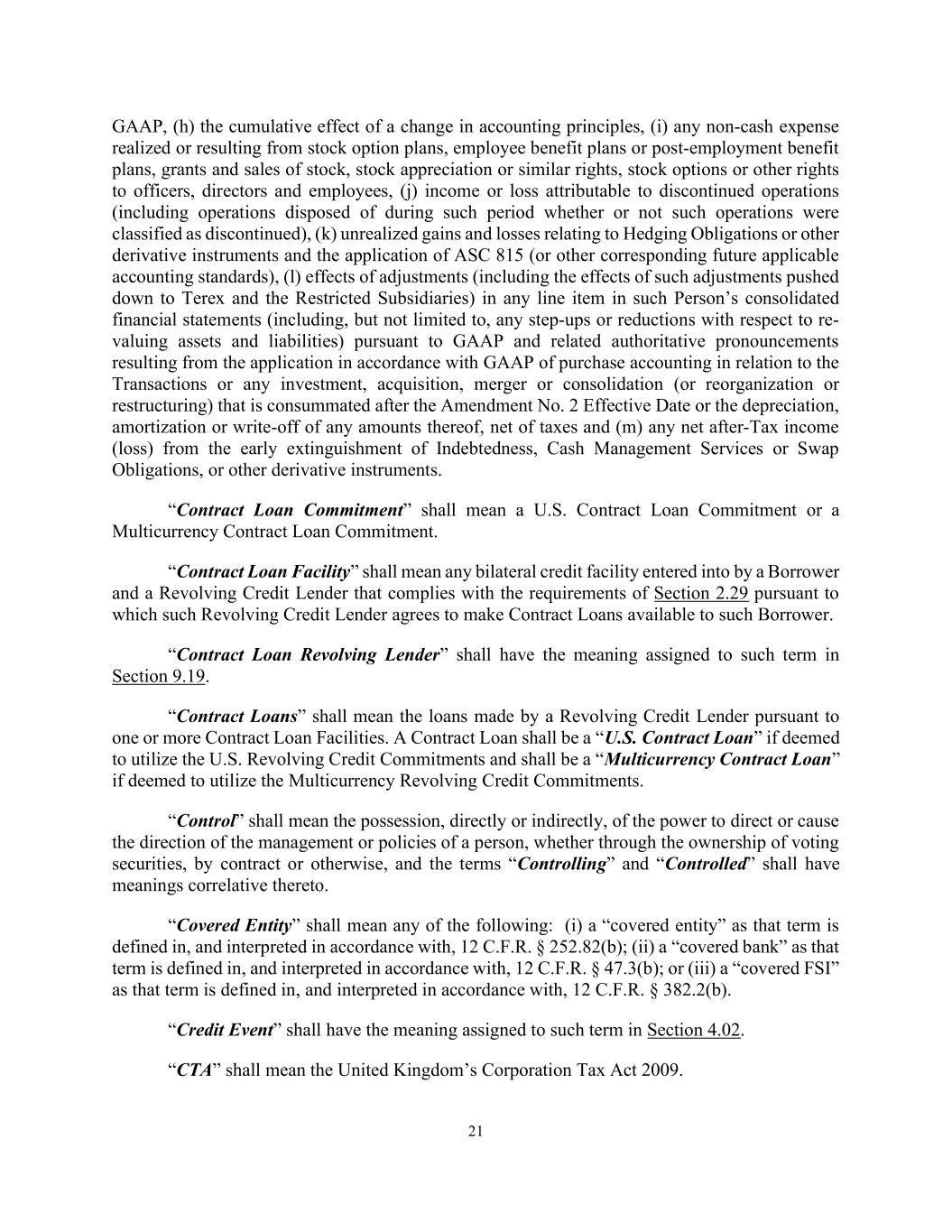 21 GAAP, (h) the cumulative effect of a change in accounting principles, (i) any non-cash expense realized or resulting from stock option plans, employee benefit plans or post-employment benefit plans, grants and sales of stock, stock appreciation or similar rights, stock options or other rights to officers, directors and employees, (j) income or loss attributable to discontinued operations (including operations disposed of during such period whether or not such operations were classified as discontinued), (k) unrealized gains and losses relating to Hedging Obligations or other derivative instruments and the application of ASC 815 (or other corresponding future applicable accounting standards), (l) effects of adjustments (including the effects of such adjustments pushed down to Terex and the Restricted Subsidiaries) in any line item in such Person’s consolidated financial statements (including, but not limited to, any step-ups or reductions with respect to re- valuing assets and liabilities) pursuant to GAAP and related authoritative pronouncements resulting from the application in accordance with GAAP of purchase accounting in relation to the Transactions or any investment, acquisition, merger or consolidation (or reorganization or restructuring) that is consummated after the Amendment No. 2 Effective Date or the depreciation, amortization or write-off of any amounts thereof, net of taxes and (m) any net after-Tax income (loss) from the early extinguishment of Indebtedness, Cash Management Services or Swap Obligations, or other derivative instruments. “Contract Loan Commitment” shall mean a U.S. Contract Loan Commitment or a Multicurrency Contract Loan Commitment. “Contract Loan Facility” shall mean any bilateral credit facility entered into by a Borrower and a Revolving Credit Lender that complies with the requirements of Section 2.29 pursuant to which such Revolving Credit Lender agrees to make Contract Loans available to such Borrower. “Contract Loan Revolving Lender” shall have the meaning assigned to such term in Section 9.19. “Contract Loans” shall mean the loans made by a Revolving Credit Lender pursuant to one or more Contract Loan Facilities. A Contract Loan shall be a “U.S. Contract Loan” if deemed to utilize the U.S. Revolving Credit Commitments and shall be a “Multicurrency Contract Loan” if deemed to utilize the Multicurrency Revolving Credit Commitments. “Control” shall mean the possession, directly or indirectly, of the power to direct or cause the direction of the management or policies of a person, whether through the ownership of voting securities, by contract or otherwise, and the terms “Controlling” and “Controlled” shall have meanings correlative thereto. “Covered Entity” shall mean any of the following: (i) a “covered entity” as that term is defined in, and interpreted in accordance with, 12 C.F.R. § 252.82(b); (ii) a “covered bank” as that term is defined in, and interpreted in accordance with, 12 C.F.R. § 47.3(b); or (iii) a “covered FSI” as that term is defined in, and interpreted in accordance with, 12 C.F.R. § 382.2(b). “Credit Event” shall have the meaning assigned to such term in Section 4.02. “CTA” shall mean the United Kingdom’s Corporation Tax Act 2009.