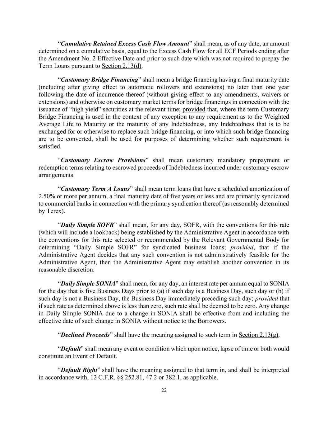22 “Cumulative Retained Excess Cash Flow Amount” shall mean, as of any date, an amount determined on a cumulative basis, equal to the Excess Cash Flow for all ECF Periods ending after the Amendment No. 2 Effective Date and prior to such date which was not required to prepay the Term Loans pursuant to Section 2.13(d). “Customary Bridge Financing” shall mean a bridge financing having a final maturity date (including after giving effect to automatic rollovers and extensions) no later than one year following the date of incurrence thereof (without giving effect to any amendments, waivers or extensions) and otherwise on customary market terms for bridge financings in connection with the issuance of “high yield” securities at the relevant time; provided that, where the term Customary Bridge Financing is used in the context of any exception to any requirement as to the Weighted Average Life to Maturity or the maturity of any Indebtedness, any Indebtedness that is to be exchanged for or otherwise to replace such bridge financing, or into which such bridge financing are to be converted, shall be used for purposes of determining whether such requirement is satisfied. “Customary Escrow Provisions” shall mean customary mandatory prepayment or redemption terms relating to escrowed proceeds of Indebtedness incurred under customary escrow arrangements. “Customary Term A Loans” shall mean term loans that have a scheduled amortization of 2.50% or more per annum, a final maturity date of five years or less and are primarily syndicated to commercial banks in connection with the primary syndication thereof (as reasonably determined by Terex). “Daily Simple SOFR” shall mean, for any day, SOFR, with the conventions for this rate (which will include a lookback) being established by the Administrative Agent in accordance with the conventions for this rate selected or recommended by the Relevant Governmental Body for determining “Daily Simple SOFR” for syndicated business loans; provided, that if the Administrative Agent decides that any such convention is not administratively feasible for the Administrative Agent, then the Administrative Agent may establish another convention in its reasonable discretion. “Daily Simple SONIA” shall mean, for any day, an interest rate per annum equal to SONIA for the day that is five Business Days prior to (a) if such day is a Business Day, such day or (b) if such day is not a Business Day, the Business Day immediately preceding such day; provided that if such rate as determined above is less than zero, such rate shall be deemed to be zero. Any change in Daily Simple SONIA due to a change in SONIA shall be effective from and including the effective date of such change in SONIA without notice to the Borrowers. “Declined Proceeds” shall have the meaning assigned to such term in Section 2.13(g). “Default” shall mean any event or condition which upon notice, lapse of time or both would constitute an Event of Default. “Default Right” shall have the meaning assigned to that term in, and shall be interpreted in accordance with, 12 C.F.R. §§ 252.81, 47.2 or 382.1, as applicable.