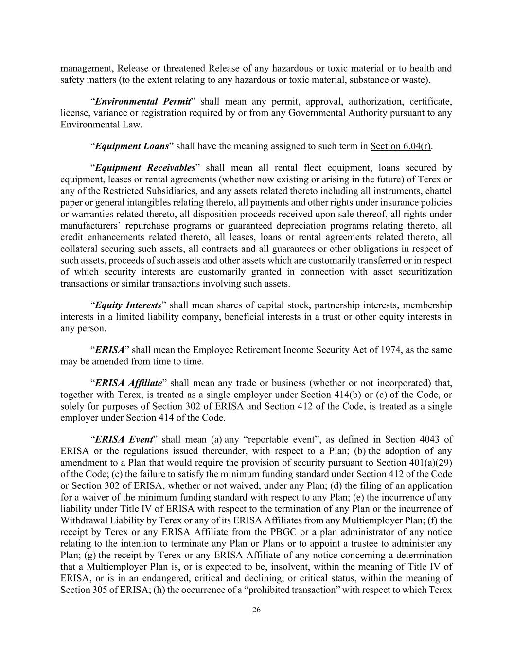 26 management, Release or threatened Release of any hazardous or toxic material or to health and safety matters (to the extent relating to any hazardous or toxic material, substance or waste). “Environmental Permit” shall mean any permit, approval, authorization, certificate, license, variance or registration required by or from any Governmental Authority pursuant to any Environmental Law. “Equipment Loans” shall have the meaning assigned to such term in Section 6.04(r). “Equipment Receivables” shall mean all rental fleet equipment, loans secured by equipment, leases or rental agreements (whether now existing or arising in the future) of Terex or any of the Restricted Subsidiaries, and any assets related thereto including all instruments, chattel paper or general intangibles relating thereto, all payments and other rights under insurance policies or warranties related thereto, all disposition proceeds received upon sale thereof, all rights under manufacturers’ repurchase programs or guaranteed depreciation programs relating thereto, all credit enhancements related thereto, all leases, loans or rental agreements related thereto, all collateral securing such assets, all contracts and all guarantees or other obligations in respect of such assets, proceeds of such assets and other assets which are customarily transferred or in respect of which security interests are customarily granted in connection with asset securitization transactions or similar transactions involving such assets. “Equity Interests” shall mean shares of capital stock, partnership interests, membership interests in a limited liability company, beneficial interests in a trust or other equity interests in any person. “ERISA” shall mean the Employee Retirement Income Security Act of 1974, as the same may be amended from time to time. “ERISA Affiliate” shall mean any trade or business (whether or not incorporated) that, together with Terex, is treated as a single employer under Section 414(b) or (c) of the Code, or solely for purposes of Section 302 of ERISA and Section 412 of the Code, is treated as a single employer under Section 414 of the Code. “ERISA Event” shall mean (a) any “reportable event”, as defined in Section 4043 of ERISA or the regulations issued thereunder, with respect to a Plan; (b) the adoption of any amendment to a Plan that would require the provision of security pursuant to Section 401(a)(29) of the Code; (c) the failure to satisfy the minimum funding standard under Section 412 of the Code or Section 302 of ERISA, whether or not waived, under any Plan; (d) the filing of an application for a waiver of the minimum funding standard with respect to any Plan; (e) the incurrence of any liability under Title IV of ERISA with respect to the termination of any Plan or the incurrence of Withdrawal Liability by Terex or any of its ERISA Affiliates from any Multiemployer Plan; (f) the receipt by Terex or any ERISA Affiliate from the PBGC or a plan administrator of any notice relating to the intention to terminate any Plan or Plans or to appoint a trustee to administer any Plan; (g) the receipt by Terex or any ERISA Affiliate of any notice concerning a determination that a Multiemployer Plan is, or is expected to be, insolvent, within the meaning of Title IV of ERISA, or is in an endangered, critical and declining, or critical status, within the meaning of Section 305 of ERISA; (h) the occurrence of a “prohibited transaction” with respect to which Terex