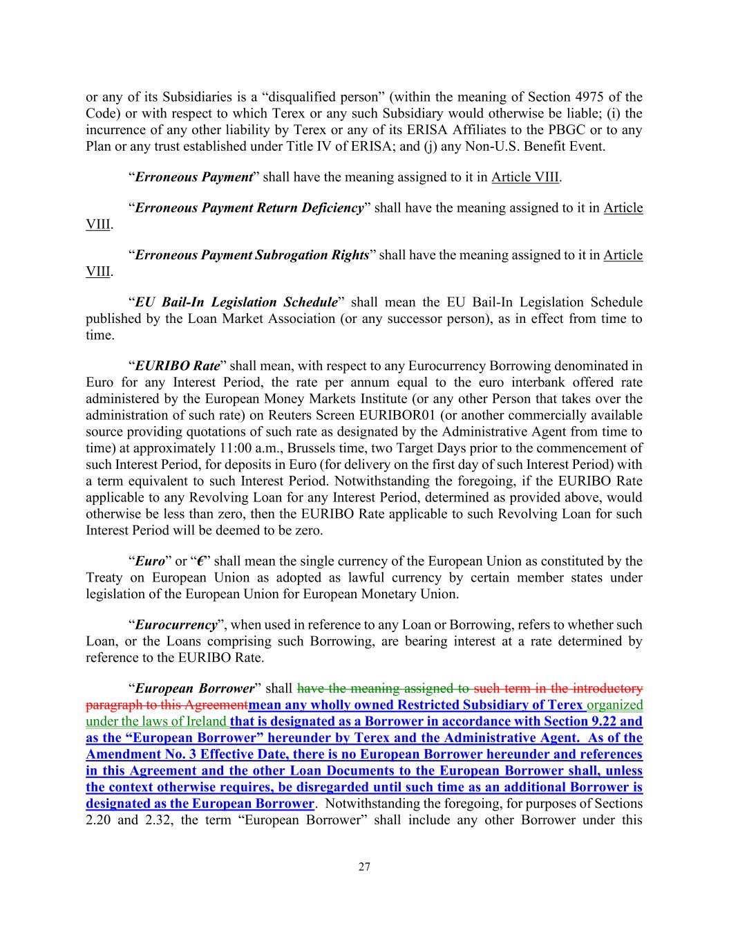 27 or any of its Subsidiaries is a “disqualified person” (within the meaning of Section 4975 of the Code) or with respect to which Terex or any such Subsidiary would otherwise be liable; (i) the incurrence of any other liability by Terex or any of its ERISA Affiliates to the PBGC or to any Plan or any trust established under Title IV of ERISA; and (j) any Non-U.S. Benefit Event. “Erroneous Payment” shall have the meaning assigned to it in Article VIII. “Erroneous Payment Return Deficiency” shall have the meaning assigned to it in Article VIII. “Erroneous Payment Subrogation Rights” shall have the meaning assigned to it in Article VIII. “EU Bail-In Legislation Schedule” shall mean the EU Bail-In Legislation Schedule published by the Loan Market Association (or any successor person), as in effect from time to time. “EURIBO Rate” shall mean, with respect to any Eurocurrency Borrowing denominated in Euro for any Interest Period, the rate per annum equal to the euro interbank offered rate administered by the European Money Markets Institute (or any other Person that takes over the administration of such rate) on Reuters Screen EURIBOR01 (or another commercially available source providing quotations of such rate as designated by the Administrative Agent from time to time) at approximately 11:00 a.m., Brussels time, two Target Days prior to the commencement of such Interest Period, for deposits in Euro (for delivery on the first day of such Interest Period) with a term equivalent to such Interest Period. Notwithstanding the foregoing, if the EURIBO Rate applicable to any Revolving Loan for any Interest Period, determined as provided above, would otherwise be less than zero, then the EURIBO Rate applicable to such Revolving Loan for such Interest Period will be deemed to be zero. “Euro” or “€” shall mean the single currency of the European Union as constituted by the Treaty on European Union as adopted as lawful currency by certain member states under legislation of the European Union for European Monetary Union. “Eurocurrency”, when used in reference to any Loan or Borrowing, refers to whether such Loan, or the Loans comprising such Borrowing, are bearing interest at a rate determined by reference to the EURIBO Rate. “European Borrower” shall have the meaning assigned to such term in the introductory paragraph to this Agreementmean any wholly owned Restricted Subsidiary of Terex organized under the laws of Ireland that is designated as a Borrower in accordance with Section 9.22 and as the “European Borrower” hereunder by Terex and the Administrative Agent. As of the Amendment No. 3 Effective Date, there is no European Borrower hereunder and references in this Agreement and the other Loan Documents to the European Borrower shall, unless the context otherwise requires, be disregarded until such time as an additional Borrower is designated as the European Borrower. Notwithstanding the foregoing, for purposes of Sections 2.20 and 2.32, the term “European Borrower” shall include any other Borrower under this