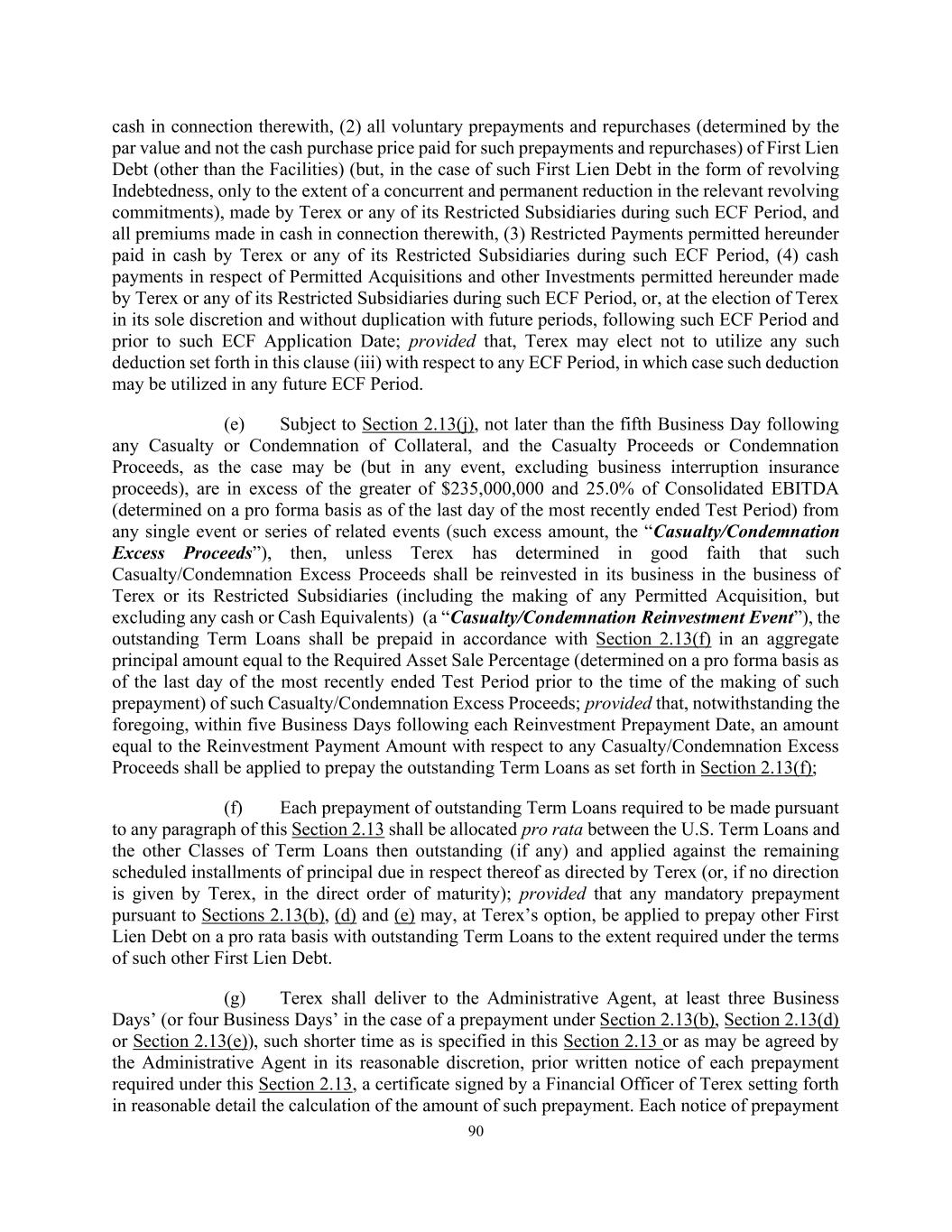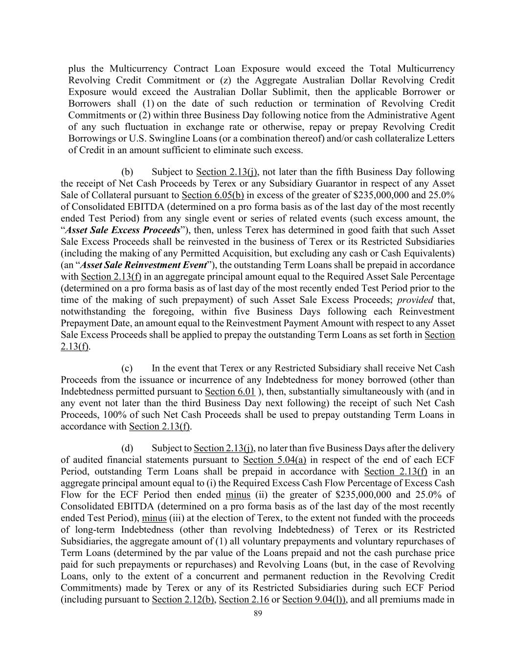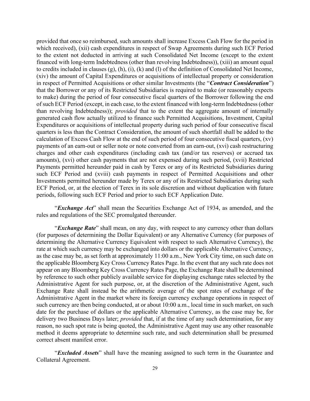 29 provided that once so reimbursed, such amounts shall increase Excess Cash Flow for the period in which received), (xii) cash expenditures in respect of Swap Agreements during such ECF Period to the extent not deducted in arriving at such Consolidated Net Income (except to the extent financed with long-term Indebtedness (other than revolving Indebtedness)), (xiii) an amount equal to credits included in clauses (g), (h), (i), (k) and (l) of the definition of Consolidated Net Income, (xiv) the amount of Capital Expenditures or acquisitions of intellectual property or consideration in respect of Permitted Acquisitions or other similar Investments (the “Contract Consideration”) that the Borrower or any of its Restricted Subsidiaries is required to make (or reasonably expects to make) during the period of four consecutive fiscal quarters of the Borrower following the end of such ECF Period (except, in each case, to the extent financed with long-term Indebtedness (other than revolving Indebtedness)); provided that to the extent the aggregate amount of internally generated cash flow actually utilized to finance such Permitted Acquisitions, Investment, Capital Expenditures or acquisitions of intellectual property during such period of four consecutive fiscal quarters is less than the Contract Consideration, the amount of such shortfall shall be added to the calculation of Excess Cash Flow at the end of such period of four consecutive fiscal quarters, (xv) payments of an earn-out or seller note or note converted from an earn-out, (xvi) cash restructuring charges and other cash expenditures (including cash tax (and/or tax reserves) or accrued tax amounts), (xvi) other cash payments that are not expensed during such period, (xvii) Restricted Payments permitted hereunder paid in cash by Terex or any of its Restricted Subsidiaries during such ECF Period and (xviii) cash payments in respect of Permitted Acquisitions and other Investments permitted hereunder made by Terex or any of its Restricted Subsidiaries during such ECF Period, or, at the election of Terex in its sole discretion and without duplication with future periods, following such ECF Period and prior to such ECF Application Date. “Exchange Act” shall mean the Securities Exchange Act of 1934, as amended, and the rules and regulations of the SEC promulgated thereunder. “Exchange Rate” shall mean, on any day, with respect to any currency other than dollars (for purposes of determining the Dollar Equivalent) or any Alternative Currency (for purposes of determining the Alternative Currency Equivalent with respect to such Alternative Currency), the rate at which such currency may be exchanged into dollars or the applicable Alternative Currency, as the case may be, as set forth at approximately 11:00 a.m., New York City time, on such date on the applicable Bloomberg Key Cross Currency Rates Page. In the event that any such rate does not appear on any Bloomberg Key Cross Currency Rates Page, the Exchange Rate shall be determined by reference to such other publicly available service for displaying exchange rates selected by the Administrative Agent for such purpose, or, at the discretion of the Administrative Agent, such Exchange Rate shall instead be the arithmetic average of the spot rates of exchange of the Administrative Agent in the market where its foreign currency exchange operations in respect of such currency are then being conducted, at or about 10:00 a.m., local time in such market, on such date for the purchase of dollars or the applicable Alternative Currency, as the case may be, for delivery two Business Days later; provided that, if at the time of any such determination, for any reason, no such spot rate is being quoted, the Administrative Agent may use any other reasonable method it deems appropriate to determine such rate, and such determination shall be presumed correct absent manifest error. “Excluded Assets” shall have the meaning assigned to such term in the Guarantee and Collateral Agreement.
