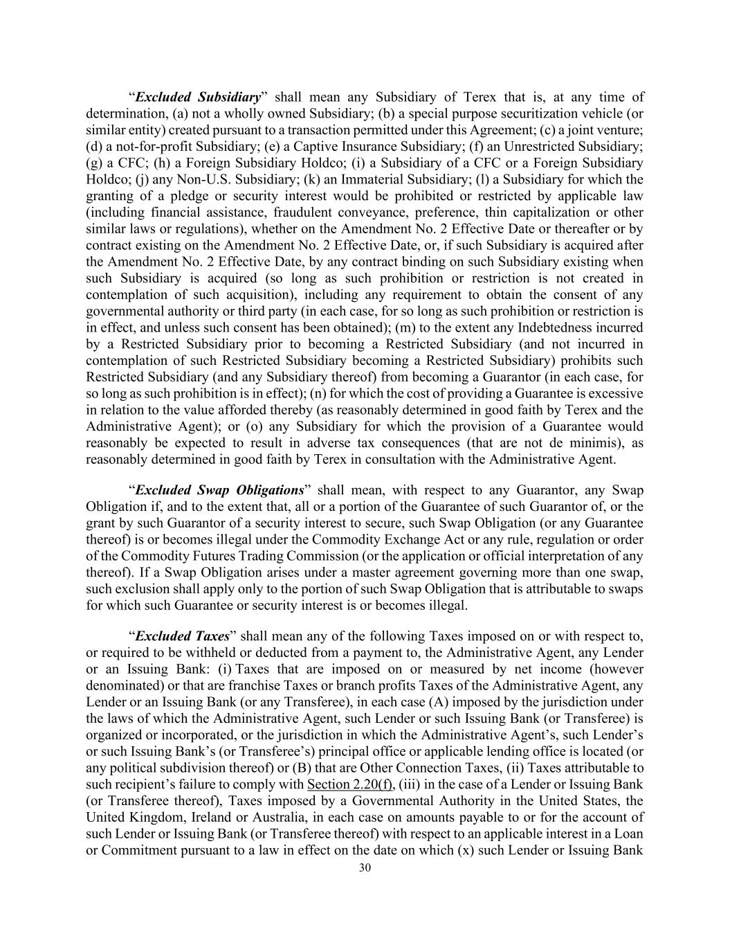 30 “Excluded Subsidiary” shall mean any Subsidiary of Terex that is, at any time of determination, (a) not a wholly owned Subsidiary; (b) a special purpose securitization vehicle (or similar entity) created pursuant to a transaction permitted under this Agreement; (c) a joint venture; (d) a not-for-profit Subsidiary; (e) a Captive Insurance Subsidiary; (f) an Unrestricted Subsidiary; (g) a CFC; (h) a Foreign Subsidiary Holdco; (i) a Subsidiary of a CFC or a Foreign Subsidiary Holdco; (j) any Non-U.S. Subsidiary; (k) an Immaterial Subsidiary; (l) a Subsidiary for which the granting of a pledge or security interest would be prohibited or restricted by applicable law (including financial assistance, fraudulent conveyance, preference, thin capitalization or other similar laws or regulations), whether on the Amendment No. 2 Effective Date or thereafter or by contract existing on the Amendment No. 2 Effective Date, or, if such Subsidiary is acquired after the Amendment No. 2 Effective Date, by any contract binding on such Subsidiary existing when such Subsidiary is acquired (so long as such prohibition or restriction is not created in contemplation of such acquisition), including any requirement to obtain the consent of any governmental authority or third party (in each case, for so long as such prohibition or restriction is in effect, and unless such consent has been obtained); (m) to the extent any Indebtedness incurred by a Restricted Subsidiary prior to becoming a Restricted Subsidiary (and not incurred in contemplation of such Restricted Subsidiary becoming a Restricted Subsidiary) prohibits such Restricted Subsidiary (and any Subsidiary thereof) from becoming a Guarantor (in each case, for so long as such prohibition is in effect); (n) for which the cost of providing a Guarantee is excessive in relation to the value afforded thereby (as reasonably determined in good faith by Terex and the Administrative Agent); or (o) any Subsidiary for which the provision of a Guarantee would reasonably be expected to result in adverse tax consequences (that are not de minimis), as reasonably determined in good faith by Terex in consultation with the Administrative Agent. “Excluded Swap Obligations” shall mean, with respect to any Guarantor, any Swap Obligation if, and to the extent that, all or a portion of the Guarantee of such Guarantor of, or the grant by such Guarantor of a security interest to secure, such Swap Obligation (or any Guarantee thereof) is or becomes illegal under the Commodity Exchange Act or any rule, regulation or order of the Commodity Futures Trading Commission (or the application or official interpretation of any thereof). If a Swap Obligation arises under a master agreement governing more than one swap, such exclusion shall apply only to the portion of such Swap Obligation that is attributable to swaps for which such Guarantee or security interest is or becomes illegal. “Excluded Taxes” shall mean any of the following Taxes imposed on or with respect to, or required to be withheld or deducted from a payment to, the Administrative Agent, any Lender or an Issuing Bank: (i) Taxes that are imposed on or measured by net income (however denominated) or that are franchise Taxes or branch profits Taxes of the Administrative Agent, any Lender or an Issuing Bank (or any Transferee), in each case (A) imposed by the jurisdiction under the laws of which the Administrative Agent, such Lender or such Issuing Bank (or Transferee) is organized or incorporated, or the jurisdiction in which the Administrative Agent’s, such Lender’s or such Issuing Bank’s (or Transferee’s) principal office or applicable lending office is located (or any political subdivision thereof) or (B) that are Other Connection Taxes, (ii) Taxes attributable to such recipient’s failure to comply with Section 2.20(f), (iii) in the case of a Lender or Issuing Bank (or Transferee thereof), Taxes imposed by a Governmental Authority in the United States, the United Kingdom, Ireland or Australia, in each case on amounts payable to or for the account of such Lender or Issuing Bank (or Transferee thereof) with respect to an applicable interest in a Loan or Commitment pursuant to a law in effect on the date on which (x) such Lender or Issuing Bank