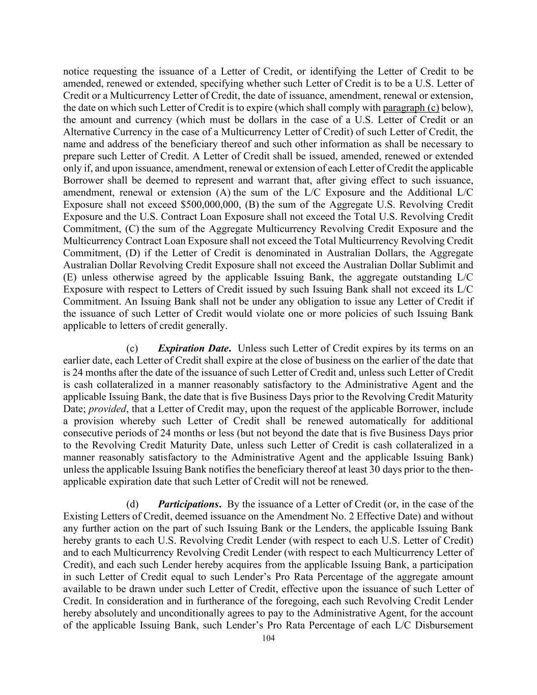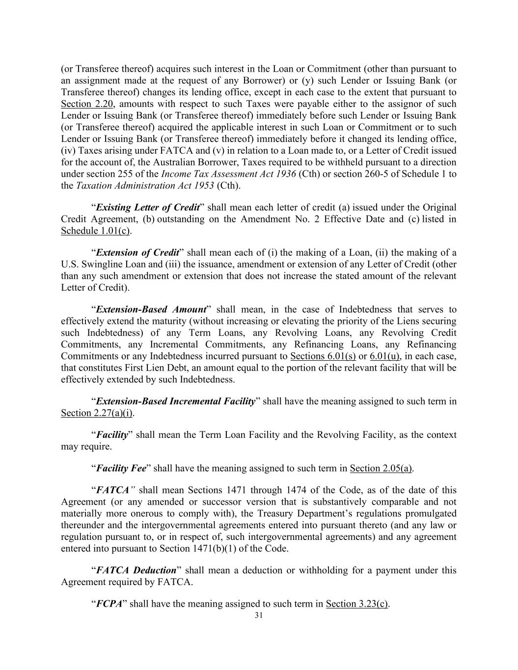 31 (or Transferee thereof) acquires such interest in the Loan or Commitment (other than pursuant to an assignment made at the request of any Borrower) or (y) such Lender or Issuing Bank (or Transferee thereof) changes its lending office, except in each case to the extent that pursuant to Section 2.20, amounts with respect to such Taxes were payable either to the assignor of such Lender or Issuing Bank (or Transferee thereof) immediately before such Lender or Issuing Bank (or Transferee thereof) acquired the applicable interest in such Loan or Commitment or to such Lender or Issuing Bank (or Transferee thereof) immediately before it changed its lending office, (iv) Taxes arising under FATCA and (v) in relation to a Loan made to, or a Letter of Credit issued for the account of, the Australian Borrower, Taxes required to be withheld pursuant to a direction under section 255 of the Income Tax Assessment Act 1936 (Cth) or section 260-5 of Schedule 1 to the Taxation Administration Act 1953 (Cth). “Existing Letter of Credit” shall mean each letter of credit (a) issued under the Original Credit Agreement, (b) outstanding on the Amendment No. 2 Effective Date and (c) listed in Schedule 1.01(c). “Extension of Credit” shall mean each of (i) the making of a Loan, (ii) the making of a U.S. Swingline Loan and (iii) the issuance, amendment or extension of any Letter of Credit (other than any such amendment or extension that does not increase the stated amount of the relevant Letter of Credit). “Extension-Based Amount” shall mean, in the case of Indebtedness that serves to effectively extend the maturity (without increasing or elevating the priority of the Liens securing such Indebtedness) of any Term Loans, any Revolving Loans, any Revolving Credit Commitments, any Incremental Commitments, any Refinancing Loans, any Refinancing Commitments or any Indebtedness incurred pursuant to Sections 6.01(s) or 6.01(u), in each case, that constitutes First Lien Debt, an amount equal to the portion of the relevant facility that will be effectively extended by such Indebtedness. “Extension-Based Incremental Facility” shall have the meaning assigned to such term in Section 2.27(a)(i). “Facility” shall mean the Term Loan Facility and the Revolving Facility, as the context may require. “Facility Fee” shall have the meaning assigned to such term in Section 2.05(a). “FATCA” shall mean Sections 1471 through 1474 of the Code, as of the date of this Agreement (or any amended or successor version that is substantively comparable and not materially more onerous to comply with), the Treasury Department’s regulations promulgated thereunder and the intergovernmental agreements entered into pursuant thereto (and any law or regulation pursuant to, or in respect of, such intergovernmental agreements) and any agreement entered into pursuant to Section 1471(b)(1) of the Code. “FATCA Deduction” shall mean a deduction or withholding for a payment under this Agreement required by FATCA. “FCPA” shall have the meaning assigned to such term in Section 3.23(c).