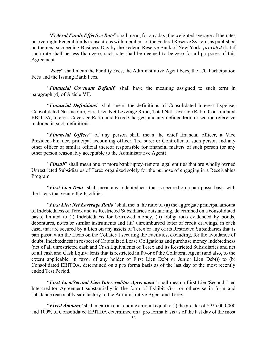 32 “Federal Funds Effective Rate” shall mean, for any day, the weighted average of the rates on overnight Federal funds transactions with members of the Federal Reserve System, as published on the next succeeding Business Day by the Federal Reserve Bank of New York; provided that if such rate shall be less than zero, such rate shall be deemed to be zero for all purposes of this Agreement. “Fees” shall mean the Facility Fees, the Administrative Agent Fees, the L/C Participation Fees and the Issuing Bank Fees. “Financial Covenant Default” shall have the meaning assigned to such term in paragraph (d) of Article VII. “Financial Definitions” shall mean the definitions of Consolidated Interest Expense, Consolidated Net Income, First Lien Net Leverage Ratio, Total Net Leverage Ratio, Consolidated EBITDA, Interest Coverage Ratio, and Fixed Charges, and any defined term or section reference included in such definitions. “Financial Officer” of any person shall mean the chief financial officer, a Vice President-Finance, principal accounting officer, Treasurer or Controller of such person and any other officer or similar official thereof responsible for financial matters of such person (or any other person reasonably acceptable to the Administrative Agent). “Finsub” shall mean one or more bankruptcy-remote legal entities that are wholly owned Unrestricted Subsidiaries of Terex organized solely for the purpose of engaging in a Receivables Program. “First Lien Debt” shall mean any Indebtedness that is secured on a pari passu basis with the Liens that secure the Facilities. “First Lien Net Leverage Ratio” shall mean the ratio of (a) the aggregate principal amount of Indebtedness of Terex and its Restricted Subsidiaries outstanding, determined on a consolidated basis, limited to (i) Indebtedness for borrowed money, (ii) obligations evidenced by bonds, debentures, notes or similar instruments and (iii) unreimbursed letter of credit drawings, in each case, that are secured by a Lien on any assets of Terex or any of its Restricted Subsidiaries that is pari passu with the Liens on the Collateral securing the Facilities, excluding, for the avoidance of doubt, Indebtedness in respect of Capitalized Lease Obligations and purchase money Indebtedness (net of all unrestricted cash and Cash Equivalents of Terex and its Restricted Subsidiaries and net of all cash and Cash Equivalents that is restricted in favor of the Collateral Agent (and also, to the extent applicable, in favor of any holder of First Lien Debt or Junior Lien Debt)) to (b) Consolidated EBITDA, determined on a pro forma basis as of the last day of the most recently ended Test Period. “First Lien/Second Lien Intercreditor Agreement” shall mean a First Lien/Second Lien Intercreditor Agreement substantially in the form of Exhibit G-1, or otherwise in form and substance reasonably satisfactory to the Administrative Agent and Terex. “Fixed Amount” shall mean an outstanding amount equal to (i) the greater of $925,000,000 and 100% of Consolidated EBITDA determined on a pro forma basis as of the last day of the most