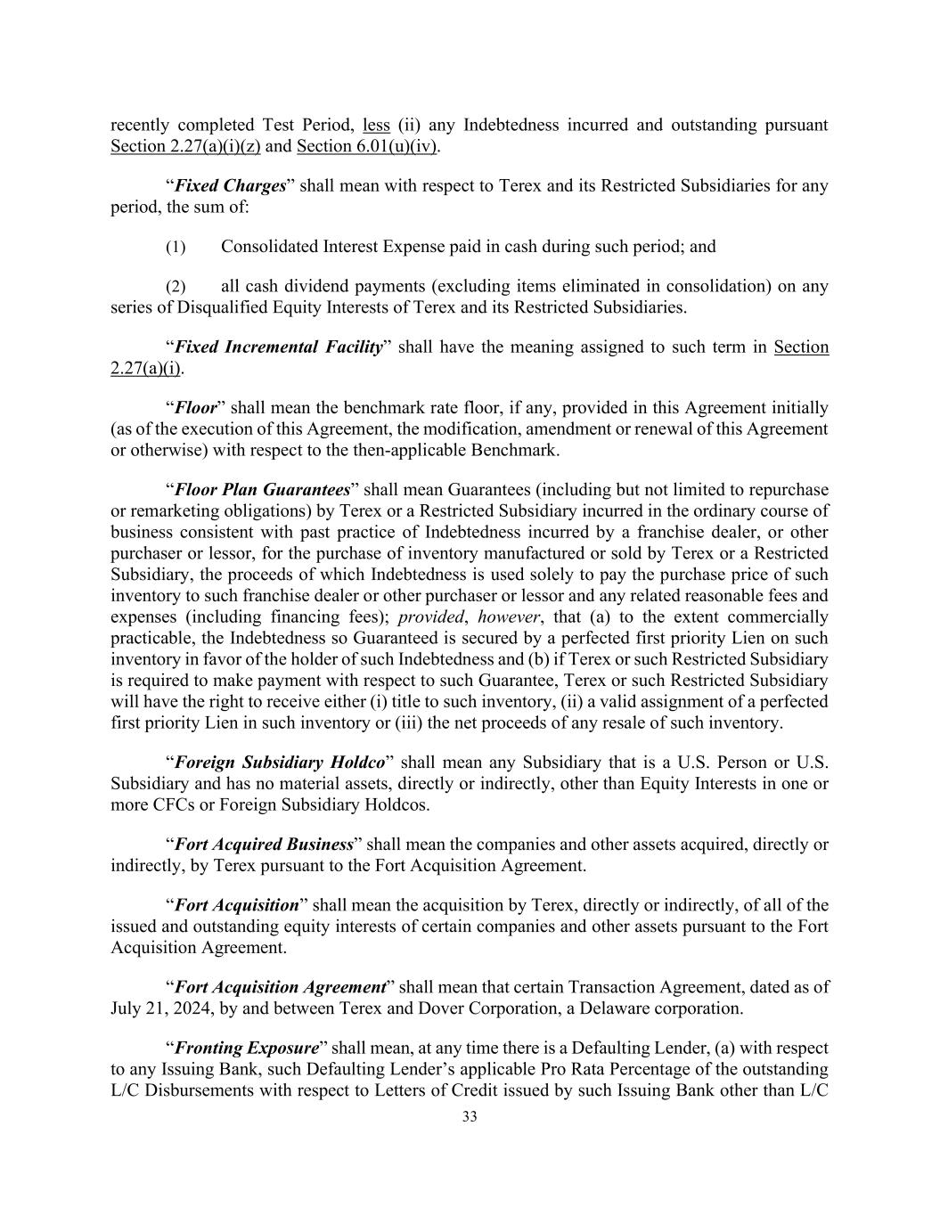 33 recently completed Test Period, less (ii) any Indebtedness incurred and outstanding pursuant Section 2.27(a)(i)(z) and Section 6.01(u)(iv). “Fixed Charges” shall mean with respect to Terex and its Restricted Subsidiaries for any period, the sum of: (1) Consolidated Interest Expense paid in cash during such period; and (2) all cash dividend payments (excluding items eliminated in consolidation) on any series of Disqualified Equity Interests of Terex and its Restricted Subsidiaries. “Fixed Incremental Facility” shall have the meaning assigned to such term in Section 2.27(a)(i). “Floor” shall mean the benchmark rate floor, if any, provided in this Agreement initially (as of the execution of this Agreement, the modification, amendment or renewal of this Agreement or otherwise) with respect to the then-applicable Benchmark. “Floor Plan Guarantees” shall mean Guarantees (including but not limited to repurchase or remarketing obligations) by Terex or a Restricted Subsidiary incurred in the ordinary course of business consistent with past practice of Indebtedness incurred by a franchise dealer, or other purchaser or lessor, for the purchase of inventory manufactured or sold by Terex or a Restricted Subsidiary, the proceeds of which Indebtedness is used solely to pay the purchase price of such inventory to such franchise dealer or other purchaser or lessor and any related reasonable fees and expenses (including financing fees); provided, however, that (a) to the extent commercially practicable, the Indebtedness so Guaranteed is secured by a perfected first priority Lien on such inventory in favor of the holder of such Indebtedness and (b) if Terex or such Restricted Subsidiary is required to make payment with respect to such Guarantee, Terex or such Restricted Subsidiary will have the right to receive either (i) title to such inventory, (ii) a valid assignment of a perfected first priority Lien in such inventory or (iii) the net proceeds of any resale of such inventory. “Foreign Subsidiary Holdco” shall mean any Subsidiary that is a U.S. Person or U.S. Subsidiary and has no material assets, directly or indirectly, other than Equity Interests in one or more CFCs or Foreign Subsidiary Holdcos. “Fort Acquired Business” shall mean the companies and other assets acquired, directly or indirectly, by Terex pursuant to the Fort Acquisition Agreement. “Fort Acquisition” shall mean the acquisition by Terex, directly or indirectly, of all of the issued and outstanding equity interests of certain companies and other assets pursuant to the Fort Acquisition Agreement. “Fort Acquisition Agreement” shall mean that certain Transaction Agreement, dated as of July 21, 2024, by and between Terex and Dover Corporation, a Delaware corporation. “Fronting Exposure” shall mean, at any time there is a Defaulting Lender, (a) with respect to any Issuing Bank, such Defaulting Lender’s applicable Pro Rata Percentage of the outstanding L/C Disbursements with respect to Letters of Credit issued by such Issuing Bank other than L/C