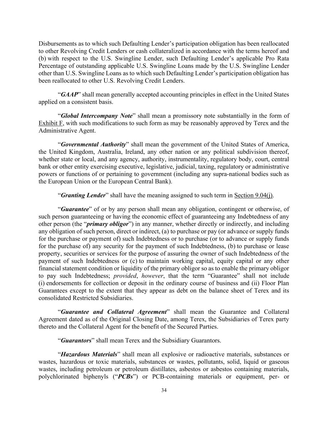 34 Disbursements as to which such Defaulting Lender’s participation obligation has been reallocated to other Revolving Credit Lenders or cash collateralized in accordance with the terms hereof and (b) with respect to the U.S. Swingline Lender, such Defaulting Lender’s applicable Pro Rata Percentage of outstanding applicable U.S. Swingline Loans made by the U.S. Swingline Lender other than U.S. Swingline Loans as to which such Defaulting Lender’s participation obligation has been reallocated to other U.S. Revolving Credit Lenders. “GAAP” shall mean generally accepted accounting principles in effect in the United States applied on a consistent basis. “Global Intercompany Note” shall mean a promissory note substantially in the form of Exhibit F, with such modifications to such form as may be reasonably approved by Terex and the Administrative Agent. “Governmental Authority” shall mean the government of the United States of America, the United Kingdom, Australia, Ireland, any other nation or any political subdivision thereof, whether state or local, and any agency, authority, instrumentality, regulatory body, court, central bank or other entity exercising executive, legislative, judicial, taxing, regulatory or administrative powers or functions of or pertaining to government (including any supra-national bodies such as the European Union or the European Central Bank). “Granting Lender” shall have the meaning assigned to such term in Section 9.04(j). “Guarantee” of or by any person shall mean any obligation, contingent or otherwise, of such person guaranteeing or having the economic effect of guaranteeing any Indebtedness of any other person (the “primary obligor”) in any manner, whether directly or indirectly, and including any obligation of such person, direct or indirect, (a) to purchase or pay (or advance or supply funds for the purchase or payment of) such Indebtedness or to purchase (or to advance or supply funds for the purchase of) any security for the payment of such Indebtedness, (b) to purchase or lease property, securities or services for the purpose of assuring the owner of such Indebtedness of the payment of such Indebtedness or (c) to maintain working capital, equity capital or any other financial statement condition or liquidity of the primary obligor so as to enable the primary obligor to pay such Indebtedness; provided, however, that the term “Guarantee” shall not include (i) endorsements for collection or deposit in the ordinary course of business and (ii) Floor Plan Guarantees except to the extent that they appear as debt on the balance sheet of Terex and its consolidated Restricted Subsidiaries. “Guarantee and Collateral Agreement” shall mean the Guarantee and Collateral Agreement dated as of the Original Closing Date, among Terex, the Subsidiaries of Terex party thereto and the Collateral Agent for the benefit of the Secured Parties. “Guarantors” shall mean Terex and the Subsidiary Guarantors. “Hazardous Materials” shall mean all explosive or radioactive materials, substances or wastes, hazardous or toxic materials, substances or wastes, pollutants, solid, liquid or gaseous wastes, including petroleum or petroleum distillates, asbestos or asbestos containing materials, polychlorinated biphenyls (“PCBs”) or PCB-containing materials or equipment, per- or