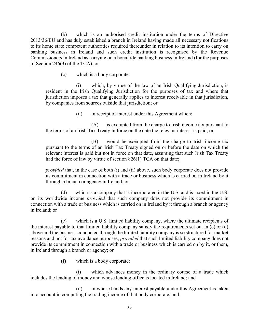 39 (b) which is an authorised credit institution under the terms of Directive 2013/36/EU and has duly established a branch in Ireland having made all necessary notifications to its home state competent authorities required thereunder in relation to its intention to carry on banking business in Ireland and such credit institution is recognised by the Revenue Commissioners in Ireland as carrying on a bona fide banking business in Ireland (for the purposes of Section 246(3) of the TCA); or (c) which is a body corporate: (i) which, by virtue of the law of an Irish Qualifying Jurisdiction, is resident in the Irish Qualifying Jurisdiction for the purposes of tax and where that jurisdiction imposes a tax that generally applies to interest receivable in that jurisdiction, by companies from sources outside that jurisdiction; or (ii) in receipt of interest under this Agreement which: (A) is exempted from the charge to Irish income tax pursuant to the terms of an Irish Tax Treaty in force on the date the relevant interest is paid; or (B) would be exempted from the charge to Irish income tax pursuant to the terms of an Irish Tax Treaty signed on or before the date on which the relevant interest is paid but not in force on that date, assuming that such Irish Tax Treaty had the force of law by virtue of section 826(1) TCA on that date; provided that, in the case of both (i) and (ii) above, such body corporate does not provide its commitment in connection with a trade or business which is carried on in Ireland by it through a branch or agency in Ireland; or (d) which is a company that is incorporated in the U.S. and is taxed in the U.S. on its worldwide income provided that such company does not provide its commitment in connection with a trade or business which is carried on in Ireland by it through a branch or agency in Ireland; or (e) which is a U.S. limited liability company, where the ultimate recipients of the interest payable to that limited liability company satisfy the requirements set out in (c) or (d) above and the business conducted through the limited liability company is so structured for market reasons and not for tax avoidance purposes, provided that such limited liability company does not provide its commitment in connection with a trade or business which is carried on by it, or them, in Ireland through a branch or agency; or (f) which is a body corporate: (i) which advances money in the ordinary course of a trade which includes the lending of money and whose lending office is located in Ireland; and (ii) in whose hands any interest payable under this Agreement is taken into account in computing the trading income of that body corporate; and
