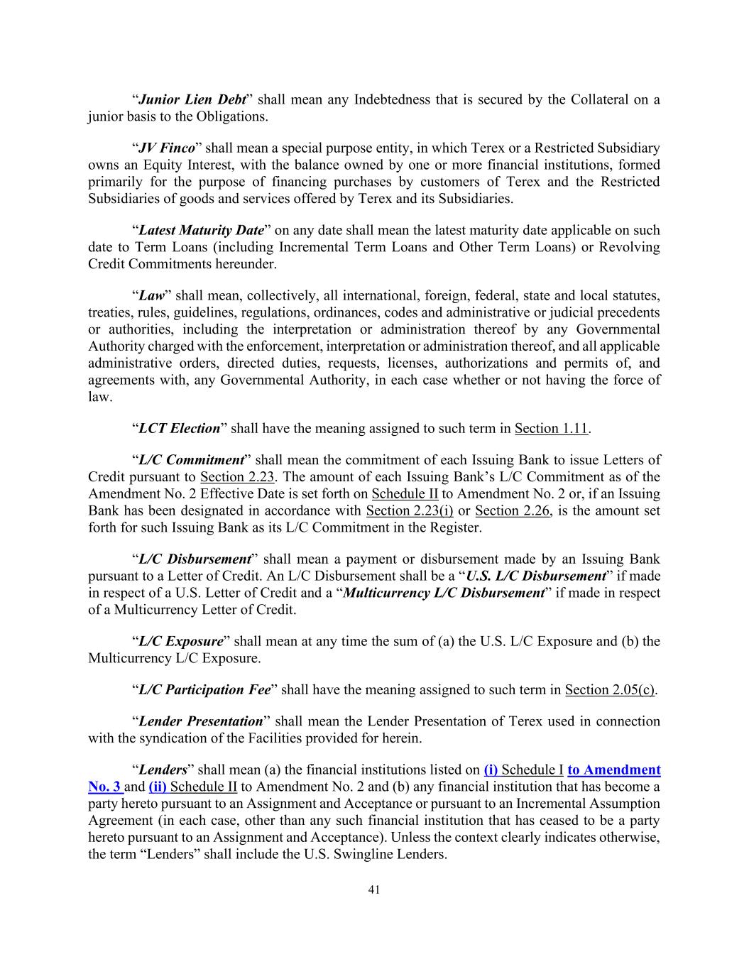 41 “Junior Lien Debt” shall mean any Indebtedness that is secured by the Collateral on a junior basis to the Obligations. “JV Finco” shall mean a special purpose entity, in which Terex or a Restricted Subsidiary owns an Equity Interest, with the balance owned by one or more financial institutions, formed primarily for the purpose of financing purchases by customers of Terex and the Restricted Subsidiaries of goods and services offered by Terex and its Subsidiaries. “Latest Maturity Date” on any date shall mean the latest maturity date applicable on such date to Term Loans (including Incremental Term Loans and Other Term Loans) or Revolving Credit Commitments hereunder. “Law” shall mean, collectively, all international, foreign, federal, state and local statutes, treaties, rules, guidelines, regulations, ordinances, codes and administrative or judicial precedents or authorities, including the interpretation or administration thereof by any Governmental Authority charged with the enforcement, interpretation or administration thereof, and all applicable administrative orders, directed duties, requests, licenses, authorizations and permits of, and agreements with, any Governmental Authority, in each case whether or not having the force of law. “LCT Election” shall have the meaning assigned to such term in Section 1.11. “L/C Commitment” shall mean the commitment of each Issuing Bank to issue Letters of Credit pursuant to Section 2.23. The amount of each Issuing Bank’s L/C Commitment as of the Amendment No. 2 Effective Date is set forth on Schedule II to Amendment No. 2 or, if an Issuing Bank has been designated in accordance with Section 2.23(i) or Section 2.26, is the amount set forth for such Issuing Bank as its L/C Commitment in the Register. “L/C Disbursement” shall mean a payment or disbursement made by an Issuing Bank pursuant to a Letter of Credit. An L/C Disbursement shall be a “U.S. L/C Disbursement” if made in respect of a U.S. Letter of Credit and a “Multicurrency L/C Disbursement” if made in respect of a Multicurrency Letter of Credit. “L/C Exposure” shall mean at any time the sum of (a) the U.S. L/C Exposure and (b) the Multicurrency L/C Exposure. “L/C Participation Fee” shall have the meaning assigned to such term in Section 2.05(c). “Lender Presentation” shall mean the Lender Presentation of Terex used in connection with the syndication of the Facilities provided for herein. “Lenders” shall mean (a) the financial institutions listed on (i) Schedule I to Amendment No. 3 and (ii) Schedule II to Amendment No. 2 and (b) any financial institution that has become a party hereto pursuant to an Assignment and Acceptance or pursuant to an Incremental Assumption Agreement (in each case, other than any such financial institution that has ceased to be a party hereto pursuant to an Assignment and Acceptance). Unless the context clearly indicates otherwise, the term “Lenders” shall include the U.S. Swingline Lenders.