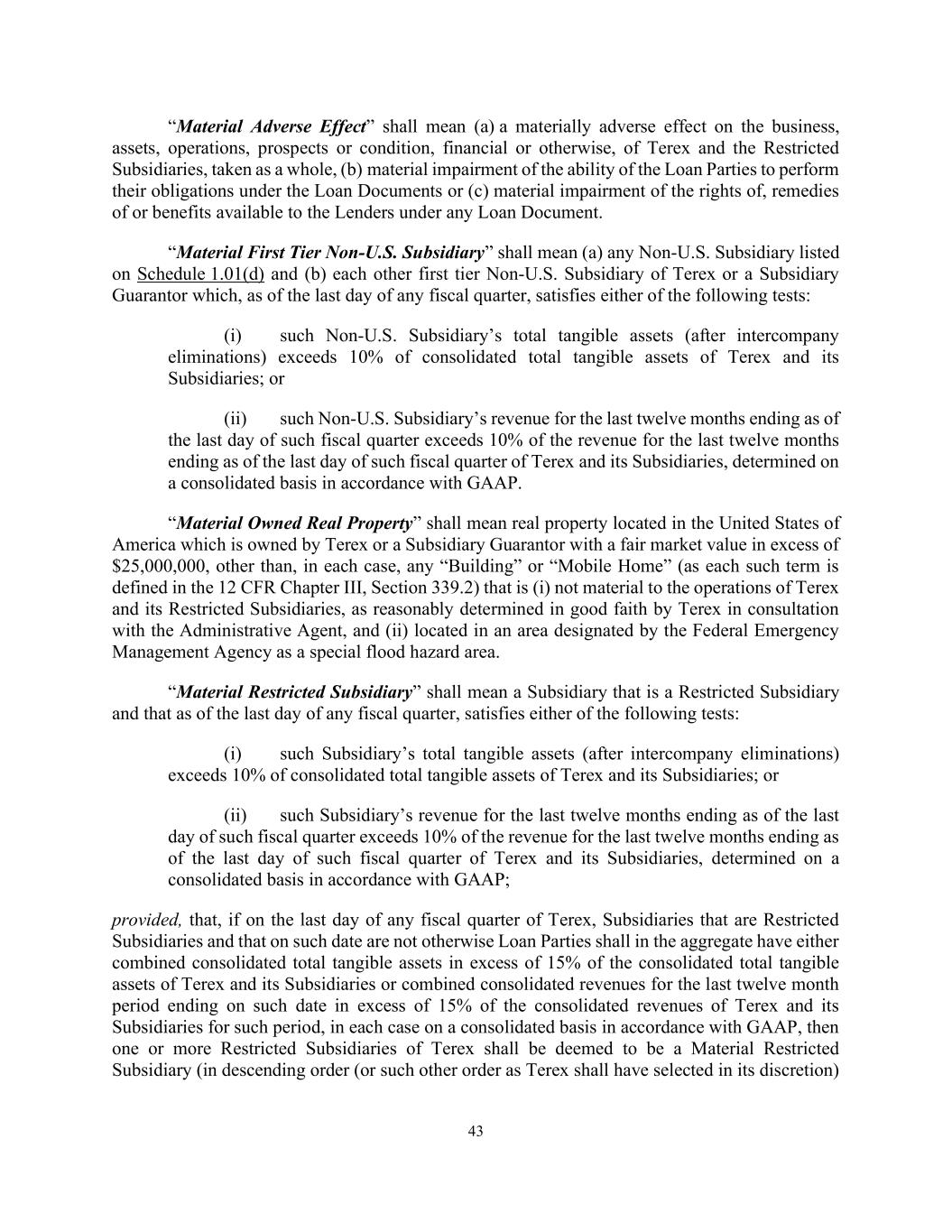43 “Material Adverse Effect” shall mean (a) a materially adverse effect on the business, assets, operations, prospects or condition, financial or otherwise, of Terex and the Restricted Subsidiaries, taken as a whole, (b) material impairment of the ability of the Loan Parties to perform their obligations under the Loan Documents or (c) material impairment of the rights of, remedies of or benefits available to the Lenders under any Loan Document. “Material First Tier Non-U.S. Subsidiary” shall mean (a) any Non-U.S. Subsidiary listed on Schedule 1.01(d) and (b) each other first tier Non-U.S. Subsidiary of Terex or a Subsidiary Guarantor which, as of the last day of any fiscal quarter, satisfies either of the following tests: (i) such Non-U.S. Subsidiary’s total tangible assets (after intercompany eliminations) exceeds 10% of consolidated total tangible assets of Terex and its Subsidiaries; or (ii) such Non-U.S. Subsidiary’s revenue for the last twelve months ending as of the last day of such fiscal quarter exceeds 10% of the revenue for the last twelve months ending as of the last day of such fiscal quarter of Terex and its Subsidiaries, determined on a consolidated basis in accordance with GAAP. “Material Owned Real Property” shall mean real property located in the United States of America which is owned by Terex or a Subsidiary Guarantor with a fair market value in excess of $25,000,000, other than, in each case, any “Building” or “Mobile Home” (as each such term is defined in the 12 CFR Chapter III, Section 339.2) that is (i) not material to the operations of Terex and its Restricted Subsidiaries, as reasonably determined in good faith by Terex in consultation with the Administrative Agent, and (ii) located in an area designated by the Federal Emergency Management Agency as a special flood hazard area. “Material Restricted Subsidiary” shall mean a Subsidiary that is a Restricted Subsidiary and that as of the last day of any fiscal quarter, satisfies either of the following tests: (i) such Subsidiary’s total tangible assets (after intercompany eliminations) exceeds 10% of consolidated total tangible assets of Terex and its Subsidiaries; or (ii) such Subsidiary’s revenue for the last twelve months ending as of the last day of such fiscal quarter exceeds 10% of the revenue for the last twelve months ending as of the last day of such fiscal quarter of Terex and its Subsidiaries, determined on a consolidated basis in accordance with GAAP; provided, that, if on the last day of any fiscal quarter of Terex, Subsidiaries that are Restricted Subsidiaries and that on such date are not otherwise Loan Parties shall in the aggregate have either combined consolidated total tangible assets in excess of 15% of the consolidated total tangible assets of Terex and its Subsidiaries or combined consolidated revenues for the last twelve month period ending on such date in excess of 15% of the consolidated revenues of Terex and its Subsidiaries for such period, in each case on a consolidated basis in accordance with GAAP, then one or more Restricted Subsidiaries of Terex shall be deemed to be a Material Restricted Subsidiary (in descending order (or such other order as Terex shall have selected in its discretion)