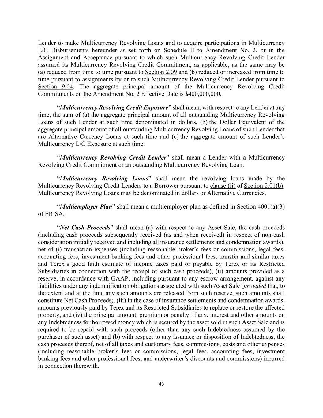 45 Lender to make Multicurrency Revolving Loans and to acquire participations in Multicurrency L/C Disbursements hereunder as set forth on Schedule II to Amendment No. 2, or in the Assignment and Acceptance pursuant to which such Multicurrency Revolving Credit Lender assumed its Multicurrency Revolving Credit Commitment, as applicable, as the same may be (a) reduced from time to time pursuant to Section 2.09 and (b) reduced or increased from time to time pursuant to assignments by or to such Multicurrency Revolving Credit Lender pursuant to Section 9.04. The aggregate principal amount of the Multicurrency Revolving Credit Commitments on the Amendment No. 2 Effective Date is $400,000,000. “Multicurrency Revolving Credit Exposure” shall mean, with respect to any Lender at any time, the sum of (a) the aggregate principal amount of all outstanding Multicurrency Revolving Loans of such Lender at such time denominated in dollars, (b) the Dollar Equivalent of the aggregate principal amount of all outstanding Multicurrency Revolving Loans of such Lender that are Alternative Currency Loans at such time and (c) the aggregate amount of such Lender’s Multicurrency L/C Exposure at such time. “Multicurrency Revolving Credit Lender” shall mean a Lender with a Multicurrency Revolving Credit Commitment or an outstanding Multicurrency Revolving Loan. “Multicurrency Revolving Loans” shall mean the revolving loans made by the Multicurrency Revolving Credit Lenders to a Borrower pursuant to clause (ii) of Section 2.01(b). Multicurrency Revolving Loans may be denominated in dollars or Alternative Currencies. “Multiemployer Plan” shall mean a multiemployer plan as defined in Section 4001(a)(3) of ERISA. “Net Cash Proceeds” shall mean (a) with respect to any Asset Sale, the cash proceeds (including cash proceeds subsequently received (as and when received) in respect of non-cash consideration initially received and including all insurance settlements and condemnation awards), net of (i) transaction expenses (including reasonable broker’s fees or commissions, legal fees, accounting fees, investment banking fees and other professional fees, transfer and similar taxes and Terex’s good faith estimate of income taxes paid or payable by Terex or its Restricted Subsidiaries in connection with the receipt of such cash proceeds), (ii) amounts provided as a reserve, in accordance with GAAP, including pursuant to any escrow arrangement, against any liabilities under any indemnification obligations associated with such Asset Sale (provided that, to the extent and at the time any such amounts are released from such reserve, such amounts shall constitute Net Cash Proceeds), (iii) in the case of insurance settlements and condemnation awards, amounts previously paid by Terex and its Restricted Subsidiaries to replace or restore the affected property, and (iv) the principal amount, premium or penalty, if any, interest and other amounts on any Indebtedness for borrowed money which is secured by the asset sold in such Asset Sale and is required to be repaid with such proceeds (other than any such Indebtedness assumed by the purchaser of such asset) and (b) with respect to any issuance or disposition of Indebtedness, the cash proceeds thereof, net of all taxes and customary fees, commissions, costs and other expenses (including reasonable broker’s fees or commissions, legal fees, accounting fees, investment banking fees and other professional fees, and underwriter’s discounts and commissions) incurred in connection therewith.