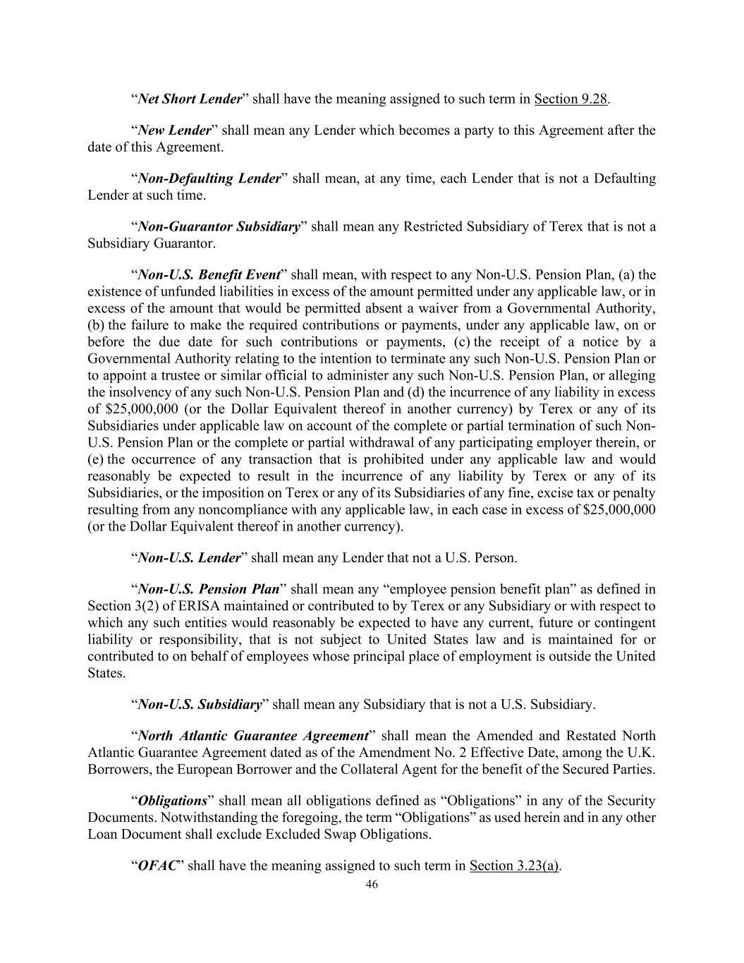 46 “Net Short Lender” shall have the meaning assigned to such term in Section 9.28. “New Lender” shall mean any Lender which becomes a party to this Agreement after the date of this Agreement. “Non-Defaulting Lender” shall mean, at any time, each Lender that is not a Defaulting Lender at such time. “Non-Guarantor Subsidiary” shall mean any Restricted Subsidiary of Terex that is not a Subsidiary Guarantor. “Non-U.S. Benefit Event” shall mean, with respect to any Non-U.S. Pension Plan, (a) the existence of unfunded liabilities in excess of the amount permitted under any applicable law, or in excess of the amount that would be permitted absent a waiver from a Governmental Authority, (b) the failure to make the required contributions or payments, under any applicable law, on or before the due date for such contributions or payments, (c) the receipt of a notice by a Governmental Authority relating to the intention to terminate any such Non-U.S. Pension Plan or to appoint a trustee or similar official to administer any such Non-U.S. Pension Plan, or alleging the insolvency of any such Non-U.S. Pension Plan and (d) the incurrence of any liability in excess of $25,000,000 (or the Dollar Equivalent thereof in another currency) by Terex or any of its Subsidiaries under applicable law on account of the complete or partial termination of such Non- U.S. Pension Plan or the complete or partial withdrawal of any participating employer therein, or (e) the occurrence of any transaction that is prohibited under any applicable law and would reasonably be expected to result in the incurrence of any liability by Terex or any of its Subsidiaries, or the imposition on Terex or any of its Subsidiaries of any fine, excise tax or penalty resulting from any noncompliance with any applicable law, in each case in excess of $25,000,000 (or the Dollar Equivalent thereof in another currency). “Non-U.S. Lender” shall mean any Lender that not a U.S. Person. “Non-U.S. Pension Plan” shall mean any “employee pension benefit plan” as defined in Section 3(2) of ERISA maintained or contributed to by Terex or any Subsidiary or with respect to which any such entities would reasonably be expected to have any current, future or contingent liability or responsibility, that is not subject to United States law and is maintained for or contributed to on behalf of employees whose principal place of employment is outside the United States. “Non-U.S. Subsidiary” shall mean any Subsidiary that is not a U.S. Subsidiary. “North Atlantic Guarantee Agreement” shall mean the Amended and Restated North Atlantic Guarantee Agreement dated as of the Amendment No. 2 Effective Date, among the U.K. Borrowers, the European Borrower and the Collateral Agent for the benefit of the Secured Parties. “Obligations” shall mean all obligations defined as “Obligations” in any of the Security Documents. Notwithstanding the foregoing, the term “Obligations” as used herein and in any other Loan Document shall exclude Excluded Swap Obligations. “OFAC” shall have the meaning assigned to such term in Section 3.23(a).