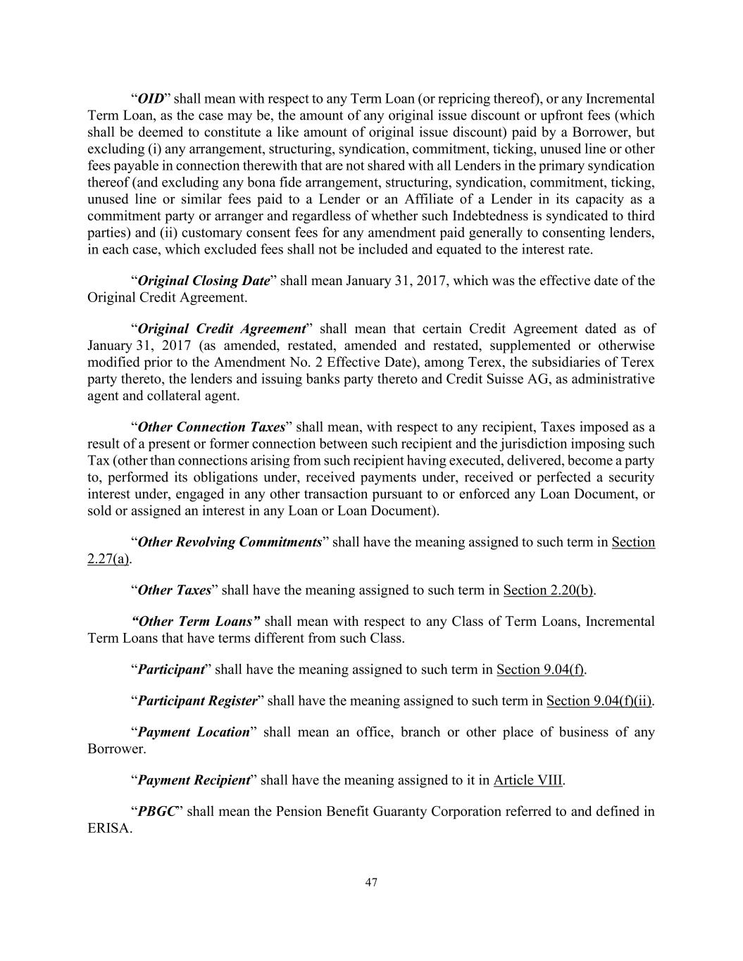 47 “OID” shall mean with respect to any Term Loan (or repricing thereof), or any Incremental Term Loan, as the case may be, the amount of any original issue discount or upfront fees (which shall be deemed to constitute a like amount of original issue discount) paid by a Borrower, but excluding (i) any arrangement, structuring, syndication, commitment, ticking, unused line or other fees payable in connection therewith that are not shared with all Lenders in the primary syndication thereof (and excluding any bona fide arrangement, structuring, syndication, commitment, ticking, unused line or similar fees paid to a Lender or an Affiliate of a Lender in its capacity as a commitment party or arranger and regardless of whether such Indebtedness is syndicated to third parties) and (ii) customary consent fees for any amendment paid generally to consenting lenders, in each case, which excluded fees shall not be included and equated to the interest rate. “Original Closing Date” shall mean January 31, 2017, which was the effective date of the Original Credit Agreement. “Original Credit Agreement” shall mean that certain Credit Agreement dated as of January 31, 2017 (as amended, restated, amended and restated, supplemented or otherwise modified prior to the Amendment No. 2 Effective Date), among Terex, the subsidiaries of Terex party thereto, the lenders and issuing banks party thereto and Credit Suisse AG, as administrative agent and collateral agent. “Other Connection Taxes” shall mean, with respect to any recipient, Taxes imposed as a result of a present or former connection between such recipient and the jurisdiction imposing such Tax (other than connections arising from such recipient having executed, delivered, become a party to, performed its obligations under, received payments under, received or perfected a security interest under, engaged in any other transaction pursuant to or enforced any Loan Document, or sold or assigned an interest in any Loan or Loan Document). “Other Revolving Commitments” shall have the meaning assigned to such term in Section 2.27(a). “Other Taxes” shall have the meaning assigned to such term in Section 2.20(b). “Other Term Loans” shall mean with respect to any Class of Term Loans, Incremental Term Loans that have terms different from such Class. “Participant” shall have the meaning assigned to such term in Section 9.04(f). “Participant Register” shall have the meaning assigned to such term in Section 9.04(f)(ii). “Payment Location” shall mean an office, branch or other place of business of any Borrower. “Payment Recipient” shall have the meaning assigned to it in Article VIII. “PBGC” shall mean the Pension Benefit Guaranty Corporation referred to and defined in ERISA.
