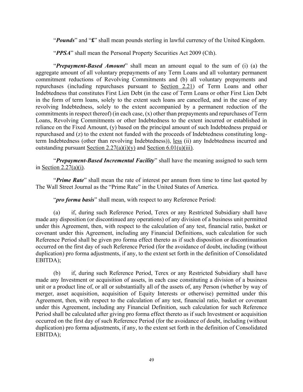 49 “Pounds” and “£” shall mean pounds sterling in lawful currency of the United Kingdom. “PPSA” shall mean the Personal Property Securities Act 2009 (Cth). “Prepayment-Based Amount” shall mean an amount equal to the sum of (i) (a) the aggregate amount of all voluntary prepayments of any Term Loans and all voluntary permanent commitment reductions of Revolving Commitments and (b) all voluntary prepayments and repurchases (including repurchases pursuant to Section 2.21) of Term Loans and other Indebtedness that constitutes First Lien Debt (in the case of Term Loans or other First Lien Debt in the form of term loans, solely to the extent such loans are cancelled, and in the case of any revolving Indebtedness, solely to the extent accompanied by a permanent reduction of the commitments in respect thereof) (in each case, (x) other than prepayments and repurchases of Term Loans, Revolving Commitments or other Indebtedness to the extent incurred or established in reliance on the Fixed Amount, (y) based on the principal amount of such Indebtedness prepaid or repurchased and (z) to the extent not funded with the proceeds of Indebtedness constituting long- term Indebtedness (other than revolving Indebtedness)), less (ii) any Indebtedness incurred and outstanding pursuant Section 2.27(a)(i)(y) and Section 6.01(u)(iii). “Prepayment-Based Incremental Facility” shall have the meaning assigned to such term in Section 2.27(a)(i). “Prime Rate” shall mean the rate of interest per annum from time to time last quoted by The Wall Street Journal as the “Prime Rate” in the United States of America. “pro forma basis” shall mean, with respect to any Reference Period: (a) if, during such Reference Period, Terex or any Restricted Subsidiary shall have made any disposition (or discontinued any operations) of any division of a business unit permitted under this Agreement, then, with respect to the calculation of any test, financial ratio, basket or covenant under this Agreement, including any Financial Definitions, such calculation for such Reference Period shall be given pro forma effect thereto as if such disposition or discontinuation occurred on the first day of such Reference Period (for the avoidance of doubt, including (without duplication) pro forma adjustments, if any, to the extent set forth in the definition of Consolidated EBITDA); (b) if, during such Reference Period, Terex or any Restricted Subsidiary shall have made any Investment or acquisition of assets, in each case constituting a division of a business unit or a product line of, or all or substantially all of the assets of, any Person (whether by way of merger, asset acquisition, acquisition of Equity Interests or otherwise) permitted under this Agreement, then, with respect to the calculation of any test, financial ratio, basket or covenant under this Agreement, including any Financial Definition, such calculation for such Reference Period shall be calculated after giving pro forma effect thereto as if such Investment or acquisition occurred on the first day of such Reference Period (for the avoidance of doubt, including (without duplication) pro forma adjustments, if any, to the extent set forth in the definition of Consolidated EBITDA);