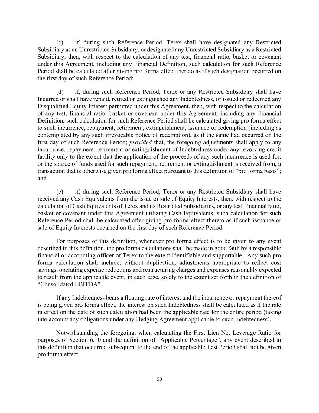 50 (c) if, during such Reference Period, Terex shall have designated any Restricted Subsidiary as an Unrestricted Subsidiary, or designated any Unrestricted Subsidiary as a Restricted Subsidiary, then, with respect to the calculation of any test, financial ratio, basket or covenant under this Agreement, including any Financial Definition, such calculation for such Reference Period shall be calculated after giving pro forma effect thereto as if such designation occurred on the first day of such Reference Period; (d) if, during such Reference Period, Terex or any Restricted Subsidiary shall have Incurred or shall have repaid, retired or extinguished any Indebtedness, or issued or redeemed any Disqualified Equity Interest permitted under this Agreement, then, with respect to the calculation of any test, financial ratio, basket or covenant under this Agreement, including any Financial Definition, such calculation for such Reference Period shall be calculated giving pro forma effect to such incurrence, repayment, retirement, extinguishment, issuance or redemption (including as contemplated by any such irrevocable notice of redemption), as if the same had occurred on the first day of such Reference Period; provided that, the foregoing adjustments shall apply to any incurrence, repayment, retirement or extinguishment of Indebtedness under any revolving credit facility only to the extent that the application of the proceeds of any such incurrence is used for, or the source of funds used for such repayment, retirement or extinguishment is received from, a transaction that is otherwise given pro forma effect pursuant to this definition of “pro forma basis”; and (e) if, during such Reference Period, Terex or any Restricted Subsidiary shall have received any Cash Equivalents from the issue or sale of Equity Interests, then, with respect to the calculation of Cash Equivalents of Terex and its Restricted Subsidiaries, or any test, financial ratio, basket or covenant under this Agreement utilizing Cash Equivalents, such calculation for such Reference Period shall be calculated after giving pro forma effect thereto as if such issuance or sale of Equity Interests occurred on the first day of such Reference Period. For purposes of this definition, whenever pro forma effect is to be given to any event described in this definition, the pro forma calculations shall be made in good faith by a responsible financial or accounting officer of Terex to the extent identifiable and supportable. Any such pro forma calculation shall include, without duplication, adjustments appropriate to reflect cost savings, operating expense reductions and restructuring charges and expenses reasonably expected to result from the applicable event, in each case, solely to the extent set forth in the definition of “Consolidated EBITDA”. If any Indebtedness bears a floating rate of interest and the incurrence or repayment thereof is being given pro forma effect, the interest on such Indebtedness shall be calculated as if the rate in effect on the date of such calculation had been the applicable rate for the entire period (taking into account any obligations under any Hedging Agreement applicable to such Indebtedness). Notwithstanding the foregoing, when calculating the First Lien Net Leverage Ratio for purposes of Section 6.10 and the definition of “Applicable Percentage”, any event described in this definition that occurred subsequent to the end of the applicable Test Period shall not be given pro forma effect.