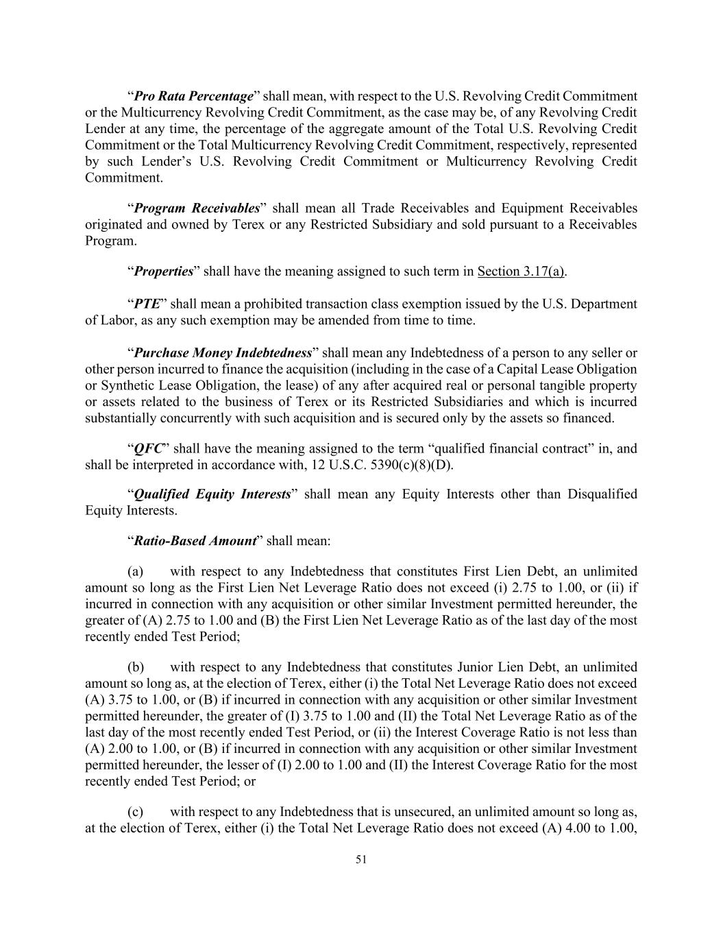 51 “Pro Rata Percentage” shall mean, with respect to the U.S. Revolving Credit Commitment or the Multicurrency Revolving Credit Commitment, as the case may be, of any Revolving Credit Lender at any time, the percentage of the aggregate amount of the Total U.S. Revolving Credit Commitment or the Total Multicurrency Revolving Credit Commitment, respectively, represented by such Lender’s U.S. Revolving Credit Commitment or Multicurrency Revolving Credit Commitment. “Program Receivables” shall mean all Trade Receivables and Equipment Receivables originated and owned by Terex or any Restricted Subsidiary and sold pursuant to a Receivables Program. “Properties” shall have the meaning assigned to such term in Section 3.17(a). “PTE” shall mean a prohibited transaction class exemption issued by the U.S. Department of Labor, as any such exemption may be amended from time to time. “Purchase Money Indebtedness” shall mean any Indebtedness of a person to any seller or other person incurred to finance the acquisition (including in the case of a Capital Lease Obligation or Synthetic Lease Obligation, the lease) of any after acquired real or personal tangible property or assets related to the business of Terex or its Restricted Subsidiaries and which is incurred substantially concurrently with such acquisition and is secured only by the assets so financed. “QFC” shall have the meaning assigned to the term “qualified financial contract” in, and shall be interpreted in accordance with, 12 U.S.C. 5390(c)(8)(D). “Qualified Equity Interests” shall mean any Equity Interests other than Disqualified Equity Interests. “Ratio-Based Amount” shall mean: (a) with respect to any Indebtedness that constitutes First Lien Debt, an unlimited amount so long as the First Lien Net Leverage Ratio does not exceed (i) 2.75 to 1.00, or (ii) if incurred in connection with any acquisition or other similar Investment permitted hereunder, the greater of (A) 2.75 to 1.00 and (B) the First Lien Net Leverage Ratio as of the last day of the most recently ended Test Period; (b) with respect to any Indebtedness that constitutes Junior Lien Debt, an unlimited amount so long as, at the election of Terex, either (i) the Total Net Leverage Ratio does not exceed (A) 3.75 to 1.00, or (B) if incurred in connection with any acquisition or other similar Investment permitted hereunder, the greater of (I) 3.75 to 1.00 and (II) the Total Net Leverage Ratio as of the last day of the most recently ended Test Period, or (ii) the Interest Coverage Ratio is not less than (A) 2.00 to 1.00, or (B) if incurred in connection with any acquisition or other similar Investment permitted hereunder, the lesser of (I) 2.00 to 1.00 and (II) the Interest Coverage Ratio for the most recently ended Test Period; or (c) with respect to any Indebtedness that is unsecured, an unlimited amount so long as, at the election of Terex, either (i) the Total Net Leverage Ratio does not exceed (A) 4.00 to 1.00,
