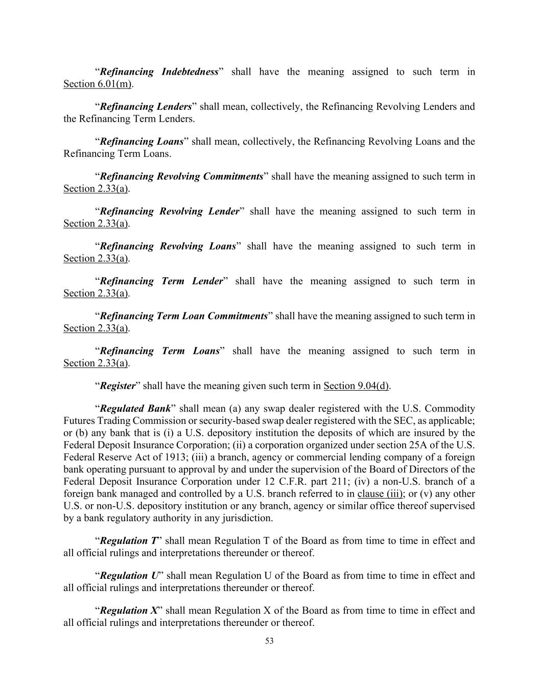 53 “Refinancing Indebtedness” shall have the meaning assigned to such term in Section 6.01(m). “Refinancing Lenders” shall mean, collectively, the Refinancing Revolving Lenders and the Refinancing Term Lenders. “Refinancing Loans” shall mean, collectively, the Refinancing Revolving Loans and the Refinancing Term Loans. “Refinancing Revolving Commitments” shall have the meaning assigned to such term in Section 2.33(a). “Refinancing Revolving Lender” shall have the meaning assigned to such term in Section 2.33(a). “Refinancing Revolving Loans” shall have the meaning assigned to such term in Section 2.33(a). “Refinancing Term Lender” shall have the meaning assigned to such term in Section 2.33(a). “Refinancing Term Loan Commitments” shall have the meaning assigned to such term in Section 2.33(a). “Refinancing Term Loans” shall have the meaning assigned to such term in Section 2.33(a). “Register” shall have the meaning given such term in Section 9.04(d). “Regulated Bank” shall mean (a) any swap dealer registered with the U.S. Commodity Futures Trading Commission or security-based swap dealer registered with the SEC, as applicable; or (b) any bank that is (i) a U.S. depository institution the deposits of which are insured by the Federal Deposit Insurance Corporation; (ii) a corporation organized under section 25A of the U.S. Federal Reserve Act of 1913; (iii) a branch, agency or commercial lending company of a foreign bank operating pursuant to approval by and under the supervision of the Board of Directors of the Federal Deposit Insurance Corporation under 12 C.F.R. part 211; (iv) a non-U.S. branch of a foreign bank managed and controlled by a U.S. branch referred to in clause (iii); or (v) any other U.S. or non-U.S. depository institution or any branch, agency or similar office thereof supervised by a bank regulatory authority in any jurisdiction. “Regulation T” shall mean Regulation T of the Board as from time to time in effect and all official rulings and interpretations thereunder or thereof. “Regulation U” shall mean Regulation U of the Board as from time to time in effect and all official rulings and interpretations thereunder or thereof. “Regulation X” shall mean Regulation X of the Board as from time to time in effect and all official rulings and interpretations thereunder or thereof.