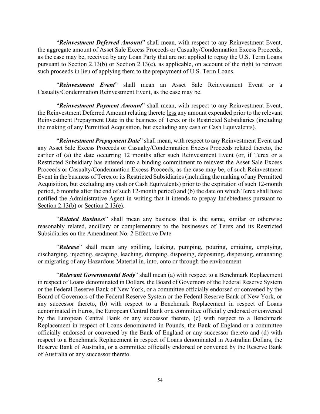 54 “Reinvestment Deferred Amount” shall mean, with respect to any Reinvestment Event, the aggregate amount of Asset Sale Excess Proceeds or Casualty/Condemnation Excess Proceeds, as the case may be, received by any Loan Party that are not applied to repay the U.S. Term Loans pursuant to Section 2.13(b) or Section 2.13(e), as applicable, on account of the right to reinvest such proceeds in lieu of applying them to the prepayment of U.S. Term Loans. “Reinvestment Event” shall mean an Asset Sale Reinvestment Event or a Casualty/Condemnation Reinvestment Event, as the case may be. “Reinvestment Payment Amount” shall mean, with respect to any Reinvestment Event, the Reinvestment Deferred Amount relating thereto less any amount expended prior to the relevant Reinvestment Prepayment Date in the business of Terex or its Restricted Subsidiaries (including the making of any Permitted Acquisition, but excluding any cash or Cash Equivalents). “Reinvestment Prepayment Date” shall mean, with respect to any Reinvestment Event and any Asset Sale Excess Proceeds or Casualty/Condemnation Excess Proceeds related thereto, the earlier of (a) the date occurring 12 months after such Reinvestment Event (or, if Terex or a Restricted Subsidiary has entered into a binding commitment to reinvest the Asset Sale Excess Proceeds or Casualty/Condemnation Excess Proceeds, as the case may be, of such Reinvestment Event in the business of Terex or its Restricted Subsidiaries (including the making of any Permitted Acquisition, but excluding any cash or Cash Equivalents) prior to the expiration of such 12-month period, 6 months after the end of such 12-month period) and (b) the date on which Terex shall have notified the Administrative Agent in writing that it intends to prepay Indebtedness pursuant to Section 2.13(b) or Section 2.13(e). “Related Business” shall mean any business that is the same, similar or otherwise reasonably related, ancillary or complementary to the businesses of Terex and its Restricted Subsidiaries on the Amendment No. 2 Effective Date. “Release” shall mean any spilling, leaking, pumping, pouring, emitting, emptying, discharging, injecting, escaping, leaching, dumping, disposing, depositing, dispersing, emanating or migrating of any Hazardous Material in, into, onto or through the environment. “Relevant Governmental Body” shall mean (a) with respect to a Benchmark Replacement in respect of Loans denominated in Dollars, the Board of Governors of the Federal Reserve System or the Federal Reserve Bank of New York, or a committee officially endorsed or convened by the Board of Governors of the Federal Reserve System or the Federal Reserve Bank of New York, or any successor thereto, (b) with respect to a Benchmark Replacement in respect of Loans denominated in Euros, the European Central Bank or a committee officially endorsed or convened by the European Central Bank or any successor thereto, (c) with respect to a Benchmark Replacement in respect of Loans denominated in Pounds, the Bank of England or a committee officially endorsed or convened by the Bank of England or any successor thereto and (d) with respect to a Benchmark Replacement in respect of Loans denominated in Australian Dollars, the Reserve Bank of Australia, or a committee officially endorsed or convened by the Reserve Bank of Australia or any successor thereto.