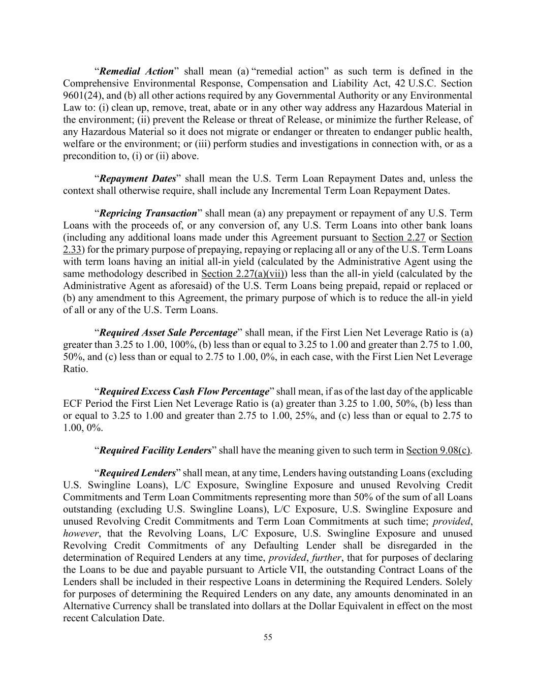 55 “Remedial Action” shall mean (a) “remedial action” as such term is defined in the Comprehensive Environmental Response, Compensation and Liability Act, 42 U.S.C. Section 9601(24), and (b) all other actions required by any Governmental Authority or any Environmental Law to: (i) clean up, remove, treat, abate or in any other way address any Hazardous Material in the environment; (ii) prevent the Release or threat of Release, or minimize the further Release, of any Hazardous Material so it does not migrate or endanger or threaten to endanger public health, welfare or the environment; or (iii) perform studies and investigations in connection with, or as a precondition to, (i) or (ii) above. “Repayment Dates” shall mean the U.S. Term Loan Repayment Dates and, unless the context shall otherwise require, shall include any Incremental Term Loan Repayment Dates. “Repricing Transaction” shall mean (a) any prepayment or repayment of any U.S. Term Loans with the proceeds of, or any conversion of, any U.S. Term Loans into other bank loans (including any additional loans made under this Agreement pursuant to Section 2.27 or Section 2.33) for the primary purpose of prepaying, repaying or replacing all or any of the U.S. Term Loans with term loans having an initial all-in yield (calculated by the Administrative Agent using the same methodology described in Section 2.27(a)(vii)) less than the all-in yield (calculated by the Administrative Agent as aforesaid) of the U.S. Term Loans being prepaid, repaid or replaced or (b) any amendment to this Agreement, the primary purpose of which is to reduce the all-in yield of all or any of the U.S. Term Loans. “Required Asset Sale Percentage” shall mean, if the First Lien Net Leverage Ratio is (a) greater than 3.25 to 1.00, 100%, (b) less than or equal to 3.25 to 1.00 and greater than 2.75 to 1.00, 50%, and (c) less than or equal to 2.75 to 1.00, 0%, in each case, with the First Lien Net Leverage Ratio. “Required Excess Cash Flow Percentage” shall mean, if as of the last day of the applicable ECF Period the First Lien Net Leverage Ratio is (a) greater than 3.25 to 1.00, 50%, (b) less than or equal to 3.25 to 1.00 and greater than 2.75 to 1.00, 25%, and (c) less than or equal to 2.75 to 1.00, 0%. “Required Facility Lenders” shall have the meaning given to such term in Section 9.08(c). “Required Lenders” shall mean, at any time, Lenders having outstanding Loans (excluding U.S. Swingline Loans), L/C Exposure, Swingline Exposure and unused Revolving Credit Commitments and Term Loan Commitments representing more than 50% of the sum of all Loans outstanding (excluding U.S. Swingline Loans), L/C Exposure, U.S. Swingline Exposure and unused Revolving Credit Commitments and Term Loan Commitments at such time; provided, however, that the Revolving Loans, L/C Exposure, U.S. Swingline Exposure and unused Revolving Credit Commitments of any Defaulting Lender shall be disregarded in the determination of Required Lenders at any time, provided, further, that for purposes of declaring the Loans to be due and payable pursuant to Article VII, the outstanding Contract Loans of the Lenders shall be included in their respective Loans in determining the Required Lenders. Solely for purposes of determining the Required Lenders on any date, any amounts denominated in an Alternative Currency shall be translated into dollars at the Dollar Equivalent in effect on the most recent Calculation Date.