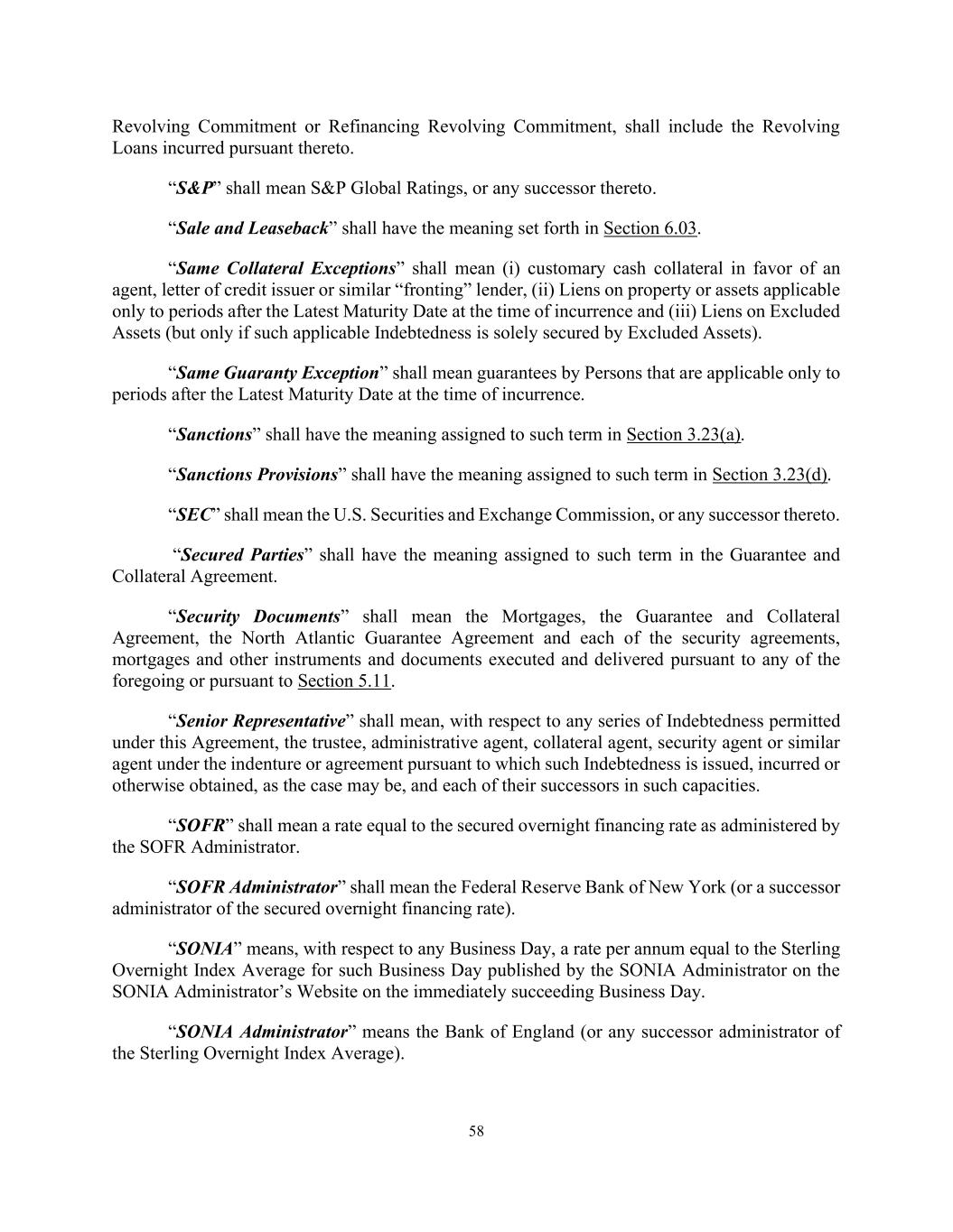 58 Revolving Commitment or Refinancing Revolving Commitment, shall include the Revolving Loans incurred pursuant thereto. “S&P” shall mean S&P Global Ratings, or any successor thereto. “Sale and Leaseback” shall have the meaning set forth in Section 6.03. “Same Collateral Exceptions” shall mean (i) customary cash collateral in favor of an agent, letter of credit issuer or similar “fronting” lender, (ii) Liens on property or assets applicable only to periods after the Latest Maturity Date at the time of incurrence and (iii) Liens on Excluded Assets (but only if such applicable Indebtedness is solely secured by Excluded Assets). “Same Guaranty Exception” shall mean guarantees by Persons that are applicable only to periods after the Latest Maturity Date at the time of incurrence. “Sanctions” shall have the meaning assigned to such term in Section 3.23(a). “Sanctions Provisions” shall have the meaning assigned to such term in Section 3.23(d). “SEC” shall mean the U.S. Securities and Exchange Commission, or any successor thereto. “Secured Parties” shall have the meaning assigned to such term in the Guarantee and Collateral Agreement. “Security Documents” shall mean the Mortgages, the Guarantee and Collateral Agreement, the North Atlantic Guarantee Agreement and each of the security agreements, mortgages and other instruments and documents executed and delivered pursuant to any of the foregoing or pursuant to Section 5.11. “Senior Representative” shall mean, with respect to any series of Indebtedness permitted under this Agreement, the trustee, administrative agent, collateral agent, security agent or similar agent under the indenture or agreement pursuant to which such Indebtedness is issued, incurred or otherwise obtained, as the case may be, and each of their successors in such capacities. “SOFR” shall mean a rate equal to the secured overnight financing rate as administered by the SOFR Administrator. “SOFR Administrator” shall mean the Federal Reserve Bank of New York (or a successor administrator of the secured overnight financing rate). “SONIA” means, with respect to any Business Day, a rate per annum equal to the Sterling Overnight Index Average for such Business Day published by the SONIA Administrator on the SONIA Administrator’s Website on the immediately succeeding Business Day. “SONIA Administrator” means the Bank of England (or any successor administrator of the Sterling Overnight Index Average).