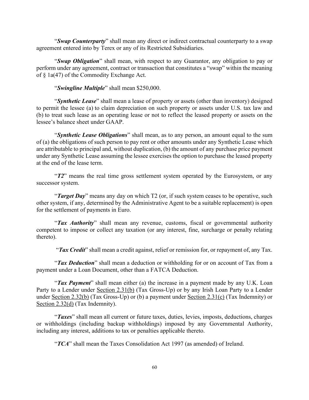 60 “Swap Counterparty” shall mean any direct or indirect contractual counterparty to a swap agreement entered into by Terex or any of its Restricted Subsidiaries. “Swap Obligation” shall mean, with respect to any Guarantor, any obligation to pay or perform under any agreement, contract or transaction that constitutes a “swap” within the meaning of § 1a(47) of the Commodity Exchange Act. “Swingline Multiple” shall mean $250,000. “Synthetic Lease” shall mean a lease of property or assets (other than inventory) designed to permit the lessee (a) to claim depreciation on such property or assets under U.S. tax law and (b) to treat such lease as an operating lease or not to reflect the leased property or assets on the lessee’s balance sheet under GAAP. “Synthetic Lease Obligations” shall mean, as to any person, an amount equal to the sum of (a) the obligations of such person to pay rent or other amounts under any Synthetic Lease which are attributable to principal and, without duplication, (b) the amount of any purchase price payment under any Synthetic Lease assuming the lessee exercises the option to purchase the leased property at the end of the lease term. “T2” means the real time gross settlement system operated by the Eurosystem, or any successor system. “Target Day” means any day on which T2 (or, if such system ceases to be operative, such other system, if any, determined by the Administrative Agent to be a suitable replacement) is open for the settlement of payments in Euro. “Tax Authority” shall mean any revenue, customs, fiscal or governmental authority competent to impose or collect any taxation (or any interest, fine, surcharge or penalty relating thereto). “Tax Credit” shall mean a credit against, relief or remission for, or repayment of, any Tax. “Tax Deduction” shall mean a deduction or withholding for or on account of Tax from a payment under a Loan Document, other than a FATCA Deduction. “Tax Payment” shall mean either (a) the increase in a payment made by any U.K. Loan Party to a Lender under Section 2.31(b) (Tax Gross-Up) or by any Irish Loan Party to a Lender under Section 2.32(b) (Tax Gross-Up) or (b) a payment under Section 2.31(c) (Tax Indemnity) or Section 2.32(d) (Tax Indemnity). “Taxes” shall mean all current or future taxes, duties, levies, imposts, deductions, charges or withholdings (including backup withholdings) imposed by any Governmental Authority, including any interest, additions to tax or penalties applicable thereto. “TCA” shall mean the Taxes Consolidation Act 1997 (as amended) of Ireland.
