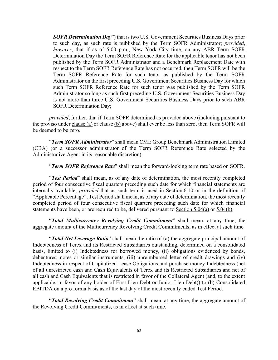 62 SOFR Determination Day”) that is two U.S. Government Securities Business Days prior to such day, as such rate is published by the Term SOFR Administrator; provided, however, that if as of 5:00 p.m., New York City time, on any ABR Term SOFR Determination Day the Term SOFR Reference Rate for the applicable tenor has not been published by the Term SOFR Administrator and a Benchmark Replacement Date with respect to the Term SOFR Reference Rate has not occurred, then Term SOFR will be the Term SOFR Reference Rate for such tenor as published by the Term SOFR Administrator on the first preceding U.S. Government Securities Business Day for which such Term SOFR Reference Rate for such tenor was published by the Term SOFR Administrator so long as such first preceding U.S. Government Securities Business Day is not more than three U.S. Government Securities Business Days prior to such ABR SOFR Determination Day; provided, further, that if Term SOFR determined as provided above (including pursuant to the proviso under clause (a) or clause (b) above) shall ever be less than zero, then Term SOFR will be deemed to be zero. “Term SOFR Administrator” shall mean CME Group Benchmark Administration Limited (CBA) (or a successor administrator of the Term SOFR Reference Rate selected by the Administrative Agent in its reasonable discretion). “Term SOFR Reference Rate” shall mean the forward-looking term rate based on SOFR. “Test Period” shall mean, as of any date of determination, the most recently completed period of four consecutive fiscal quarters preceding such date for which financial statements are internally available; provided that as such term is used in Section 6.10 or in the definition of “Applicable Percentage”, Test Period shall mean, as of any date of determination, the most recently completed period of four consecutive fiscal quarters preceding such date for which financial statements have been, or are required to be, delivered pursuant to Section 5.04(a) or 5.04(b). “Total Multicurrency Revolving Credit Commitment” shall mean, at any time, the aggregate amount of the Multicurrency Revolving Credit Commitments, as in effect at such time. “Total Net Leverage Ratio” shall mean the ratio of (a) the aggregate principal amount of Indebtedness of Terex and its Restricted Subsidiaries outstanding, determined on a consolidated basis, limited to (i) Indebtedness for borrowed money, (ii) obligations evidenced by bonds, debentures, notes or similar instruments, (iii) unreimbursed letter of credit drawings and (iv) Indebtedness in respect of Capitalized Lease Obligations and purchase money Indebtedness (net of all unrestricted cash and Cash Equivalents of Terex and its Restricted Subsidiaries and net of all cash and Cash Equivalents that is restricted in favor of the Collateral Agent (and, to the extent applicable, in favor of any holder of First Lien Debt or Junior Lien Debt)) to (b) Consolidated EBITDA on a pro forma basis as of the last day of the most recently ended Test Period. “Total Revolving Credit Commitment” shall mean, at any time, the aggregate amount of the Revolving Credit Commitments, as in effect at such time.