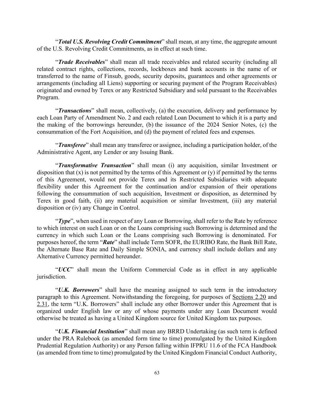 63 “Total U.S. Revolving Credit Commitment” shall mean, at any time, the aggregate amount of the U.S. Revolving Credit Commitments, as in effect at such time. “Trade Receivables” shall mean all trade receivables and related security (including all related contract rights, collections, records, lockboxes and bank accounts in the name of or transferred to the name of Finsub, goods, security deposits, guarantees and other agreements or arrangements (including all Liens) supporting or securing payment of the Program Receivables) originated and owned by Terex or any Restricted Subsidiary and sold pursuant to the Receivables Program. “Transactions” shall mean, collectively, (a) the execution, delivery and performance by each Loan Party of Amendment No. 2 and each related Loan Document to which it is a party and the making of the borrowings hereunder, (b) the issuance of the 2024 Senior Notes, (c) the consummation of the Fort Acquisition, and (d) the payment of related fees and expenses. “Transferee” shall mean any transferee or assignee, including a participation holder, of the Administrative Agent, any Lender or any Issuing Bank. “Transformative Transaction” shall mean (i) any acquisition, similar Investment or disposition that (x) is not permitted by the terms of this Agreement or (y) if permitted by the terms of this Agreement, would not provide Terex and its Restricted Subsidiaries with adequate flexibility under this Agreement for the continuation and/or expansion of their operations following the consummation of such acquisition, Investment or disposition, as determined by Terex in good faith, (ii) any material acquisition or similar Investment, (iii) any material disposition or (iv) any Change in Control. “Type”, when used in respect of any Loan or Borrowing, shall refer to the Rate by reference to which interest on such Loan or on the Loans comprising such Borrowing is determined and the currency in which such Loan or the Loans comprising such Borrowing is denominated. For purposes hereof, the term “Rate” shall include Term SOFR, the EURIBO Rate, the Bank Bill Rate, the Alternate Base Rate and Daily Simple SONIA, and currency shall include dollars and any Alternative Currency permitted hereunder. “UCC” shall mean the Uniform Commercial Code as in effect in any applicable jurisdiction. “U.K. Borrowers” shall have the meaning assigned to such term in the introductory paragraph to this Agreement. Notwithstanding the foregoing, for purposes of Sections 2.20 and 2.31, the term “U.K. Borrowers” shall include any other Borrower under this Agreement that is organized under English law or any of whose payments under any Loan Document would otherwise be treated as having a United Kingdom source for United Kingdom tax purposes. “U.K. Financial Institution” shall mean any BRRD Undertaking (as such term is defined under the PRA Rulebook (as amended form time to time) promulgated by the United Kingdom Prudential Regulation Authority) or any Person falling within IFPRU 11.6 of the FCA Handbook (as amended from time to time) promulgated by the United Kingdom Financial Conduct Authority,