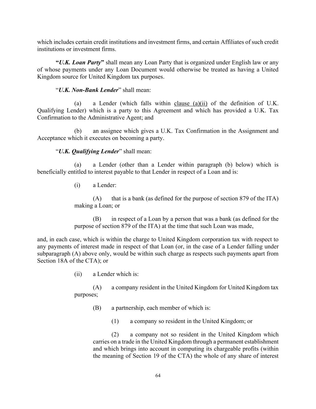 64 which includes certain credit institutions and investment firms, and certain Affiliates of such credit institutions or investment firms. “U.K. Loan Party” shall mean any Loan Party that is organized under English law or any of whose payments under any Loan Document would otherwise be treated as having a United Kingdom source for United Kingdom tax purposes. “U.K. Non-Bank Lender” shall mean: (a) a Lender (which falls within clause (a)(ii) of the definition of U.K. Qualifying Lender) which is a party to this Agreement and which has provided a U.K. Tax Confirmation to the Administrative Agent; and (b) an assignee which gives a U.K. Tax Confirmation in the Assignment and Acceptance which it executes on becoming a party. “U.K. Qualifying Lender” shall mean: (a) a Lender (other than a Lender within paragraph (b) below) which is beneficially entitled to interest payable to that Lender in respect of a Loan and is: (i) a Lender: (A) that is a bank (as defined for the purpose of section 879 of the ITA) making a Loan; or (B) in respect of a Loan by a person that was a bank (as defined for the purpose of section 879 of the ITA) at the time that such Loan was made, and, in each case, which is within the charge to United Kingdom corporation tax with respect to any payments of interest made in respect of that Loan (or, in the case of a Lender falling under subparagraph (A) above only, would be within such charge as respects such payments apart from Section 18A of the CTA); or (ii) a Lender which is: (A) a company resident in the United Kingdom for United Kingdom tax purposes; (B) a partnership, each member of which is: (1) a company so resident in the United Kingdom; or (2) a company not so resident in the United Kingdom which carries on a trade in the United Kingdom through a permanent establishment and which brings into account in computing its chargeable profits (within the meaning of Section 19 of the CTA) the whole of any share of interest