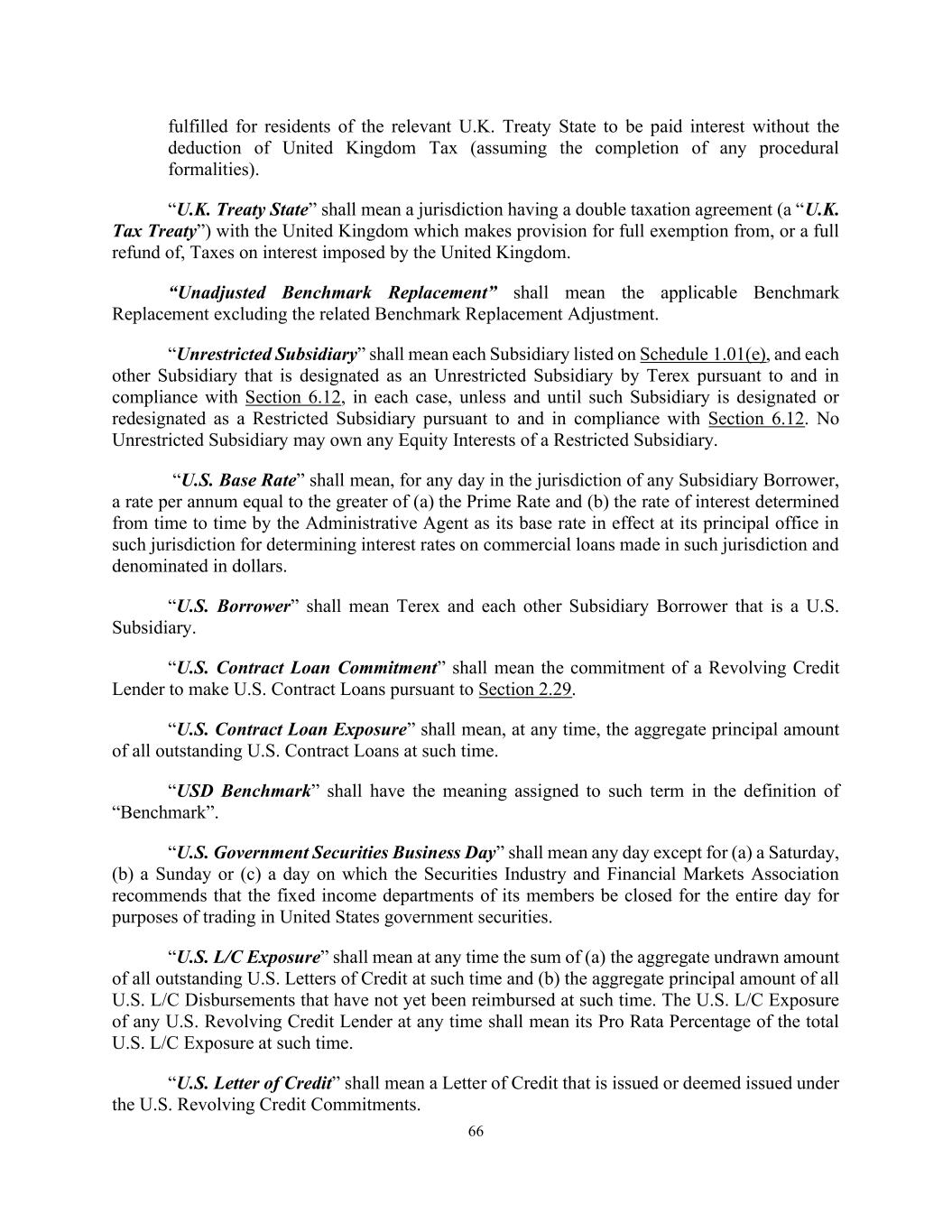 66 fulfilled for residents of the relevant U.K. Treaty State to be paid interest without the deduction of United Kingdom Tax (assuming the completion of any procedural formalities). “U.K. Treaty State” shall mean a jurisdiction having a double taxation agreement (a “U.K. Tax Treaty”) with the United Kingdom which makes provision for full exemption from, or a full refund of, Taxes on interest imposed by the United Kingdom. “Unadjusted Benchmark Replacement” shall mean the applicable Benchmark Replacement excluding the related Benchmark Replacement Adjustment. “Unrestricted Subsidiary” shall mean each Subsidiary listed on Schedule 1.01(e), and each other Subsidiary that is designated as an Unrestricted Subsidiary by Terex pursuant to and in compliance with Section 6.12, in each case, unless and until such Subsidiary is designated or redesignated as a Restricted Subsidiary pursuant to and in compliance with Section 6.12. No Unrestricted Subsidiary may own any Equity Interests of a Restricted Subsidiary. “U.S. Base Rate” shall mean, for any day in the jurisdiction of any Subsidiary Borrower, a rate per annum equal to the greater of (a) the Prime Rate and (b) the rate of interest determined from time to time by the Administrative Agent as its base rate in effect at its principal office in such jurisdiction for determining interest rates on commercial loans made in such jurisdiction and denominated in dollars. “U.S. Borrower” shall mean Terex and each other Subsidiary Borrower that is a U.S. Subsidiary. “U.S. Contract Loan Commitment” shall mean the commitment of a Revolving Credit Lender to make U.S. Contract Loans pursuant to Section 2.29. “U.S. Contract Loan Exposure” shall mean, at any time, the aggregate principal amount of all outstanding U.S. Contract Loans at such time. “USD Benchmark” shall have the meaning assigned to such term in the definition of “Benchmark”. “U.S. Government Securities Business Day” shall mean any day except for (a) a Saturday, (b) a Sunday or (c) a day on which the Securities Industry and Financial Markets Association recommends that the fixed income departments of its members be closed for the entire day for purposes of trading in United States government securities. “U.S. L/C Exposure” shall mean at any time the sum of (a) the aggregate undrawn amount of all outstanding U.S. Letters of Credit at such time and (b) the aggregate principal amount of all U.S. L/C Disbursements that have not yet been reimbursed at such time. The U.S. L/C Exposure of any U.S. Revolving Credit Lender at any time shall mean its Pro Rata Percentage of the total U.S. L/C Exposure at such time. “U.S. Letter of Credit” shall mean a Letter of Credit that is issued or deemed issued under the U.S. Revolving Credit Commitments.