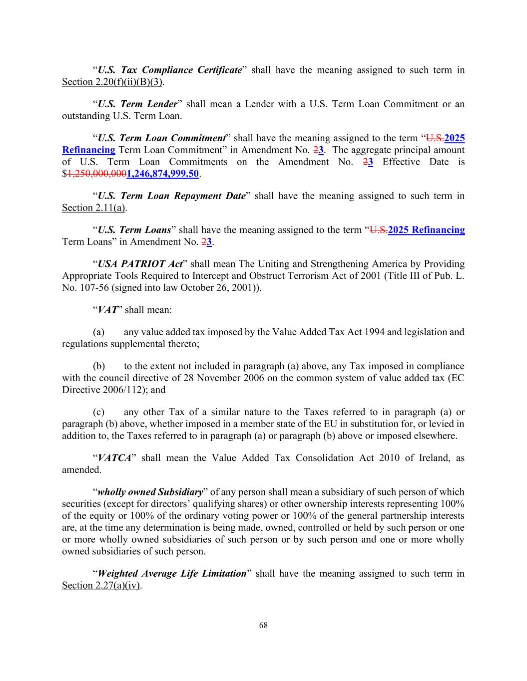 68 “U.S. Tax Compliance Certificate” shall have the meaning assigned to such term in Section 2.20(f)(ii)(B)(3). “U.S. Term Lender” shall mean a Lender with a U.S. Term Loan Commitment or an outstanding U.S. Term Loan. “U.S. Term Loan Commitment” shall have the meaning assigned to the term “U.S.2025 Refinancing Term Loan Commitment” in Amendment No. 23. The aggregate principal amount of U.S. Term Loan Commitments on the Amendment No. 23 Effective Date is $1,250,000,0001,246,874,999.50. “U.S. Term Loan Repayment Date” shall have the meaning assigned to such term in Section 2.11(a). “U.S. Term Loans” shall have the meaning assigned to the term “U.S.2025 Refinancing Term Loans” in Amendment No. 23. “USA PATRIOT Act” shall mean The Uniting and Strengthening America by Providing Appropriate Tools Required to Intercept and Obstruct Terrorism Act of 2001 (Title III of Pub. L. No. 107-56 (signed into law October 26, 2001)). “VAT” shall mean: (a) any value added tax imposed by the Value Added Tax Act 1994 and legislation and regulations supplemental thereto; (b) to the extent not included in paragraph (a) above, any Tax imposed in compliance with the council directive of 28 November 2006 on the common system of value added tax (EC Directive 2006/112); and (c) any other Tax of a similar nature to the Taxes referred to in paragraph (a) or paragraph (b) above, whether imposed in a member state of the EU in substitution for, or levied in addition to, the Taxes referred to in paragraph (a) or paragraph (b) above or imposed elsewhere. “VATCA” shall mean the Value Added Tax Consolidation Act 2010 of Ireland, as amended. “wholly owned Subsidiary” of any person shall mean a subsidiary of such person of which securities (except for directors’ qualifying shares) or other ownership interests representing 100% of the equity or 100% of the ordinary voting power or 100% of the general partnership interests are, at the time any determination is being made, owned, controlled or held by such person or one or more wholly owned subsidiaries of such person or by such person and one or more wholly owned subsidiaries of such person. “Weighted Average Life Limitation” shall have the meaning assigned to such term in Section 2.27(a)(iv).