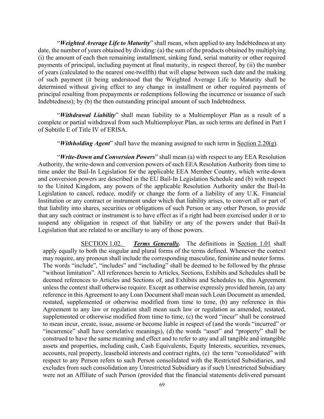 69 “Weighted Average Life to Maturity” shall mean, when applied to any Indebtedness at any date, the number of years obtained by dividing: (a) the sum of the products obtained by multiplying (i) the amount of each then remaining installment, sinking fund, serial maturity or other required payments of principal, including payment at final maturity, in respect thereof, by (ii) the number of years (calculated to the nearest one-twelfth) that will elapse between such date and the making of such payment (it being understood that the Weighted Average Life to Maturity shall be determined without giving effect to any change in installment or other required payments of principal resulting from prepayments or redemptions following the incurrence or issuance of such Indebtedness); by (b) the then outstanding principal amount of such Indebtedness. “Withdrawal Liability” shall mean liability to a Multiemployer Plan as a result of a complete or partial withdrawal from such Multiemployer Plan, as such terms are defined in Part I of Subtitle E of Title IV of ERISA. “Withholding Agent” shall have the meaning assigned to such term in Section 2.20(g). “Write-Down and Conversion Powers” shall mean (a) with respect to any EEA Resolution Authority, the write-down and conversion powers of such EEA Resolution Authority from time to time under the Bail-In Legislation for the applicable EEA Member Country, which write-down and conversion powers are described in the EU Bail-In Legislation Schedule and (b) with respect to the United Kingdom, any powers of the applicable Resolution Authority under the Bail-In Legislation to cancel, reduce, modify or change the form of a liability of any U.K. Financial Institution or any contract or instrument under which that liability arises, to convert all or part of that liability into shares, securities or obligations of such Person or any other Person, to provide that any such contract or instrument is to have effect as if a right had been exercised under it or to suspend any obligation in respect of that liability or any of the powers under that Bail-In Legislation that are related to or ancillary to any of those powers. SECTION 1.02. Terms Generally. The definitions in Section 1.01 shall apply equally to both the singular and plural forms of the terms defined. Whenever the context may require, any pronoun shall include the corresponding masculine, feminine and neuter forms. The words “include”, “includes” and “including” shall be deemed to be followed by the phrase “without limitation”. All references herein to Articles, Sections, Exhibits and Schedules shall be deemed references to Articles and Sections of, and Exhibits and Schedules to, this Agreement unless the context shall otherwise require. Except as otherwise expressly provided herein, (a) any reference in this Agreement to any Loan Document shall mean such Loan Document as amended, restated, supplemented or otherwise modified from time to time, (b) any reference in this Agreement to any law or regulation shall mean such law or regulation as amended, restated, supplemented or otherwise modified from time to time, (c) the word “incur” shall be construed to mean incur, create, issue, assume or become liable in respect of (and the words “incurred” or “incurrence” shall have correlative meanings), (d) the words “asset” and “property” shall be construed to have the same meaning and effect and to refer to any and all tangible and intangible assets and properties, including cash, Cash Equivalents, Equity Interests, securities, revenues, accounts, real property, leasehold interests and contract rights, (e) the term “consolidated” with respect to any Person refers to such Person consolidated with the Restricted Subsidiaries, and excludes from such consolidation any Unrestricted Subsidiary as if such Unrestricted Subsidiary were not an Affiliate of such Person (provided that the financial statements delivered pursuant